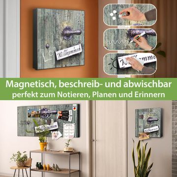 Bringe Ordnung und Eleganz in deinen Eingangsbereich mit dem banjado Schlüsselkasten Motiv Motiv Willkommen. Die moderne Schlüsselbox kombiniert funktionales Design mit hochwertiger Verarbeitung und wird so zu einem echten Hingucker in Flur, Büro oder Ferienwohnung. ✅ Stilvolle Schlüsselaufbewahrung mit Motiv Motiv Willkommen Der Design-Schlüsselkasten Motiv Motiv Willkommen bietet Platz für bis zu 32 Schlüssel, die auf 4 stabilen Reihen mit je 8 Haken übersichtlich verstaut werden. Mit seinen kompakten Maßen von 30 x 30 x 5 cm passt die Schlüsselbox perfekt auch in kleinere Räume. Der schwarz lackierte Stahlkorpus mit rechts angeschlagenem Türscharnier harmoniert mit gedruckten Folie auf der Front und fügt sich nahtlos in jedes Wohnambiente ein. Ob als Schlüsselorganizer für Zuhause oder als praktische Lösung für Büros, Praxen und Gewerbe, der banjado Schlüsselkasten sorgt für Ordnung und Übersicht. Dank der magnetischen, mit Kreidestiften beschreibbaren Folie auf der Front kannst du Notizen anheften oder Termine direkt auf der Oberfläche festhalten. Die Schlüsselbox Motiv Motiv Willkommen zur Wandmontage wird inklusive Befestigungsmaterial geliefert und ist schnell angebracht. So hast du deine Schlüssel jederzeit griffbereit und zugleich stilvoll verstaut. Mit diesem banjado Schlüsselkasten Motiv Motiv Willkommen kombinierst du praktische Aufbewahrung mit stilvollem Wohndesign. Ob privat oder geschäftlich, die Schlüsselbox sorgt für mehr Ordnung, Übersicht und ein wohnliches Ambiente.Vorteile im Überblick