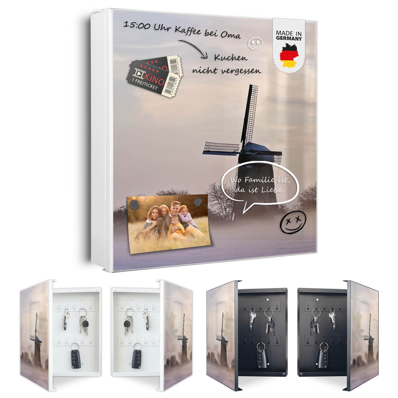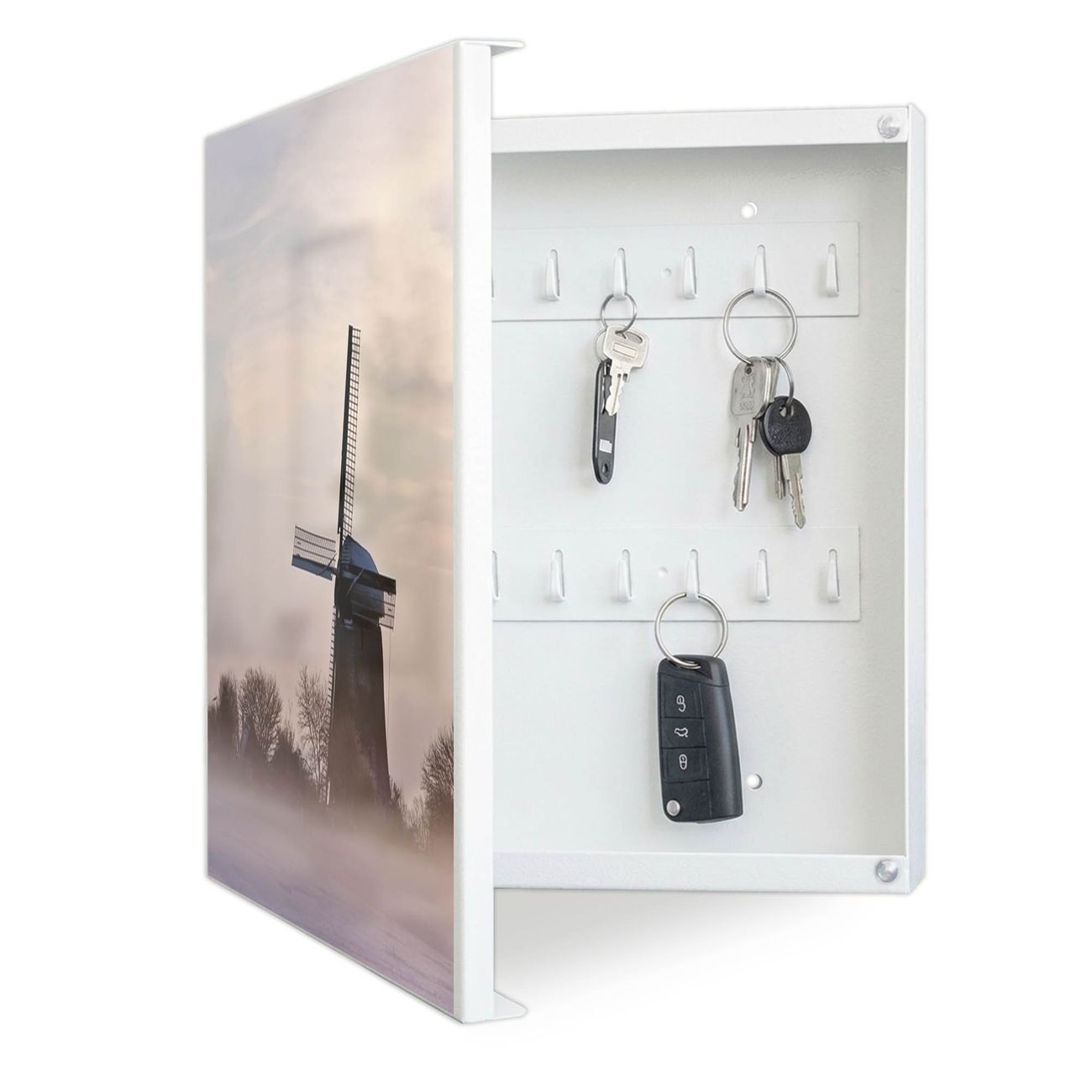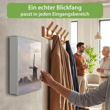 Bringe Ordnung und Eleganz in deinen Eingangsbereich mit dem banjado Schlüsselkasten Motiv Motiv Windmühle im Winter. Die moderne Schlüsselbox kombiniert funktionales Design mit hochwertiger Verarbeitung und wird so zu einem echten Hingucker in Flur, Büro oder Ferienwohnung. ✅ Stilvolle Schlüsselaufbewahrung mit Motiv Motiv Windmühle im Winter Der Design-Schlüsselkasten Motiv Motiv Windmühle im Winter bietet Platz für bis zu 32 Schlüssel, die auf 4 stabilen Reihen mit je 8 Haken übersichtlich verstaut werden. Mit seinen kompakten Maßen von 30 x 30 x 5 cm passt die Schlüsselbox perfekt auch in kleinere Räume. Der weiß lackierte Stahlkorpus mit links angeschlagenem Türscharnier harmoniert mit gedruckten Folie auf der Front und fügt sich nahtlos in jedes Wohnambiente ein. Ob als Schlüsselorganizer für Zuhause oder als praktische Lösung für Büros, Praxen und Gewerbe, der banjado Schlüsselkasten sorgt für Ordnung und Übersicht. Dank der magnetischen, mit Kreidestiften beschreibbaren Folie auf der Front kannst du Notizen anheften oder Termine direkt auf der Oberfläche festhalten. Die Schlüsselbox Motiv Motiv Windmühle im Winter zur Wandmontage wird inklusive Befestigungsmaterial geliefert und ist schnell angebracht. So hast du deine Schlüssel jederzeit griffbereit und zugleich stilvoll verstaut. Mit diesem banjado Schlüsselkasten Motiv Motiv Windmühle im Winter kombinierst du praktische Aufbewahrung mit stilvollem Wohndesign. Ob privat oder geschäftlich, die Schlüsselbox sorgt für mehr Ordnung, Übersicht und ein wohnliches Ambiente.Vorteile im Überblick