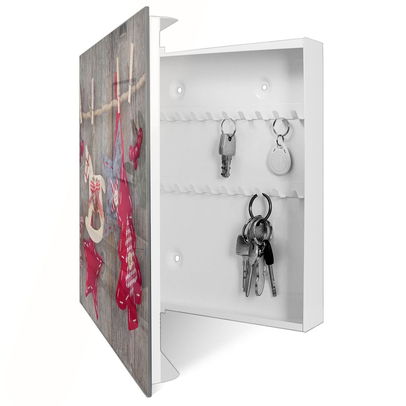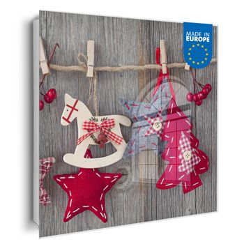 Bringe Ordnung und Eleganz in deinen Eingangsbereich mit dem banjado Schlüsselkasten Motiv Motiv Winterdekoration. Die moderne Schlüsselbox kombiniert funktionales Design mit hochwertiger Verarbeitung und wird so zu einem echten Hingucker in Flur, Büro oder Ferienwohnung. ✅ Stilvolle Schlüsselaufbewahrung mit Glasfront im Motiv Motiv Winterdekoration Der Design-Schlüsselkasten Motiv Motiv Winterdekoration bietet Platz für bis zu 50 Schlüssel, die auf 5 stabilen Reihen mit je 10 Haken übersichtlich verstaut werden. Mit seinen kompakten Maßen von 30 x 30 x 5 cm passt die Schlüsselbox perfekt auch in kleinere Räume. Der weiß lackierte Stahlkorpus mit rechts angeschlagenem Türscharnier harmoniert mit der Glasfront und fügt sich nahtlos in jedes Wohnambiente ein. Ob als Schlüsselorganizer für Zuhause oder als praktische Lösung für Büros, Praxen und Gewerbe, der banjado Schlüsselkasten sorgt für Ordnung und Übersicht. Dank der magnetischen, mit Kreidestiften beschreibbaren Glasfront kannst du Notizen anheften oder Termine direkt auf der Oberfläche festhalten. Die Schlüsselbox Motiv Motiv Winterdekoration zur Wandmontage wird inklusive Befestigungsmaterial geliefert und ist schnell angebracht. So hast du deine Schlüssel jederzeit griffbereit und zugleich stilvoll verstaut. Mit diesem banjado Schlüsselkasten Motiv Motiv Winterdekoration kombinierst du praktische Aufbewahrung mit stilvollem Wohndesign. Ob privat oder geschäftlich, die Schlüsselbox sorgt für mehr Ordnung, Übersicht und ein wohnliches Ambiente.Vorteile im Überblick