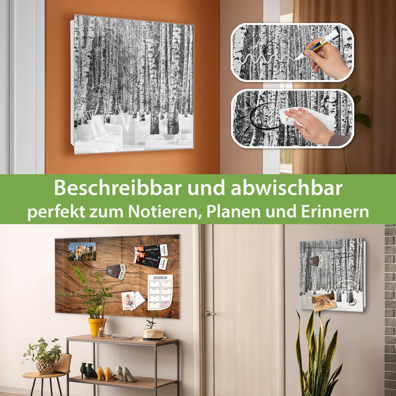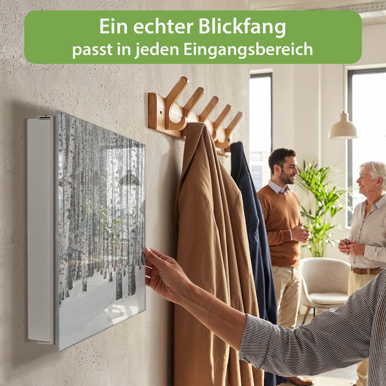 Bringe Ordnung und Eleganz in deinen Eingangsbereich mit dem banjado Schlüsselkasten Motiv Motiv Winterlicher Birkenwald. Die moderne Schlüsselbox kombiniert funktionales Design mit hochwertiger Verarbeitung und wird so zu einem echten Hingucker in Flur, Büro oder Ferienwohnung. ✅ Stilvolle Schlüsselaufbewahrung mit Glasfront im Motiv Motiv Winterlicher Birkenwald Der Design-Schlüsselkasten Motiv Motiv Winterlicher Birkenwald bietet Platz für bis zu 50 Schlüssel, die auf 5 stabilen Reihen mit je 10 Haken übersichtlich verstaut werden. Mit seinen kompakten Maßen von 30 x 30 x 5 cm passt die Schlüsselbox perfekt auch in kleinere Räume. Der weiß lackierte Stahlkorpus mit rechts angeschlagenem Türscharnier harmoniert mit der Glasfront und fügt sich nahtlos in jedes Wohnambiente ein. Ob als Schlüsselorganizer für Zuhause oder als praktische Lösung für Büros, Praxen und Gewerbe, der banjado Schlüsselkasten sorgt für Ordnung und Übersicht. Dank der magnetischen, mit Kreidestiften beschreibbaren Glasfront kannst du Notizen anheften oder Termine direkt auf der Oberfläche festhalten. Die Schlüsselbox Motiv Motiv Winterlicher Birkenwald zur Wandmontage wird inklusive Befestigungsmaterial geliefert und ist schnell angebracht. So hast du deine Schlüssel jederzeit griffbereit und zugleich stilvoll verstaut. Mit diesem banjado Schlüsselkasten Motiv Motiv Winterlicher Birkenwald kombinierst du praktische Aufbewahrung mit stilvollem Wohndesign. Ob privat oder geschäftlich, die Schlüsselbox sorgt für mehr Ordnung, Übersicht und ein wohnliches Ambiente.Vorteile im Überblick