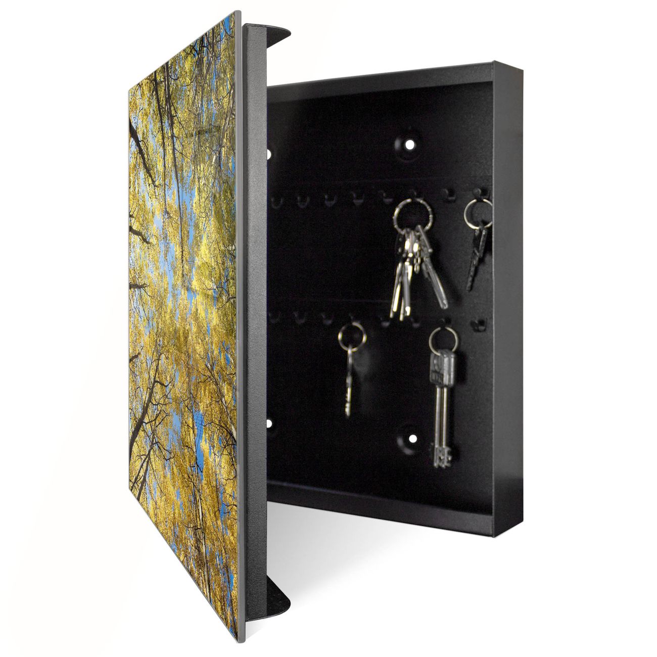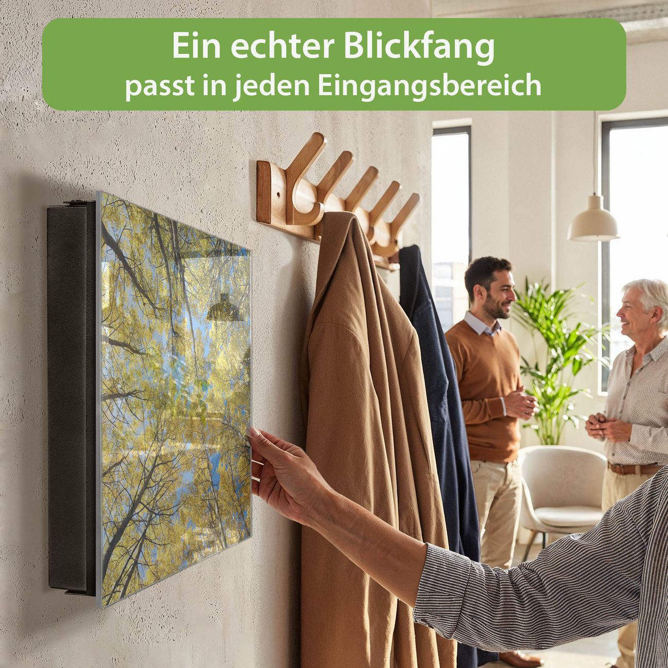 Bringe Ordnung und Eleganz in deinen Eingangsbereich mit dem banjado Schlüsselkasten Motiv Motiv Wipfel. Die moderne Schlüsselbox kombiniert funktionales Design mit hochwertiger Verarbeitung und wird so zu einem echten Hingucker in Flur, Büro oder Ferienwohnung. ✅ Stilvolle Schlüsselaufbewahrung mit Glasfront im Motiv Motiv Wipfel Der Design-Schlüsselkasten Motiv Motiv Wipfel bietet Platz für bis zu 50 Schlüssel, die auf 5 stabilen Reihen mit je 10 Haken übersichtlich verstaut werden. Mit seinen kompakten Maßen von 30 x 30 x 5 cm passt die Schlüsselbox perfekt auch in kleinere Räume. Der schwarz lackierte Stahlkorpus mit rechts angeschlagenem Türscharnier harmoniert mit der Glasfront und fügt sich nahtlos in jedes Wohnambiente ein. Ob als Schlüsselorganizer für Zuhause oder als praktische Lösung für Büros, Praxen und Gewerbe, der banjado Schlüsselkasten sorgt für Ordnung und Übersicht. Dank der magnetischen, mit Kreidestiften beschreibbaren Glasfront kannst du Notizen anheften oder Termine direkt auf der Oberfläche festhalten. Die Schlüsselbox Motiv Motiv Wipfel zur Wandmontage wird inklusive Befestigungsmaterial geliefert und ist schnell angebracht. So hast du deine Schlüssel jederzeit griffbereit und zugleich stilvoll verstaut. Mit diesem banjado Schlüsselkasten Motiv Motiv Wipfel kombinierst du praktische Aufbewahrung mit stilvollem Wohndesign. Ob privat oder geschäftlich, die Schlüsselbox sorgt für mehr Ordnung, Übersicht und ein wohnliches Ambiente.Vorteile im Überblick