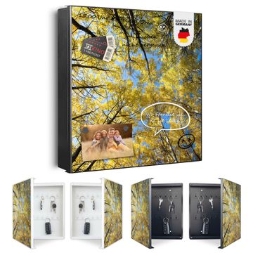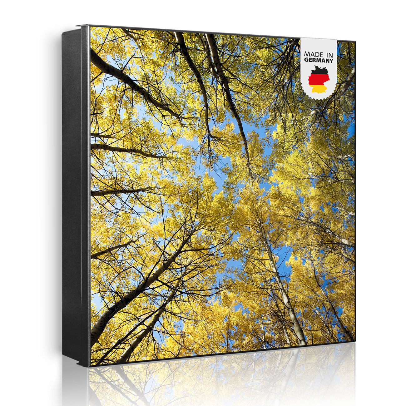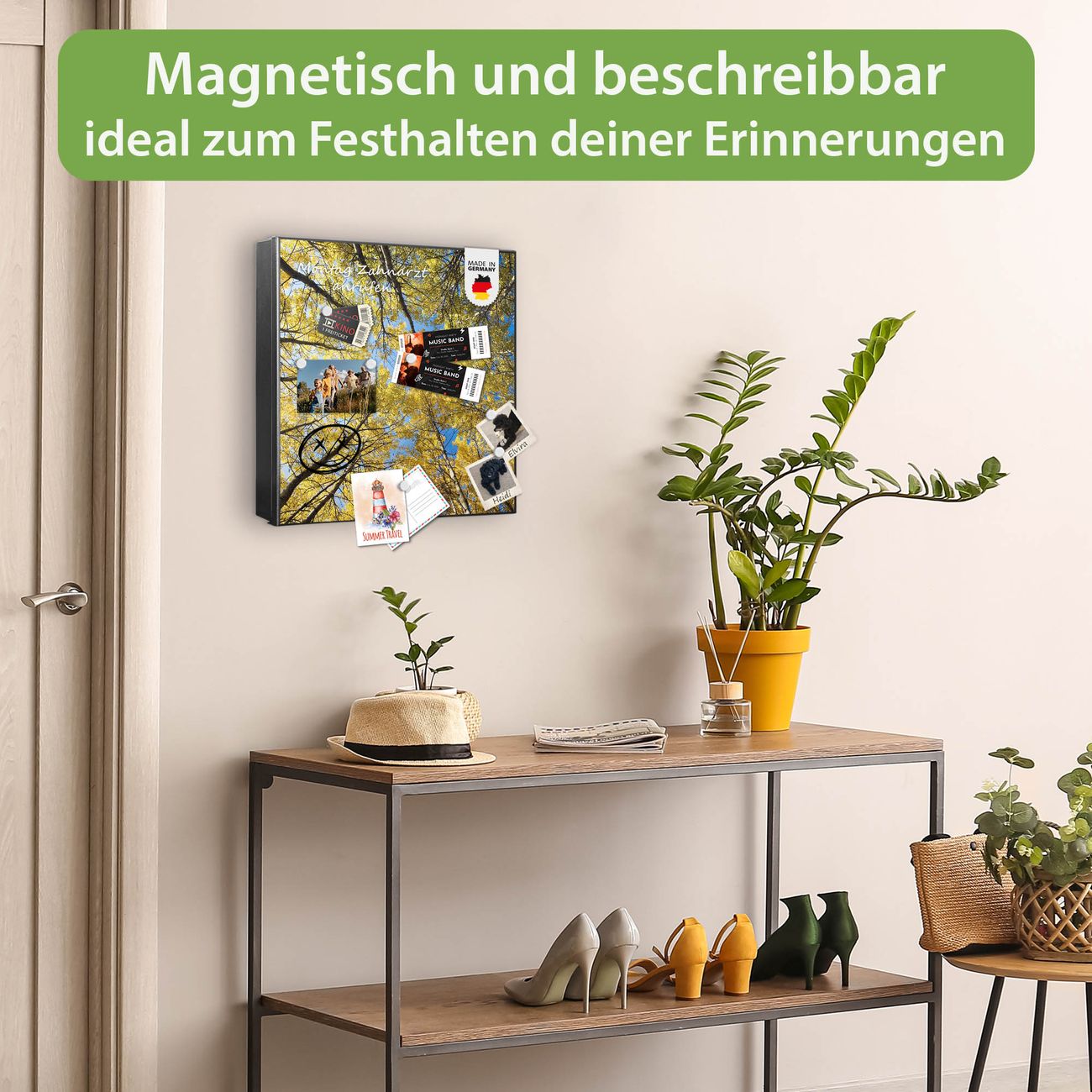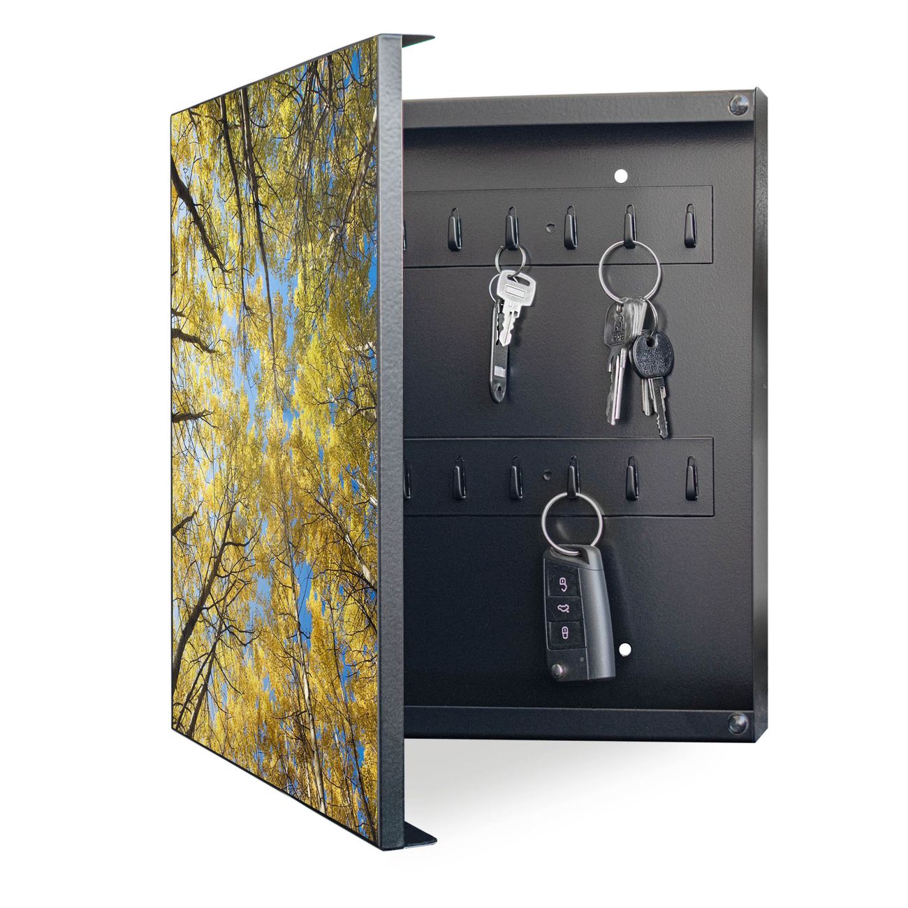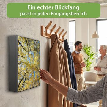 Bringe Ordnung und Eleganz in deinen Eingangsbereich mit dem banjado Schlüsselkasten Motiv Motiv Wipfel. Die moderne Schlüsselbox kombiniert funktionales Design mit hochwertiger Verarbeitung und wird so zu einem echten Hingucker in Flur, Büro oder Ferienwohnung. ✅ Stilvolle Schlüsselaufbewahrung mit Motiv Motiv Wipfel Der Design-Schlüsselkasten Motiv Motiv Wipfel bietet Platz für bis zu 32 Schlüssel, die auf 4 stabilen Reihen mit je 8 Haken übersichtlich verstaut werden. Mit seinen kompakten Maßen von 30 x 30 x 5 cm passt die Schlüsselbox perfekt auch in kleinere Räume. Der schwarz lackierte Stahlkorpus mit links angeschlagenem Türscharnier harmoniert mit gedruckten Folie auf der Front und fügt sich nahtlos in jedes Wohnambiente ein. Ob als Schlüsselorganizer für Zuhause oder als praktische Lösung für Büros, Praxen und Gewerbe, der banjado Schlüsselkasten sorgt für Ordnung und Übersicht. Dank der magnetischen, mit Kreidestiften beschreibbaren Folie auf der Front kannst du Notizen anheften oder Termine direkt auf der Oberfläche festhalten. Die Schlüsselbox Motiv Motiv Wipfel zur Wandmontage wird inklusive Befestigungsmaterial geliefert und ist schnell angebracht. So hast du deine Schlüssel jederzeit griffbereit und zugleich stilvoll verstaut. Mit diesem banjado Schlüsselkasten Motiv Motiv Wipfel kombinierst du praktische Aufbewahrung mit stilvollem Wohndesign. Ob privat oder geschäftlich, die Schlüsselbox sorgt für mehr Ordnung, Übersicht und ein wohnliches Ambiente.Vorteile im Überblick
