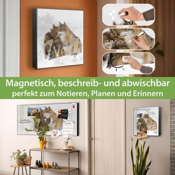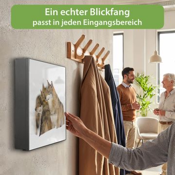 Bringe Ordnung und Eleganz in deinen Eingangsbereich mit dem banjado Schlüsselkasten Motiv Motiv Wölfe. Die moderne Schlüsselbox kombiniert funktionales Design mit hochwertiger Verarbeitung und wird so zu einem echten Hingucker in Flur, Büro oder Ferienwohnung. ✅ Stilvolle Schlüsselaufbewahrung mit Motiv Motiv Wölfe Der Design-Schlüsselkasten Motiv Motiv Wölfe bietet Platz für bis zu 32 Schlüssel, die auf 4 stabilen Reihen mit je 8 Haken übersichtlich verstaut werden. Mit seinen kompakten Maßen von 30 x 30 x 5 cm passt die Schlüsselbox perfekt auch in kleinere Räume. Der schwarz lackierte Stahlkorpus mit rechts angeschlagenem Türscharnier harmoniert mit gedruckten Folie auf der Front und fügt sich nahtlos in jedes Wohnambiente ein. Ob als Schlüsselorganizer für Zuhause oder als praktische Lösung für Büros, Praxen und Gewerbe, der banjado Schlüsselkasten sorgt für Ordnung und Übersicht. Dank der magnetischen, mit Kreidestiften beschreibbaren Folie auf der Front kannst du Notizen anheften oder Termine direkt auf der Oberfläche festhalten. Die Schlüsselbox Motiv Motiv Wölfe zur Wandmontage wird inklusive Befestigungsmaterial geliefert und ist schnell angebracht. So hast du deine Schlüssel jederzeit griffbereit und zugleich stilvoll verstaut. Mit diesem banjado Schlüsselkasten Motiv Motiv Wölfe kombinierst du praktische Aufbewahrung mit stilvollem Wohndesign. Ob privat oder geschäftlich, die Schlüsselbox sorgt für mehr Ordnung, Übersicht und ein wohnliches Ambiente.Vorteile im Überblick