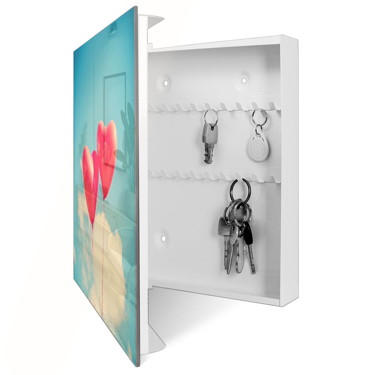 Bringe Ordnung und Eleganz in deinen Eingangsbereich mit dem banjado Schlüsselkasten Motiv Motiv Wolke Sieben. Die moderne Schlüsselbox kombiniert funktionales Design mit hochwertiger Verarbeitung und wird so zu einem echten Hingucker in Flur, Büro oder Ferienwohnung. ✅ Stilvolle Schlüsselaufbewahrung mit Glasfront im Motiv Motiv Wolke Sieben Der Design-Schlüsselkasten Motiv Motiv Wolke Sieben bietet Platz für bis zu 50 Schlüssel, die auf 5 stabilen Reihen mit je 10 Haken übersichtlich verstaut werden. Mit seinen kompakten Maßen von 30 x 30 x 5 cm passt die Schlüsselbox perfekt auch in kleinere Räume. Der weiß lackierte Stahlkorpus mit rechts angeschlagenem Türscharnier harmoniert mit der Glasfront und fügt sich nahtlos in jedes Wohnambiente ein. Ob als Schlüsselorganizer für Zuhause oder als praktische Lösung für Büros, Praxen und Gewerbe, der banjado Schlüsselkasten sorgt für Ordnung und Übersicht. Dank der magnetischen, mit Kreidestiften beschreibbaren Glasfront kannst du Notizen anheften oder Termine direkt auf der Oberfläche festhalten. Die Schlüsselbox Motiv Motiv Wolke Sieben zur Wandmontage wird inklusive Befestigungsmaterial geliefert und ist schnell angebracht. So hast du deine Schlüssel jederzeit griffbereit und zugleich stilvoll verstaut. Mit diesem banjado Schlüsselkasten Motiv Motiv Wolke Sieben kombinierst du praktische Aufbewahrung mit stilvollem Wohndesign. Ob privat oder geschäftlich, die Schlüsselbox sorgt für mehr Ordnung, Übersicht und ein wohnliches Ambiente.Vorteile im Überblick