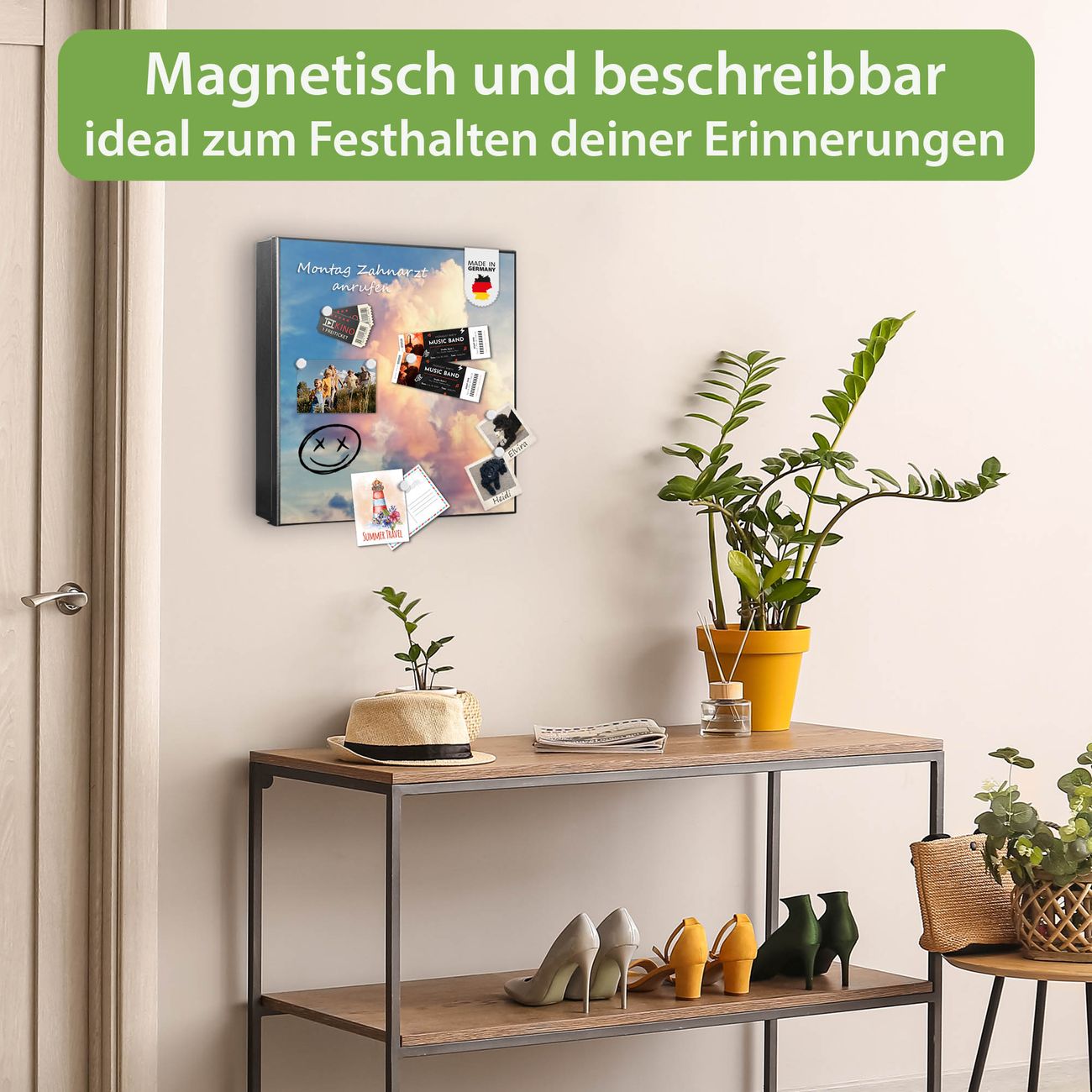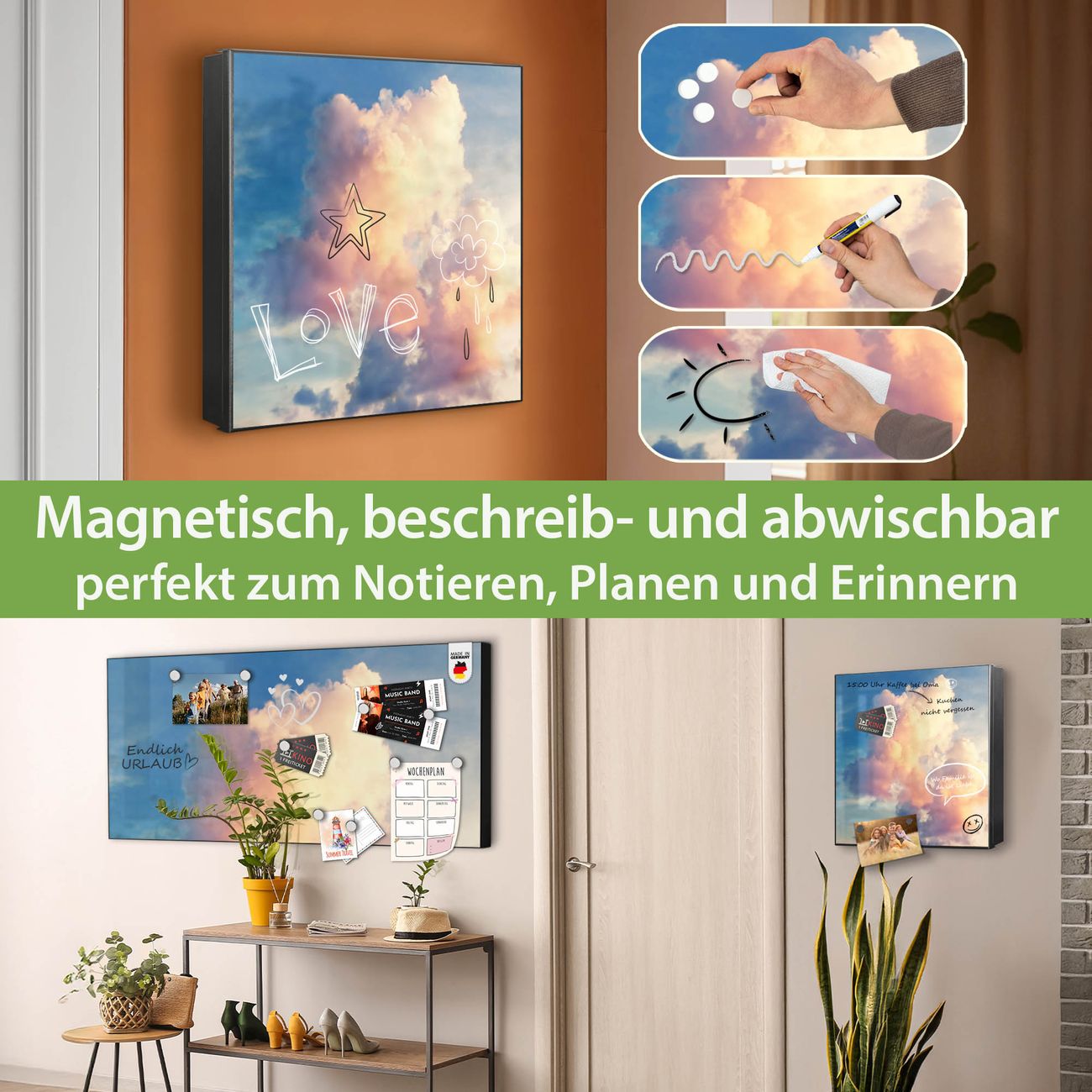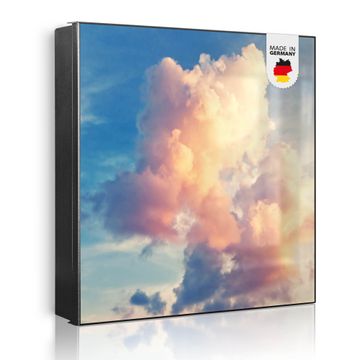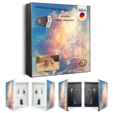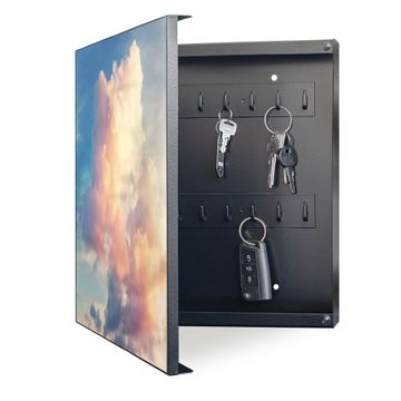 Bringe Ordnung und Eleganz in deinen Eingangsbereich mit dem banjado Schlüsselkasten Motiv Motiv Wolken 10. Die moderne Schlüsselbox kombiniert funktionales Design mit hochwertiger Verarbeitung und wird so zu einem echten Hingucker in Flur, Büro oder Ferienwohnung. ✅ Stilvolle Schlüsselaufbewahrung mit Motiv Motiv Wolken 10 Der Design-Schlüsselkasten Motiv Motiv Wolken 10 bietet Platz für bis zu 32 Schlüssel, die auf 4 stabilen Reihen mit je 8 Haken übersichtlich verstaut werden. Mit seinen kompakten Maßen von 30 x 30 x 5 cm passt die Schlüsselbox perfekt auch in kleinere Räume. Der schwarz lackierte Stahlkorpus mit links angeschlagenem Türscharnier harmoniert mit gedruckten Folie auf der Front und fügt sich nahtlos in jedes Wohnambiente ein. Ob als Schlüsselorganizer für Zuhause oder als praktische Lösung für Büros, Praxen und Gewerbe, der banjado Schlüsselkasten sorgt für Ordnung und Übersicht. Dank der magnetischen, mit Kreidestiften beschreibbaren Folie auf der Front kannst du Notizen anheften oder Termine direkt auf der Oberfläche festhalten. Die Schlüsselbox Motiv Motiv Wolken 10 zur Wandmontage wird inklusive Befestigungsmaterial geliefert und ist schnell angebracht. So hast du deine Schlüssel jederzeit griffbereit und zugleich stilvoll verstaut. Mit diesem banjado Schlüsselkasten Motiv Motiv Wolken 10 kombinierst du praktische Aufbewahrung mit stilvollem Wohndesign. Ob privat oder geschäftlich, die Schlüsselbox sorgt für mehr Ordnung, Übersicht und ein wohnliches Ambiente.Vorteile im Überblick
