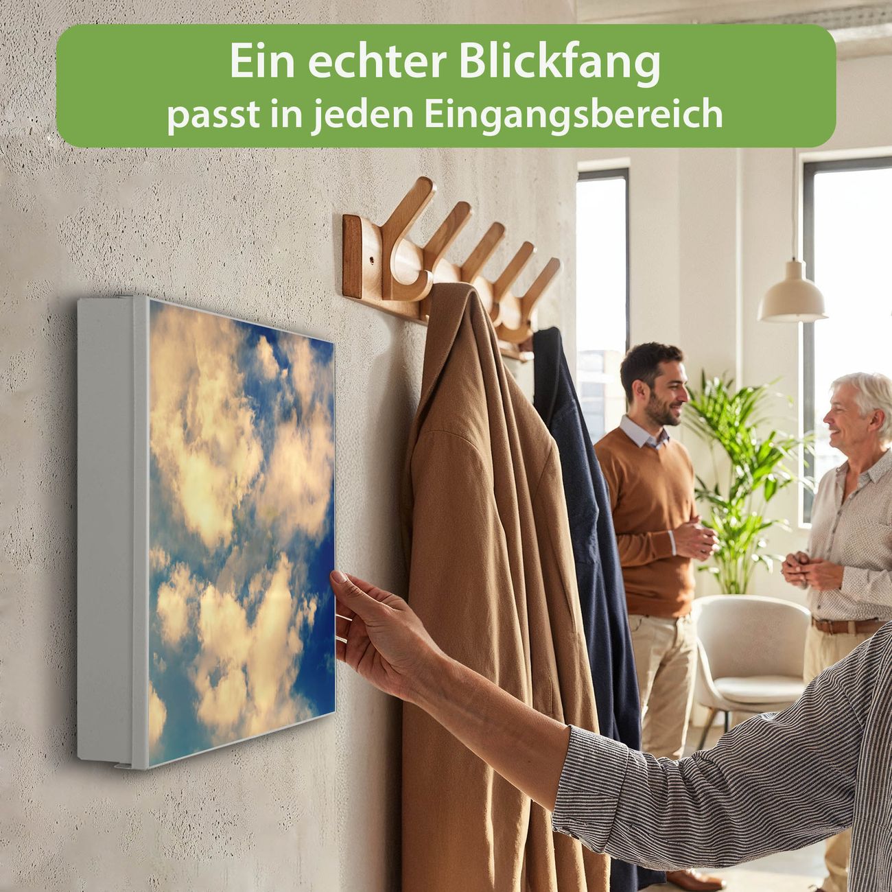 Bringe Ordnung und Eleganz in deinen Eingangsbereich mit dem banjado Schlüsselkasten Motiv Motiv Wolken 3. Die moderne Schlüsselbox kombiniert funktionales Design mit hochwertiger Verarbeitung und wird so zu einem echten Hingucker in Flur, Büro oder Ferienwohnung. ✅ Stilvolle Schlüsselaufbewahrung mit Motiv Motiv Wolken 3 Der Design-Schlüsselkasten Motiv Motiv Wolken 3 bietet Platz für bis zu 32 Schlüssel, die auf 4 stabilen Reihen mit je 8 Haken übersichtlich verstaut werden. Mit seinen kompakten Maßen von 30 x 30 x 5 cm passt die Schlüsselbox perfekt auch in kleinere Räume. Der weiß lackierte Stahlkorpus mit rechts angeschlagenem Türscharnier harmoniert mit gedruckten Folie auf der Front und fügt sich nahtlos in jedes Wohnambiente ein. Ob als Schlüsselorganizer für Zuhause oder als praktische Lösung für Büros, Praxen und Gewerbe, der banjado Schlüsselkasten sorgt für Ordnung und Übersicht. Dank der magnetischen, mit Kreidestiften beschreibbaren Folie auf der Front kannst du Notizen anheften oder Termine direkt auf der Oberfläche festhalten. Die Schlüsselbox Motiv Motiv Wolken 3 zur Wandmontage wird inklusive Befestigungsmaterial geliefert und ist schnell angebracht. So hast du deine Schlüssel jederzeit griffbereit und zugleich stilvoll verstaut. Mit diesem banjado Schlüsselkasten Motiv Motiv Wolken 3 kombinierst du praktische Aufbewahrung mit stilvollem Wohndesign. Ob privat oder geschäftlich, die Schlüsselbox sorgt für mehr Ordnung, Übersicht und ein wohnliches Ambiente.Vorteile im Überblick