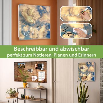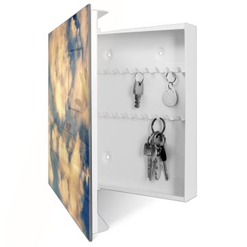 Bringe Ordnung und Eleganz in deinen Eingangsbereich mit dem banjado Schlüsselkasten Motiv Motiv Wolken 3. Die moderne Schlüsselbox kombiniert funktionales Design mit hochwertiger Verarbeitung und wird so zu einem echten Hingucker in Flur, Büro oder Ferienwohnung. ✅ Stilvolle Schlüsselaufbewahrung mit Glasfront im Motiv Motiv Wolken 3 Der Design-Schlüsselkasten Motiv Motiv Wolken 3 bietet Platz für bis zu 50 Schlüssel, die auf 5 stabilen Reihen mit je 10 Haken übersichtlich verstaut werden. Mit seinen kompakten Maßen von 30 x 30 x 5 cm passt die Schlüsselbox perfekt auch in kleinere Räume. Der weiß lackierte Stahlkorpus mit rechts angeschlagenem Türscharnier harmoniert mit der Glasfront und fügt sich nahtlos in jedes Wohnambiente ein. Ob als Schlüsselorganizer für Zuhause oder als praktische Lösung für Büros, Praxen und Gewerbe, der banjado Schlüsselkasten sorgt für Ordnung und Übersicht. Dank der magnetischen, mit Kreidestiften beschreibbaren Glasfront kannst du Notizen anheften oder Termine direkt auf der Oberfläche festhalten. Die Schlüsselbox Motiv Motiv Wolken 3 zur Wandmontage wird inklusive Befestigungsmaterial geliefert und ist schnell angebracht. So hast du deine Schlüssel jederzeit griffbereit und zugleich stilvoll verstaut. Mit diesem banjado Schlüsselkasten Motiv Motiv Wolken 3 kombinierst du praktische Aufbewahrung mit stilvollem Wohndesign. Ob privat oder geschäftlich, die Schlüsselbox sorgt für mehr Ordnung, Übersicht und ein wohnliches Ambiente.Vorteile im Überblick