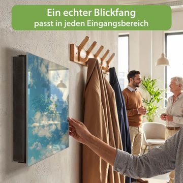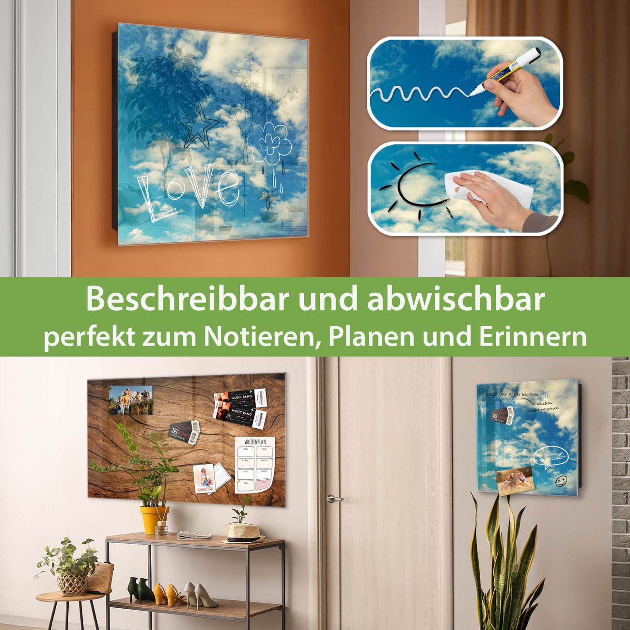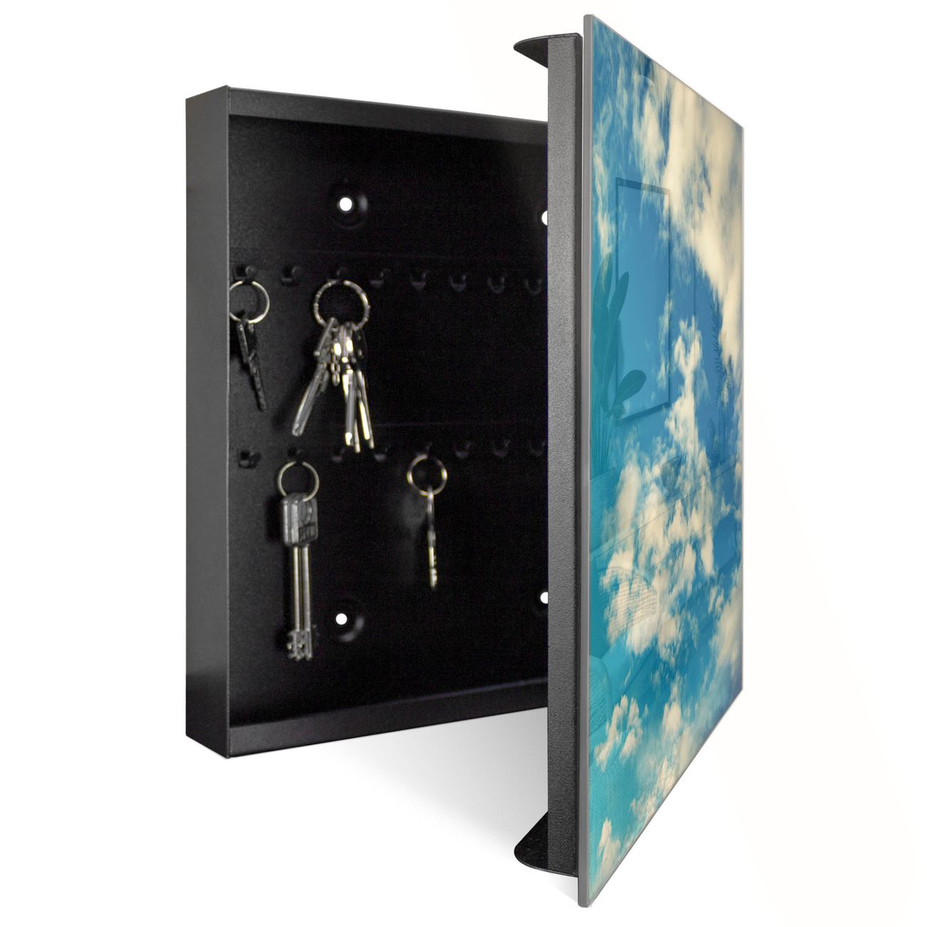 Bringe Ordnung und Eleganz in deinen Eingangsbereich mit dem banjado Schlüsselkasten Motiv Motiv Wolken 5. Die moderne Schlüsselbox kombiniert funktionales Design mit hochwertiger Verarbeitung und wird so zu einem echten Hingucker in Flur, Büro oder Ferienwohnung. ✅ Stilvolle Schlüsselaufbewahrung mit Glasfront im Motiv Motiv Wolken 5 Der Design-Schlüsselkasten Motiv Motiv Wolken 5 bietet Platz für bis zu 50 Schlüssel, die auf 5 stabilen Reihen mit je 10 Haken übersichtlich verstaut werden. Mit seinen kompakten Maßen von 30 x 30 x 5 cm passt die Schlüsselbox perfekt auch in kleinere Räume. Der schwarz lackierte Stahlkorpus mit rechts angeschlagenem Türscharnier harmoniert mit der Glasfront und fügt sich nahtlos in jedes Wohnambiente ein. Ob als Schlüsselorganizer für Zuhause oder als praktische Lösung für Büros, Praxen und Gewerbe, der banjado Schlüsselkasten sorgt für Ordnung und Übersicht. Dank der magnetischen, mit Kreidestiften beschreibbaren Glasfront kannst du Notizen anheften oder Termine direkt auf der Oberfläche festhalten. Die Schlüsselbox Motiv Motiv Wolken 5 zur Wandmontage wird inklusive Befestigungsmaterial geliefert und ist schnell angebracht. So hast du deine Schlüssel jederzeit griffbereit und zugleich stilvoll verstaut. Mit diesem banjado Schlüsselkasten Motiv Motiv Wolken 5 kombinierst du praktische Aufbewahrung mit stilvollem Wohndesign. Ob privat oder geschäftlich, die Schlüsselbox sorgt für mehr Ordnung, Übersicht und ein wohnliches Ambiente.Vorteile im Überblick