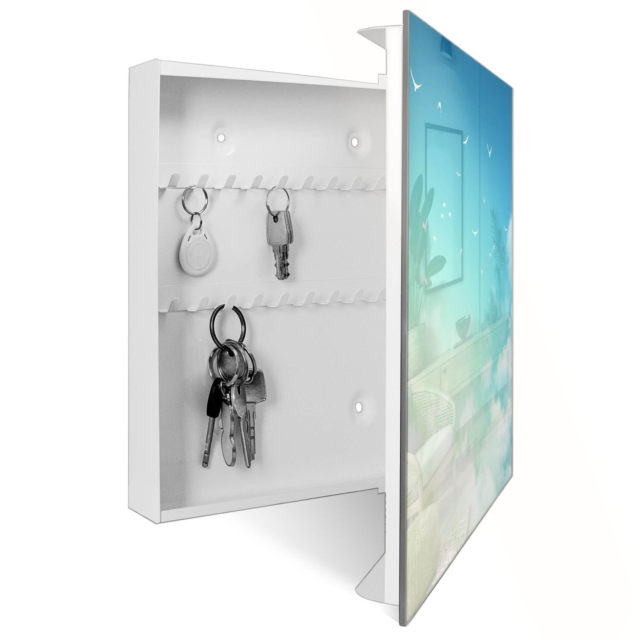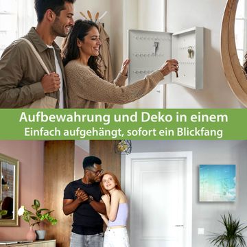Bringe Ordnung und Eleganz in deinen Eingangsbereich mit dem banjado Schlüsselkasten Motiv Motiv Wolken 8. Die moderne Schlüsselbox kombiniert funktionales Design mit hochwertiger Verarbeitung und wird so zu einem echten Hingucker in Flur, Büro oder Ferienwohnung. ✅ Stilvolle Schlüsselaufbewahrung mit Glasfront im Motiv Motiv Wolken 8 Der Design-Schlüsselkasten Motiv Motiv Wolken 8 bietet Platz für bis zu 50 Schlüssel, die auf 5 stabilen Reihen mit je 10 Haken übersichtlich verstaut werden. Mit seinen kompakten Maßen von 30 x 30 x 5 cm passt die Schlüsselbox perfekt auch in kleinere Räume. Der weiß lackierte Stahlkorpus mit rechts angeschlagenem Türscharnier harmoniert mit der Glasfront und fügt sich nahtlos in jedes Wohnambiente ein. Ob als Schlüsselorganizer für Zuhause oder als praktische Lösung für Büros, Praxen und Gewerbe, der banjado Schlüsselkasten sorgt für Ordnung und Übersicht. Dank der magnetischen, mit Kreidestiften beschreibbaren Glasfront kannst du Notizen anheften oder Termine direkt auf der Oberfläche festhalten. Die Schlüsselbox Motiv Motiv Wolken 8 zur Wandmontage wird inklusive Befestigungsmaterial geliefert und ist schnell angebracht. So hast du deine Schlüssel jederzeit griffbereit und zugleich stilvoll verstaut. Mit diesem banjado Schlüsselkasten Motiv Motiv Wolken 8 kombinierst du praktische Aufbewahrung mit stilvollem Wohndesign. Ob privat oder geschäftlich, die Schlüsselbox sorgt für mehr Ordnung, Übersicht und ein wohnliches Ambiente.Vorteile im Überblick