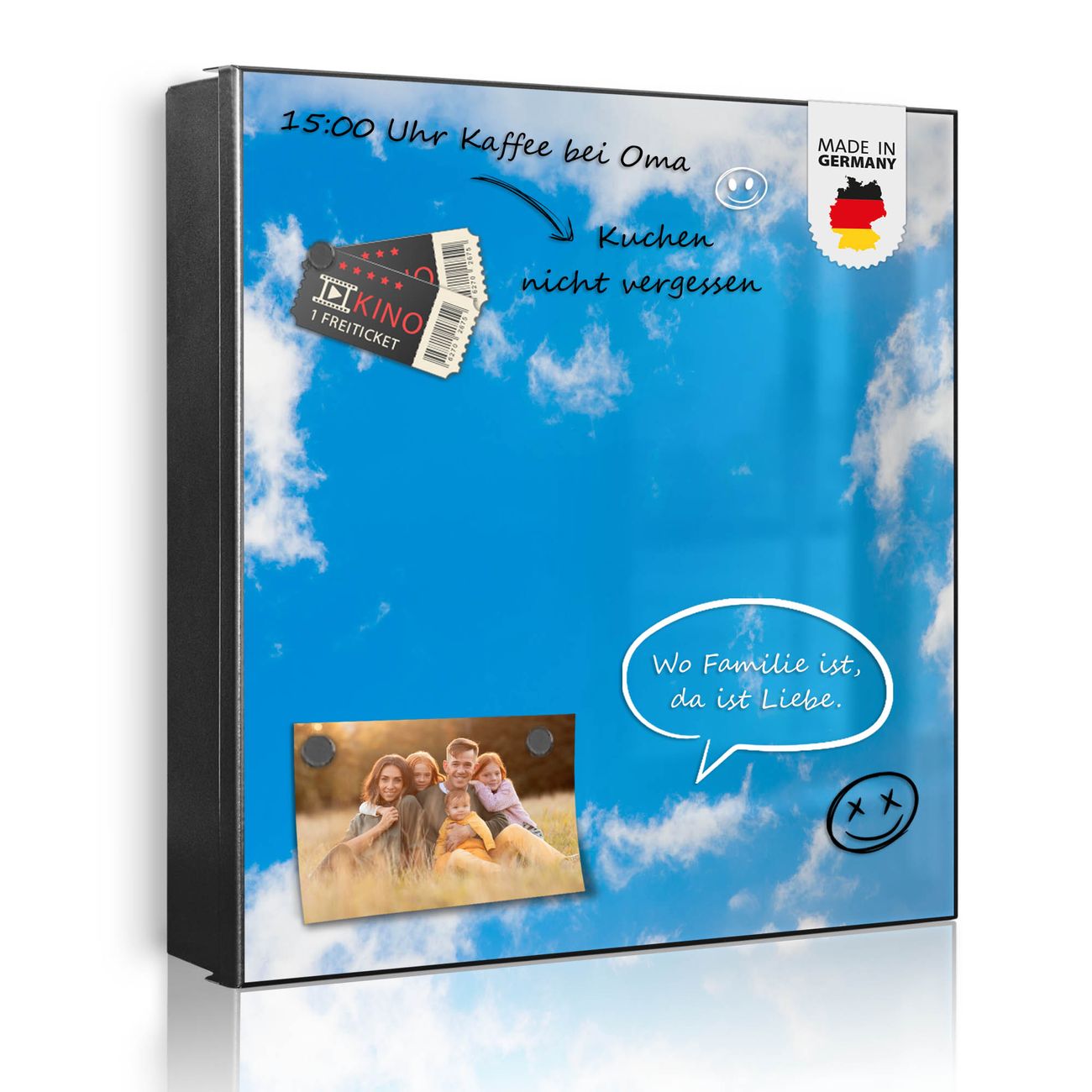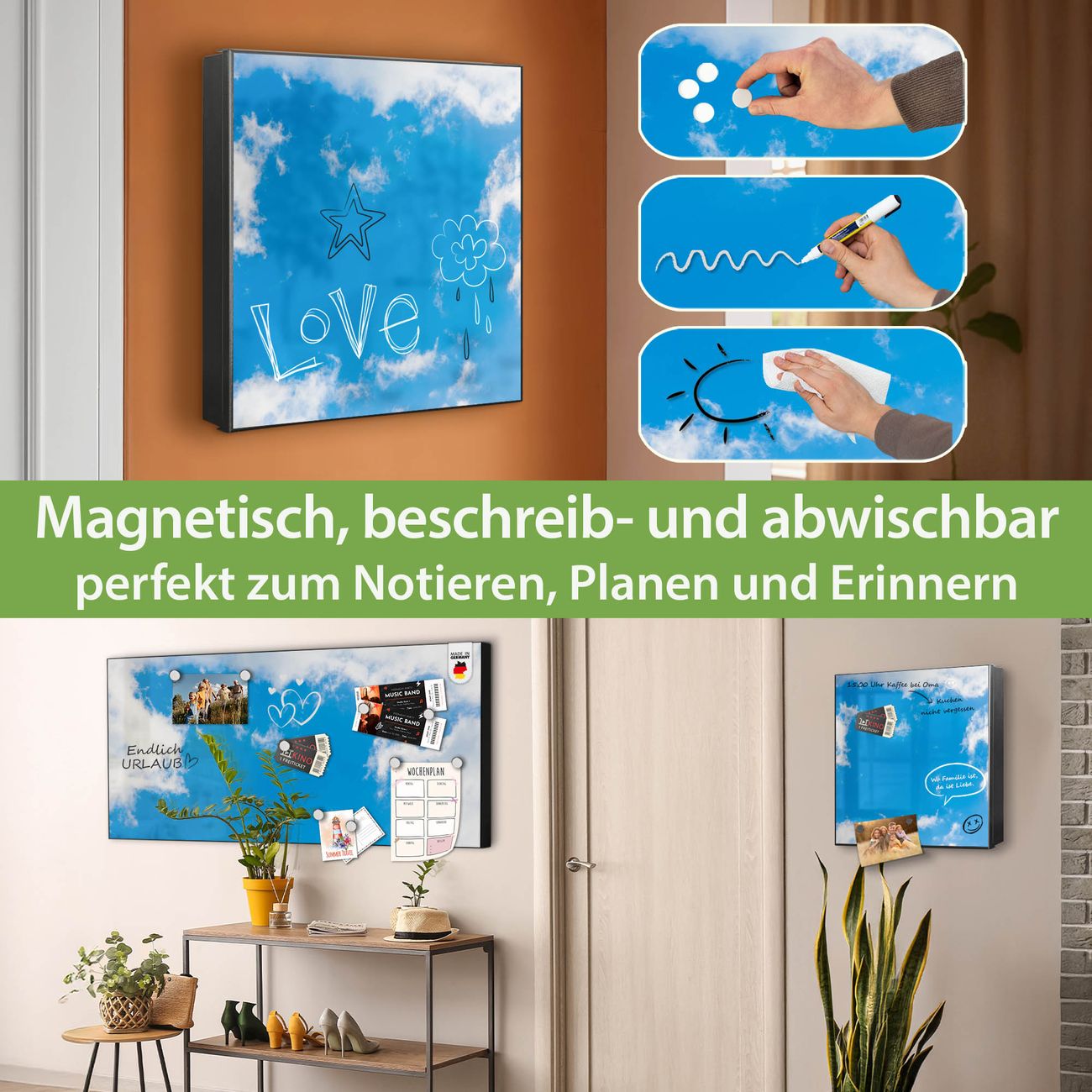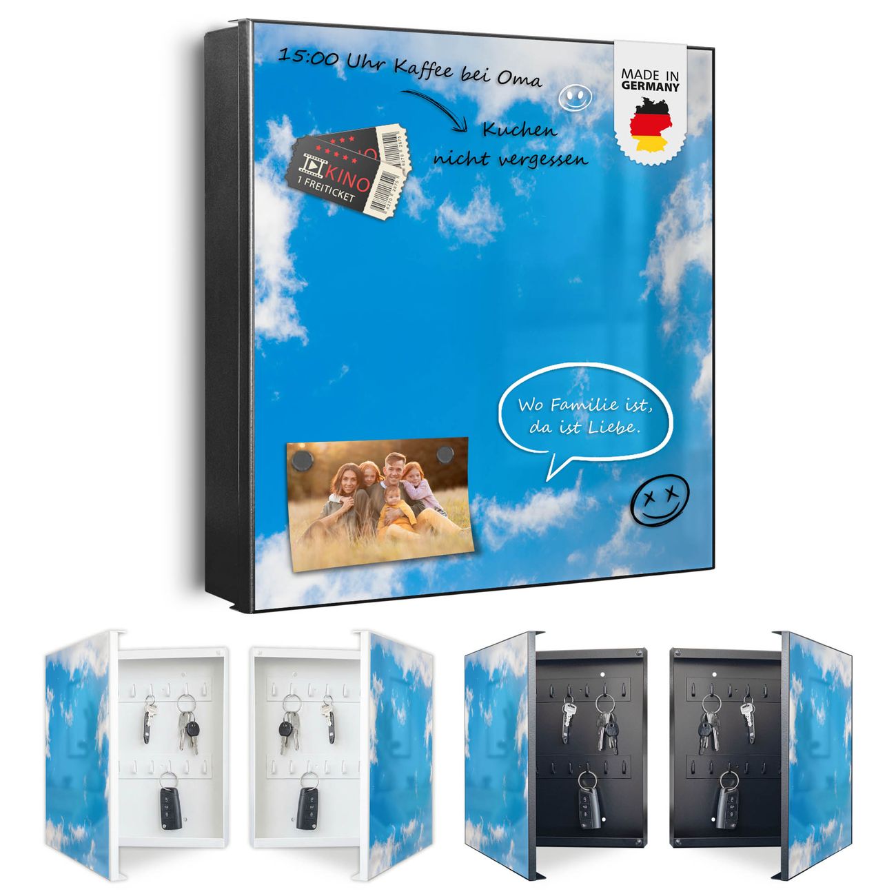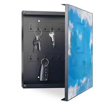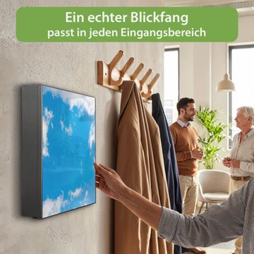 Bringe Ordnung und Eleganz in deinen Eingangsbereich mit dem banjado Schlüsselkasten Motiv Motiv Wolken 9. Die moderne Schlüsselbox kombiniert funktionales Design mit hochwertiger Verarbeitung und wird so zu einem echten Hingucker in Flur, Büro oder Ferienwohnung. ✅ Stilvolle Schlüsselaufbewahrung mit Motiv Motiv Wolken 9 Der Design-Schlüsselkasten Motiv Motiv Wolken 9 bietet Platz für bis zu 32 Schlüssel, die auf 4 stabilen Reihen mit je 8 Haken übersichtlich verstaut werden. Mit seinen kompakten Maßen von 30 x 30 x 5 cm passt die Schlüsselbox perfekt auch in kleinere Räume. Der schwarz lackierte Stahlkorpus mit rechts angeschlagenem Türscharnier harmoniert mit gedruckten Folie auf der Front und fügt sich nahtlos in jedes Wohnambiente ein. Ob als Schlüsselorganizer für Zuhause oder als praktische Lösung für Büros, Praxen und Gewerbe, der banjado Schlüsselkasten sorgt für Ordnung und Übersicht. Dank der magnetischen, mit Kreidestiften beschreibbaren Folie auf der Front kannst du Notizen anheften oder Termine direkt auf der Oberfläche festhalten. Die Schlüsselbox Motiv Motiv Wolken 9 zur Wandmontage wird inklusive Befestigungsmaterial geliefert und ist schnell angebracht. So hast du deine Schlüssel jederzeit griffbereit und zugleich stilvoll verstaut. Mit diesem banjado Schlüsselkasten Motiv Motiv Wolken 9 kombinierst du praktische Aufbewahrung mit stilvollem Wohndesign. Ob privat oder geschäftlich, die Schlüsselbox sorgt für mehr Ordnung, Übersicht und ein wohnliches Ambiente.Vorteile im Überblick