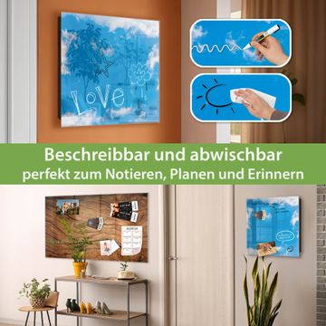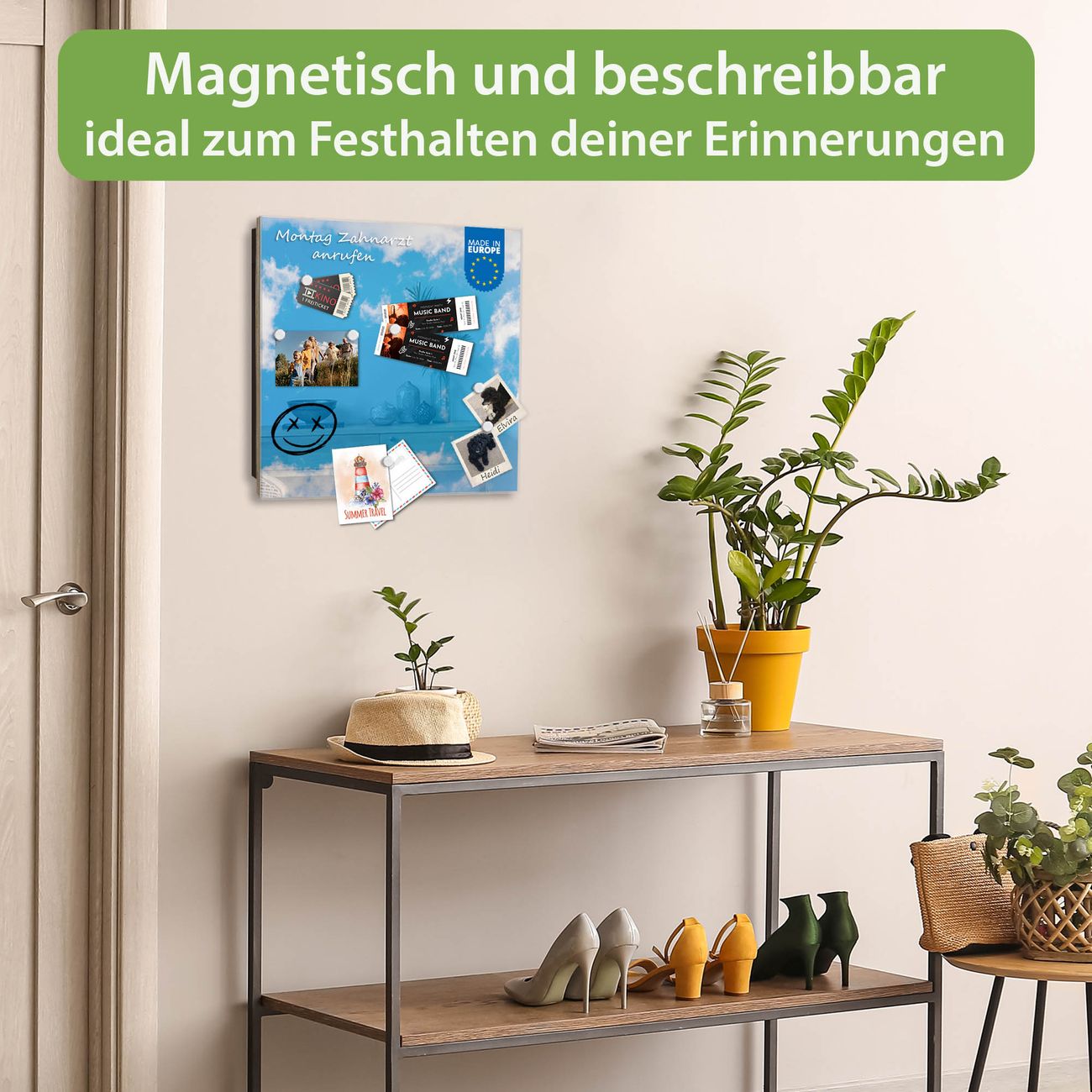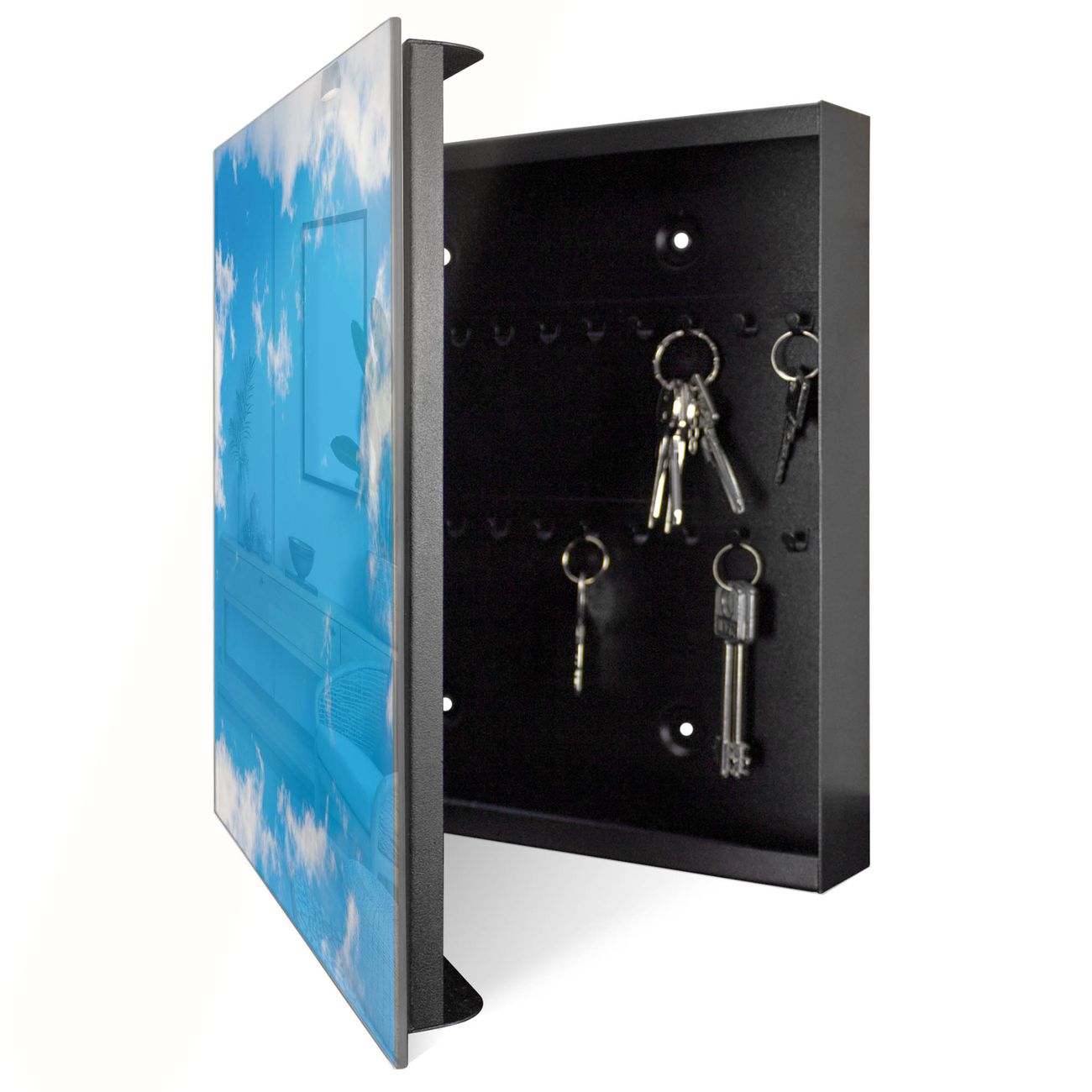 Bringe Ordnung und Eleganz in deinen Eingangsbereich mit dem banjado Schlüsselkasten Motiv Motiv Wolken 9. Die moderne Schlüsselbox kombiniert funktionales Design mit hochwertiger Verarbeitung und wird so zu einem echten Hingucker in Flur, Büro oder Ferienwohnung. ✅ Stilvolle Schlüsselaufbewahrung mit Glasfront im Motiv Motiv Wolken 9 Der Design-Schlüsselkasten Motiv Motiv Wolken 9 bietet Platz für bis zu 50 Schlüssel, die auf 5 stabilen Reihen mit je 10 Haken übersichtlich verstaut werden. Mit seinen kompakten Maßen von 30 x 30 x 5 cm passt die Schlüsselbox perfekt auch in kleinere Räume. Der schwarz lackierte Stahlkorpus mit rechts angeschlagenem Türscharnier harmoniert mit der Glasfront und fügt sich nahtlos in jedes Wohnambiente ein. Ob als Schlüsselorganizer für Zuhause oder als praktische Lösung für Büros, Praxen und Gewerbe, der banjado Schlüsselkasten sorgt für Ordnung und Übersicht. Dank der magnetischen, mit Kreidestiften beschreibbaren Glasfront kannst du Notizen anheften oder Termine direkt auf der Oberfläche festhalten. Die Schlüsselbox Motiv Motiv Wolken 9 zur Wandmontage wird inklusive Befestigungsmaterial geliefert und ist schnell angebracht. So hast du deine Schlüssel jederzeit griffbereit und zugleich stilvoll verstaut. Mit diesem banjado Schlüsselkasten Motiv Motiv Wolken 9 kombinierst du praktische Aufbewahrung mit stilvollem Wohndesign. Ob privat oder geschäftlich, die Schlüsselbox sorgt für mehr Ordnung, Übersicht und ein wohnliches Ambiente.Vorteile im Überblick