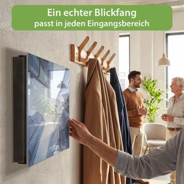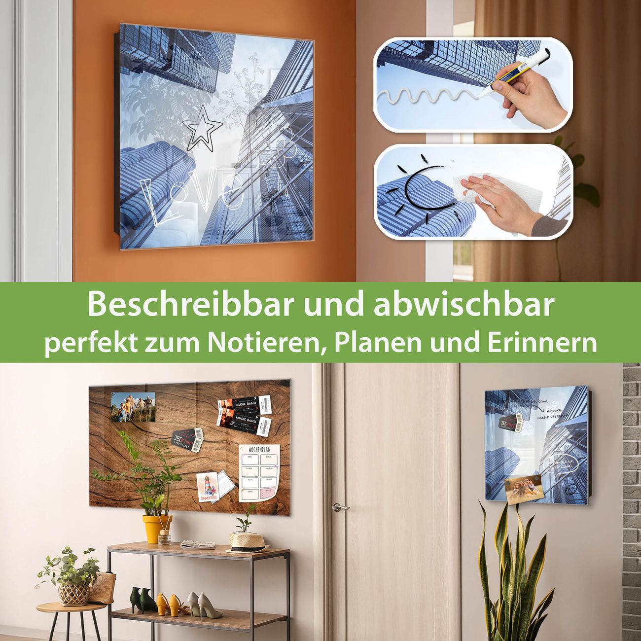 Bringe Ordnung und Eleganz in deinen Eingangsbereich mit dem banjado Schlüsselkasten Motiv Motiv Wolkenkratzer. Die moderne Schlüsselbox kombiniert funktionales Design mit hochwertiger Verarbeitung und wird so zu einem echten Hingucker in Flur, Büro oder Ferienwohnung. ✅ Stilvolle Schlüsselaufbewahrung mit Glasfront im Motiv Motiv Wolkenkratzer Der Design-Schlüsselkasten Motiv Motiv Wolkenkratzer bietet Platz für bis zu 50 Schlüssel, die auf 5 stabilen Reihen mit je 10 Haken übersichtlich verstaut werden. Mit seinen kompakten Maßen von 30 x 30 x 5 cm passt die Schlüsselbox perfekt auch in kleinere Räume. Der schwarz lackierte Stahlkorpus mit rechts angeschlagenem Türscharnier harmoniert mit der Glasfront und fügt sich nahtlos in jedes Wohnambiente ein. Ob als Schlüsselorganizer für Zuhause oder als praktische Lösung für Büros, Praxen und Gewerbe, der banjado Schlüsselkasten sorgt für Ordnung und Übersicht. Dank der magnetischen, mit Kreidestiften beschreibbaren Glasfront kannst du Notizen anheften oder Termine direkt auf der Oberfläche festhalten. Die Schlüsselbox Motiv Motiv Wolkenkratzer zur Wandmontage wird inklusive Befestigungsmaterial geliefert und ist schnell angebracht. So hast du deine Schlüssel jederzeit griffbereit und zugleich stilvoll verstaut. Mit diesem banjado Schlüsselkasten Motiv Motiv Wolkenkratzer kombinierst du praktische Aufbewahrung mit stilvollem Wohndesign. Ob privat oder geschäftlich, die Schlüsselbox sorgt für mehr Ordnung, Übersicht und ein wohnliches Ambiente.Vorteile im Überblick