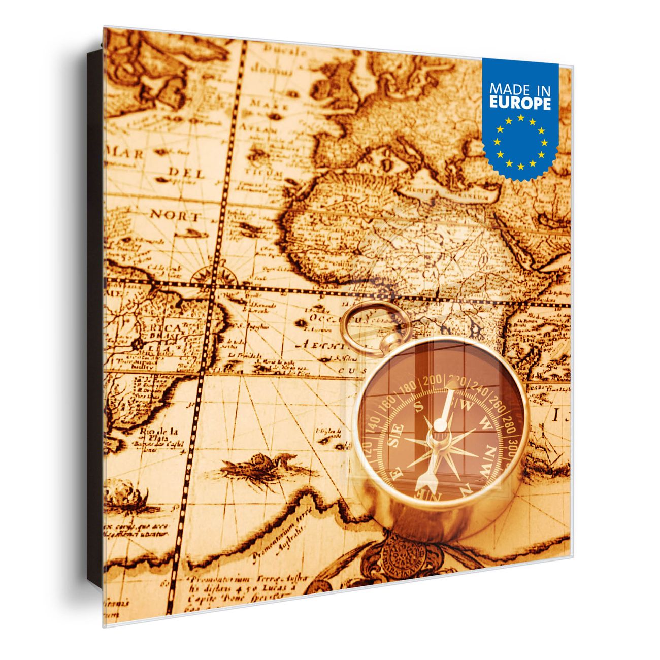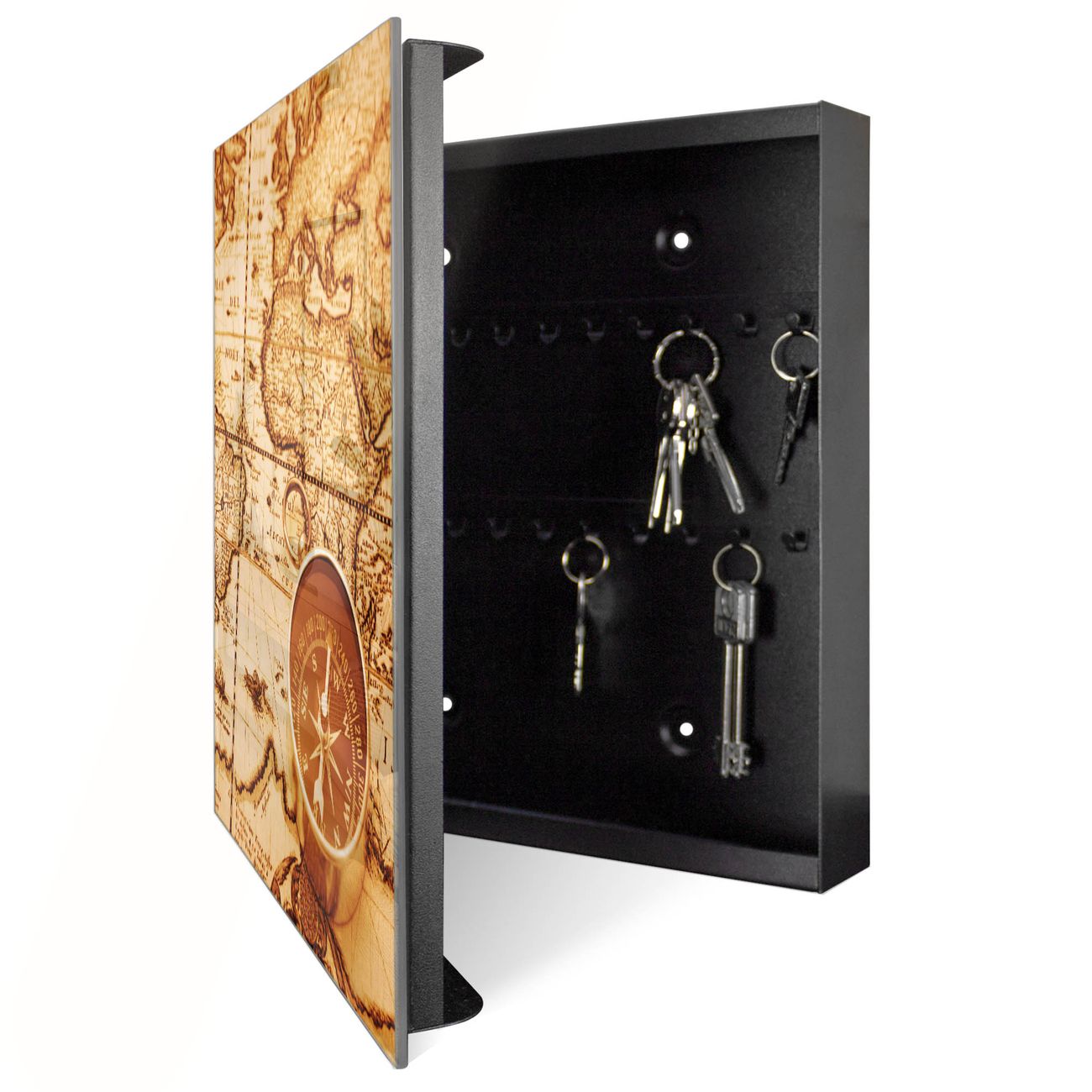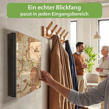 Bringe Ordnung und Eleganz in deinen Eingangsbereich mit dem banjado Schlüsselkasten Motiv Motiv World Map. Die moderne Schlüsselbox kombiniert funktionales Design mit hochwertiger Verarbeitung und wird so zu einem echten Hingucker in Flur, Büro oder Ferienwohnung. ✅ Stilvolle Schlüsselaufbewahrung mit Glasfront im Motiv Motiv World Map Der Design-Schlüsselkasten Motiv Motiv World Map bietet Platz für bis zu 50 Schlüssel, die auf 5 stabilen Reihen mit je 10 Haken übersichtlich verstaut werden. Mit seinen kompakten Maßen von 30 x 30 x 5 cm passt die Schlüsselbox perfekt auch in kleinere Räume. Der schwarz lackierte Stahlkorpus mit rechts angeschlagenem Türscharnier harmoniert mit der Glasfront und fügt sich nahtlos in jedes Wohnambiente ein. Ob als Schlüsselorganizer für Zuhause oder als praktische Lösung für Büros, Praxen und Gewerbe, der banjado Schlüsselkasten sorgt für Ordnung und Übersicht. Dank der magnetischen, mit Kreidestiften beschreibbaren Glasfront kannst du Notizen anheften oder Termine direkt auf der Oberfläche festhalten. Die Schlüsselbox Motiv Motiv World Map zur Wandmontage wird inklusive Befestigungsmaterial geliefert und ist schnell angebracht. So hast du deine Schlüssel jederzeit griffbereit und zugleich stilvoll verstaut. Mit diesem banjado Schlüsselkasten Motiv Motiv World Map kombinierst du praktische Aufbewahrung mit stilvollem Wohndesign. Ob privat oder geschäftlich, die Schlüsselbox sorgt für mehr Ordnung, Übersicht und ein wohnliches Ambiente.Vorteile im Überblick