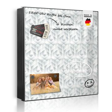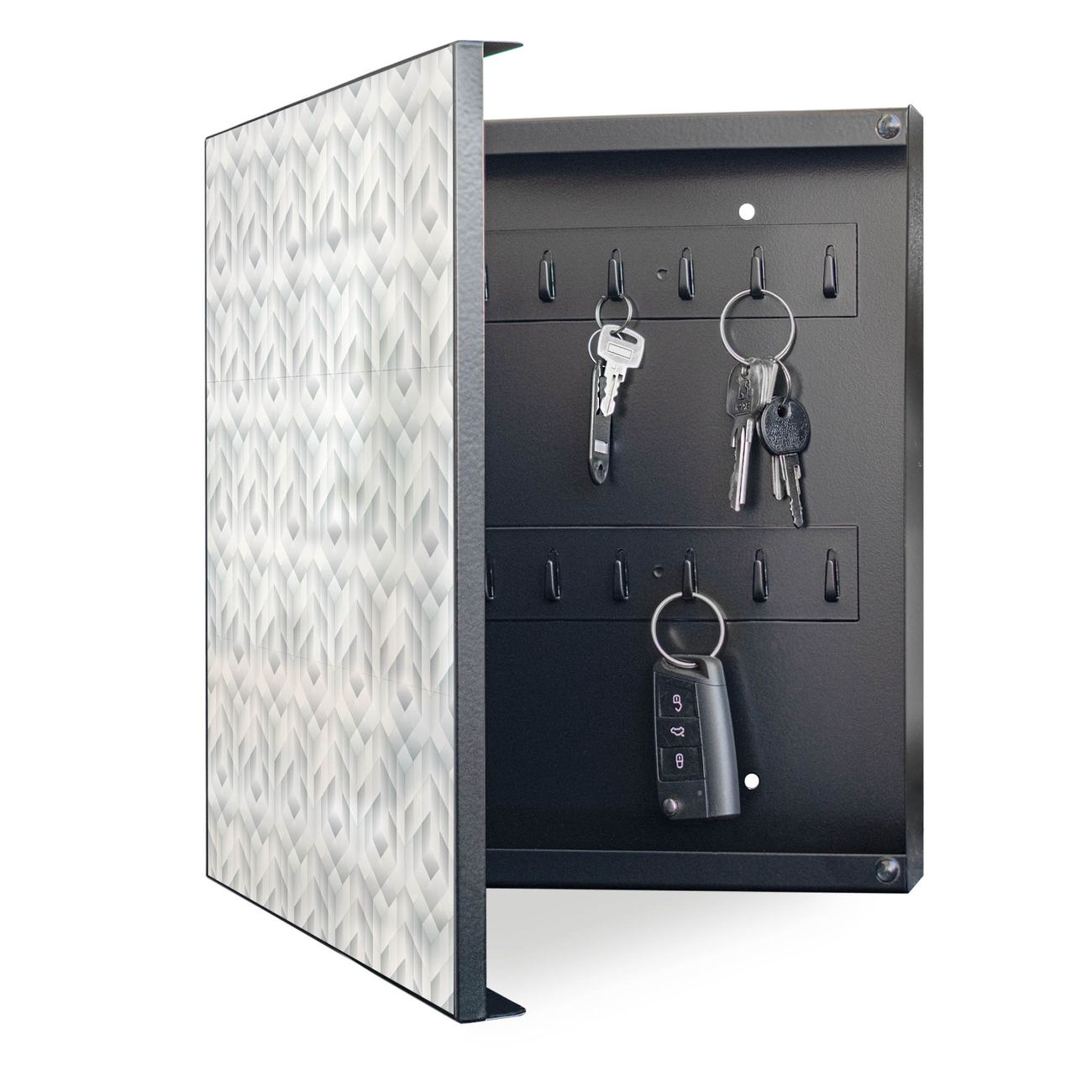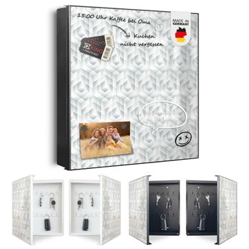 Bringe Ordnung und Eleganz in deinen Eingangsbereich mit dem banjado Schlüsselkasten Motiv Motiv Würfel Grau. Die moderne Schlüsselbox kombiniert funktionales Design mit hochwertiger Verarbeitung und wird so zu einem echten Hingucker in Flur, Büro oder Ferienwohnung. ✅ Stilvolle Schlüsselaufbewahrung mit Motiv Motiv Würfel Grau Der Design-Schlüsselkasten Motiv Motiv Würfel Grau bietet Platz für bis zu 32 Schlüssel, die auf 4 stabilen Reihen mit je 8 Haken übersichtlich verstaut werden. Mit seinen kompakten Maßen von 30 x 30 x 5 cm passt die Schlüsselbox perfekt auch in kleinere Räume. Der schwarz lackierte Stahlkorpus mit links angeschlagenem Türscharnier harmoniert mit gedruckten Folie auf der Front und fügt sich nahtlos in jedes Wohnambiente ein. Ob als Schlüsselorganizer für Zuhause oder als praktische Lösung für Büros, Praxen und Gewerbe, der banjado Schlüsselkasten sorgt für Ordnung und Übersicht. Dank der magnetischen, mit Kreidestiften beschreibbaren Folie auf der Front kannst du Notizen anheften oder Termine direkt auf der Oberfläche festhalten. Die Schlüsselbox Motiv Motiv Würfel Grau zur Wandmontage wird inklusive Befestigungsmaterial geliefert und ist schnell angebracht. So hast du deine Schlüssel jederzeit griffbereit und zugleich stilvoll verstaut. Mit diesem banjado Schlüsselkasten Motiv Motiv Würfel Grau kombinierst du praktische Aufbewahrung mit stilvollem Wohndesign. Ob privat oder geschäftlich, die Schlüsselbox sorgt für mehr Ordnung, Übersicht und ein wohnliches Ambiente.Vorteile im Überblick