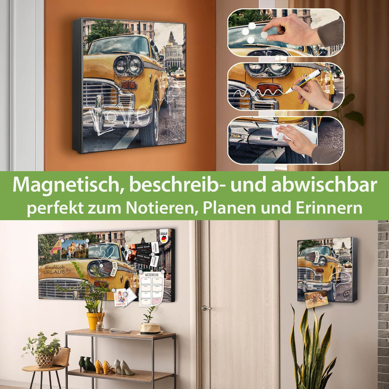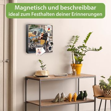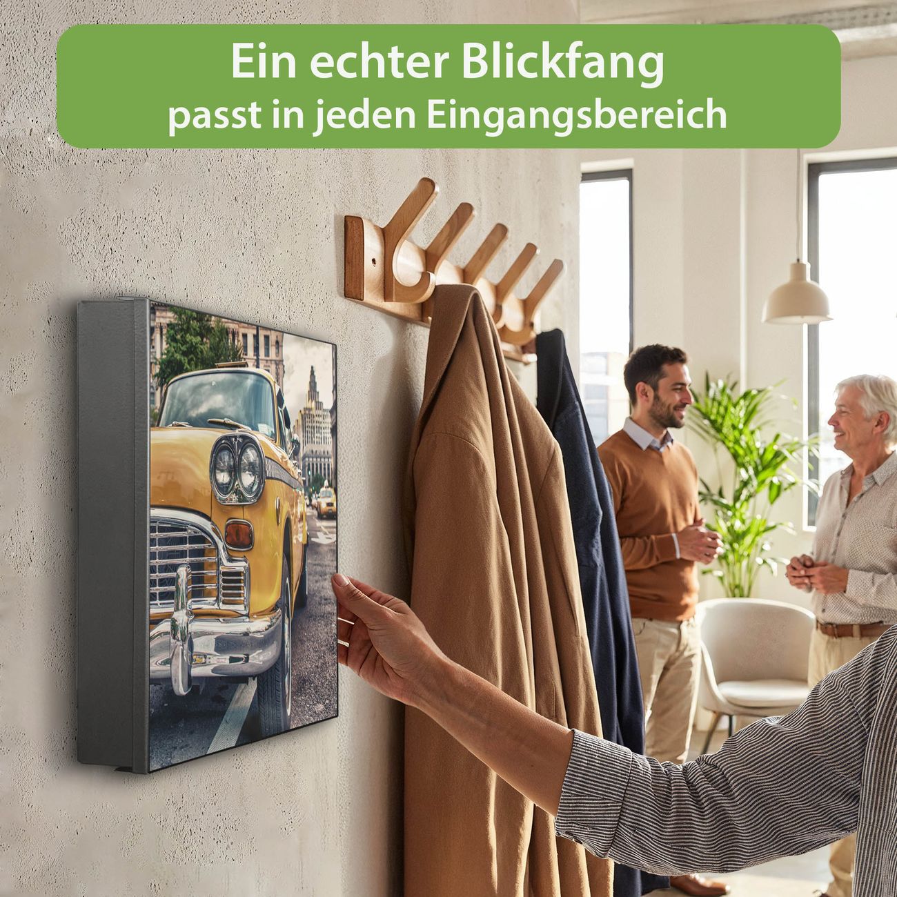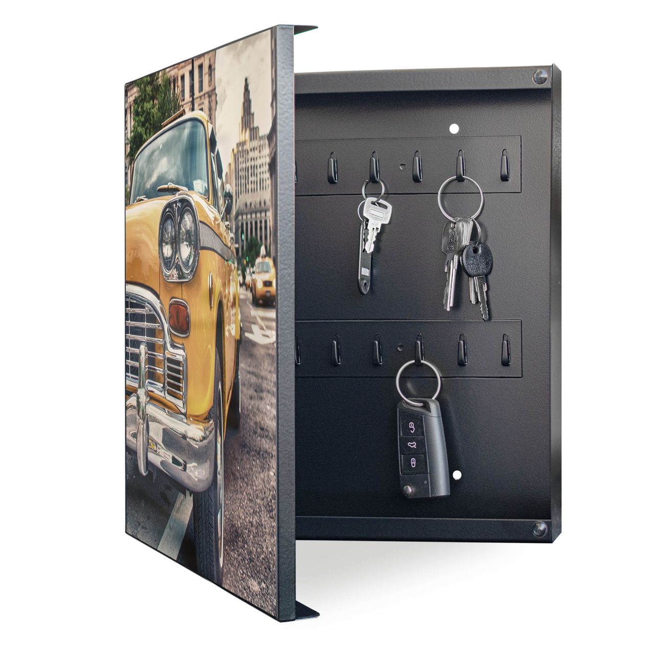 Bringe Ordnung und Eleganz in deinen Eingangsbereich mit dem banjado Schlüsselkasten Motiv Motiv Yellow Cab. Die moderne Schlüsselbox kombiniert funktionales Design mit hochwertiger Verarbeitung und wird so zu einem echten Hingucker in Flur, Büro oder Ferienwohnung. ✅ Stilvolle Schlüsselaufbewahrung mit Motiv Motiv Yellow Cab Der Design-Schlüsselkasten Motiv Motiv Yellow Cab bietet Platz für bis zu 32 Schlüssel, die auf 4 stabilen Reihen mit je 8 Haken übersichtlich verstaut werden. Mit seinen kompakten Maßen von 30 x 30 x 5 cm passt die Schlüsselbox perfekt auch in kleinere Räume. Der schwarz lackierte Stahlkorpus mit links angeschlagenem Türscharnier harmoniert mit gedruckten Folie auf der Front und fügt sich nahtlos in jedes Wohnambiente ein. Ob als Schlüsselorganizer für Zuhause oder als praktische Lösung für Büros, Praxen und Gewerbe, der banjado Schlüsselkasten sorgt für Ordnung und Übersicht. Dank der magnetischen, mit Kreidestiften beschreibbaren Folie auf der Front kannst du Notizen anheften oder Termine direkt auf der Oberfläche festhalten. Die Schlüsselbox Motiv Motiv Yellow Cab zur Wandmontage wird inklusive Befestigungsmaterial geliefert und ist schnell angebracht. So hast du deine Schlüssel jederzeit griffbereit und zugleich stilvoll verstaut. Mit diesem banjado Schlüsselkasten Motiv Motiv Yellow Cab kombinierst du praktische Aufbewahrung mit stilvollem Wohndesign. Ob privat oder geschäftlich, die Schlüsselbox sorgt für mehr Ordnung, Übersicht und ein wohnliches Ambiente.Vorteile im Überblick