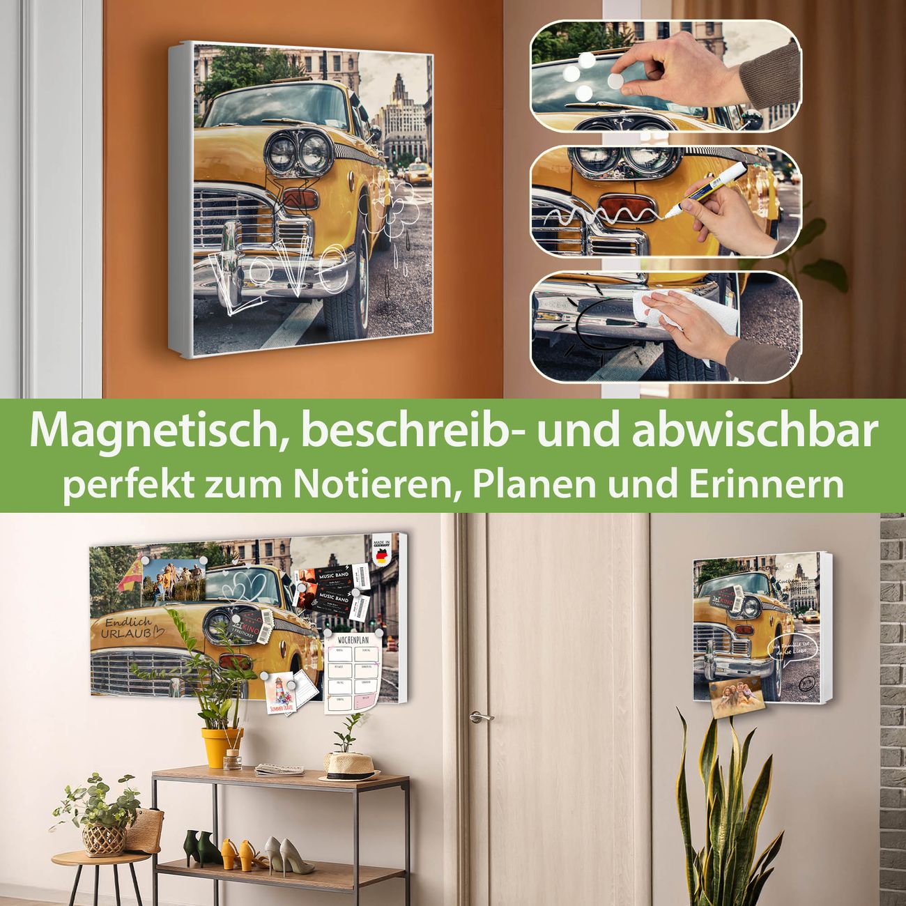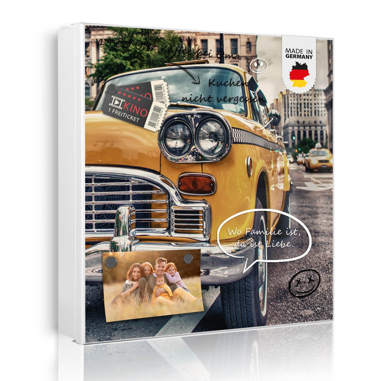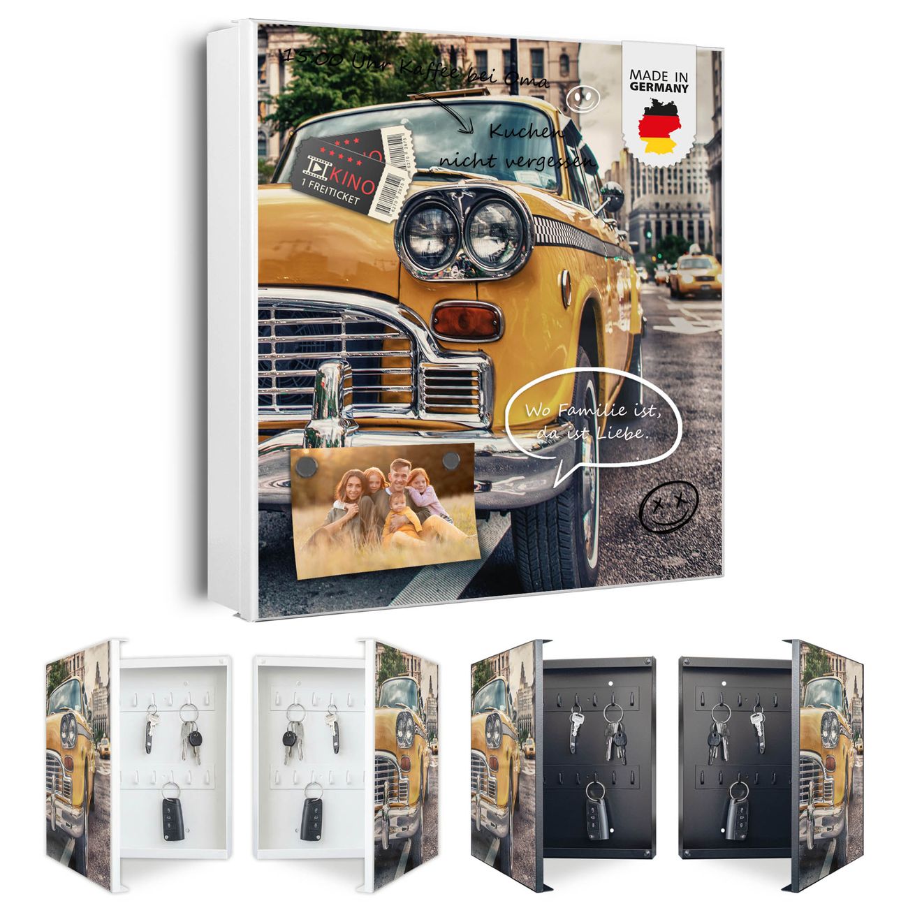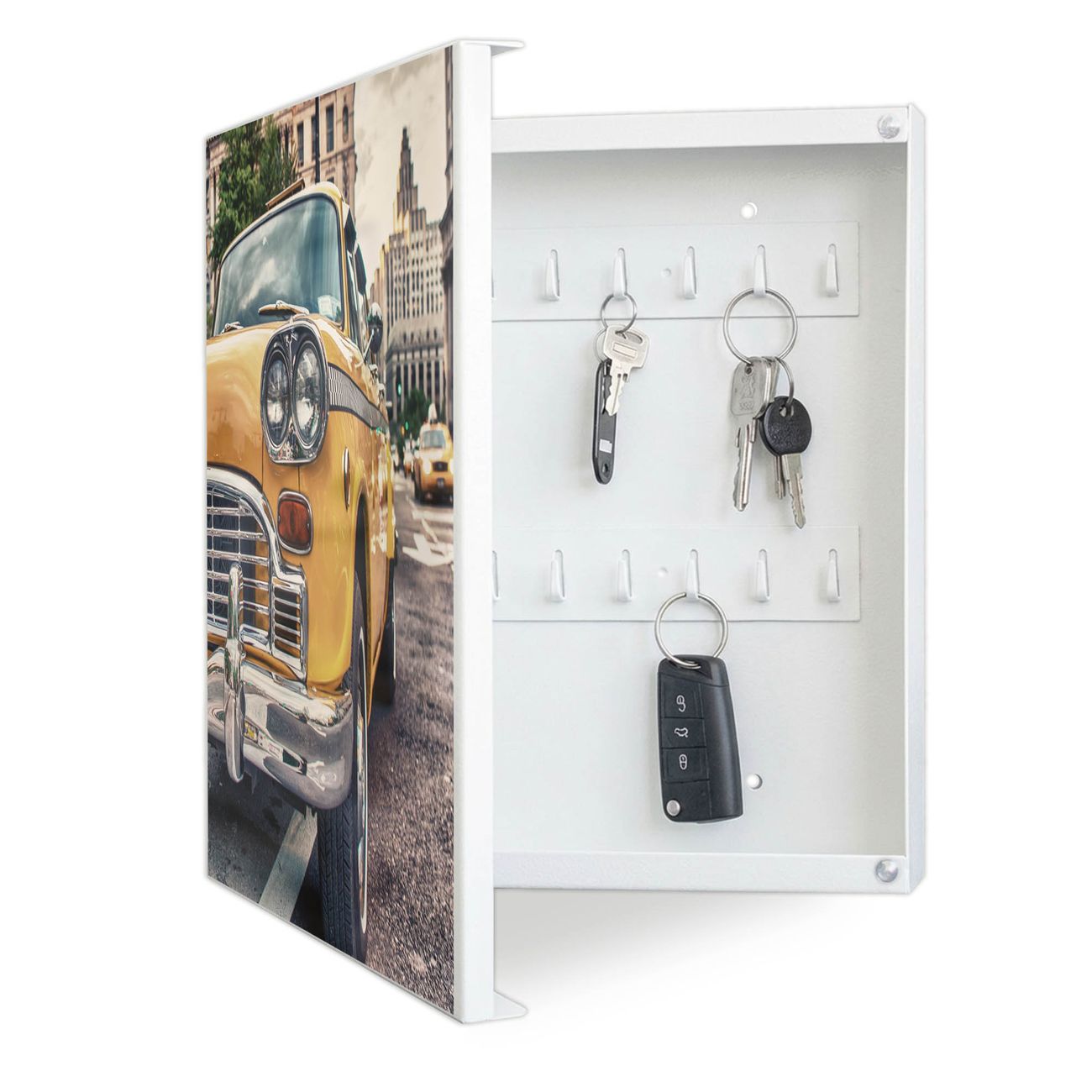 Bringe Ordnung und Eleganz in deinen Eingangsbereich mit dem banjado Schlüsselkasten Motiv Motiv Yellow Cab. Die moderne Schlüsselbox kombiniert funktionales Design mit hochwertiger Verarbeitung und wird so zu einem echten Hingucker in Flur, Büro oder Ferienwohnung. ✅ Stilvolle Schlüsselaufbewahrung mit Motiv Motiv Yellow Cab Der Design-Schlüsselkasten Motiv Motiv Yellow Cab bietet Platz für bis zu 32 Schlüssel, die auf 4 stabilen Reihen mit je 8 Haken übersichtlich verstaut werden. Mit seinen kompakten Maßen von 30 x 30 x 5 cm passt die Schlüsselbox perfekt auch in kleinere Räume. Der weiß lackierte Stahlkorpus mit links angeschlagenem Türscharnier harmoniert mit gedruckten Folie auf der Front und fügt sich nahtlos in jedes Wohnambiente ein. Ob als Schlüsselorganizer für Zuhause oder als praktische Lösung für Büros, Praxen und Gewerbe, der banjado Schlüsselkasten sorgt für Ordnung und Übersicht. Dank der magnetischen, mit Kreidestiften beschreibbaren Folie auf der Front kannst du Notizen anheften oder Termine direkt auf der Oberfläche festhalten. Die Schlüsselbox Motiv Motiv Yellow Cab zur Wandmontage wird inklusive Befestigungsmaterial geliefert und ist schnell angebracht. So hast du deine Schlüssel jederzeit griffbereit und zugleich stilvoll verstaut. Mit diesem banjado Schlüsselkasten Motiv Motiv Yellow Cab kombinierst du praktische Aufbewahrung mit stilvollem Wohndesign. Ob privat oder geschäftlich, die Schlüsselbox sorgt für mehr Ordnung, Übersicht und ein wohnliches Ambiente.Vorteile im Überblick