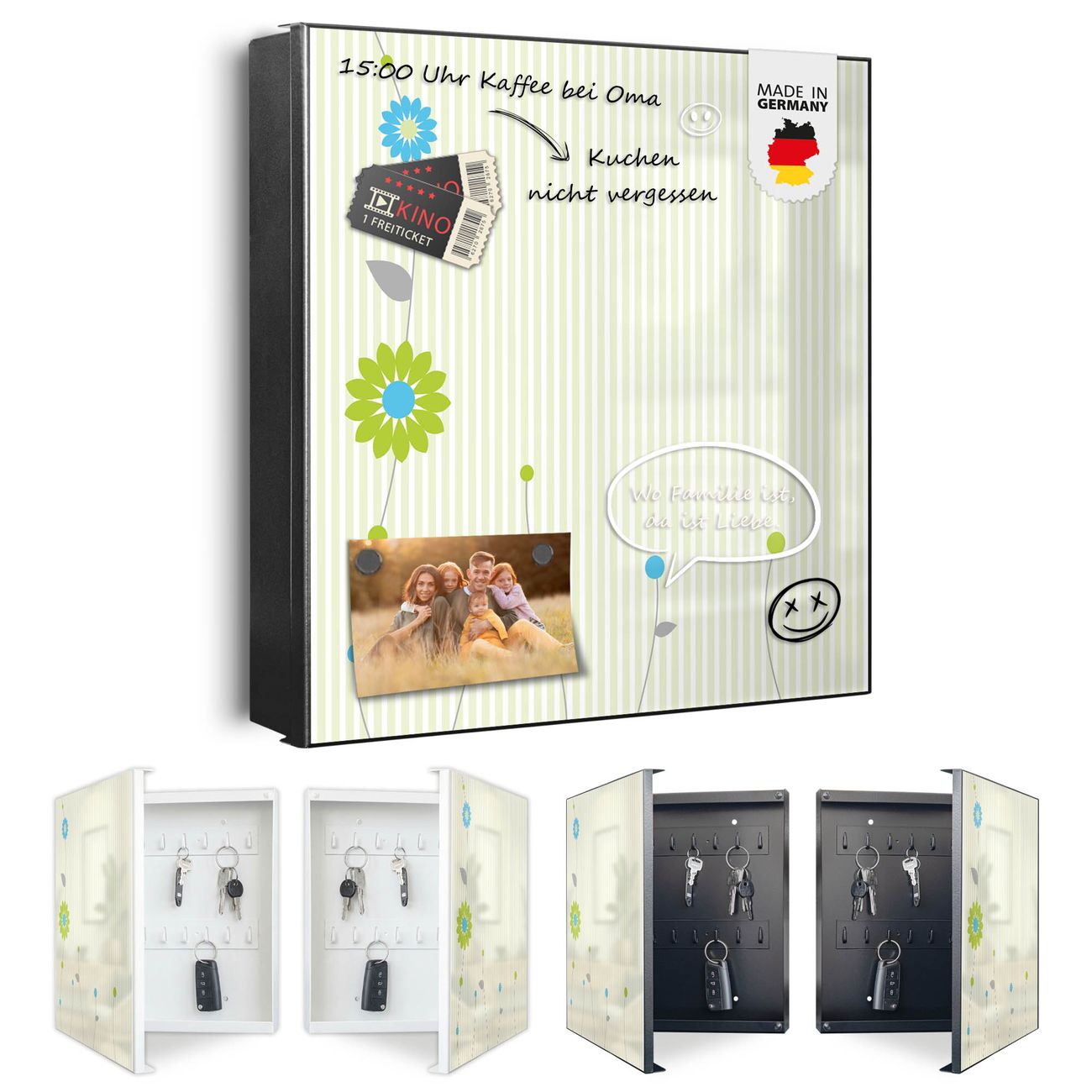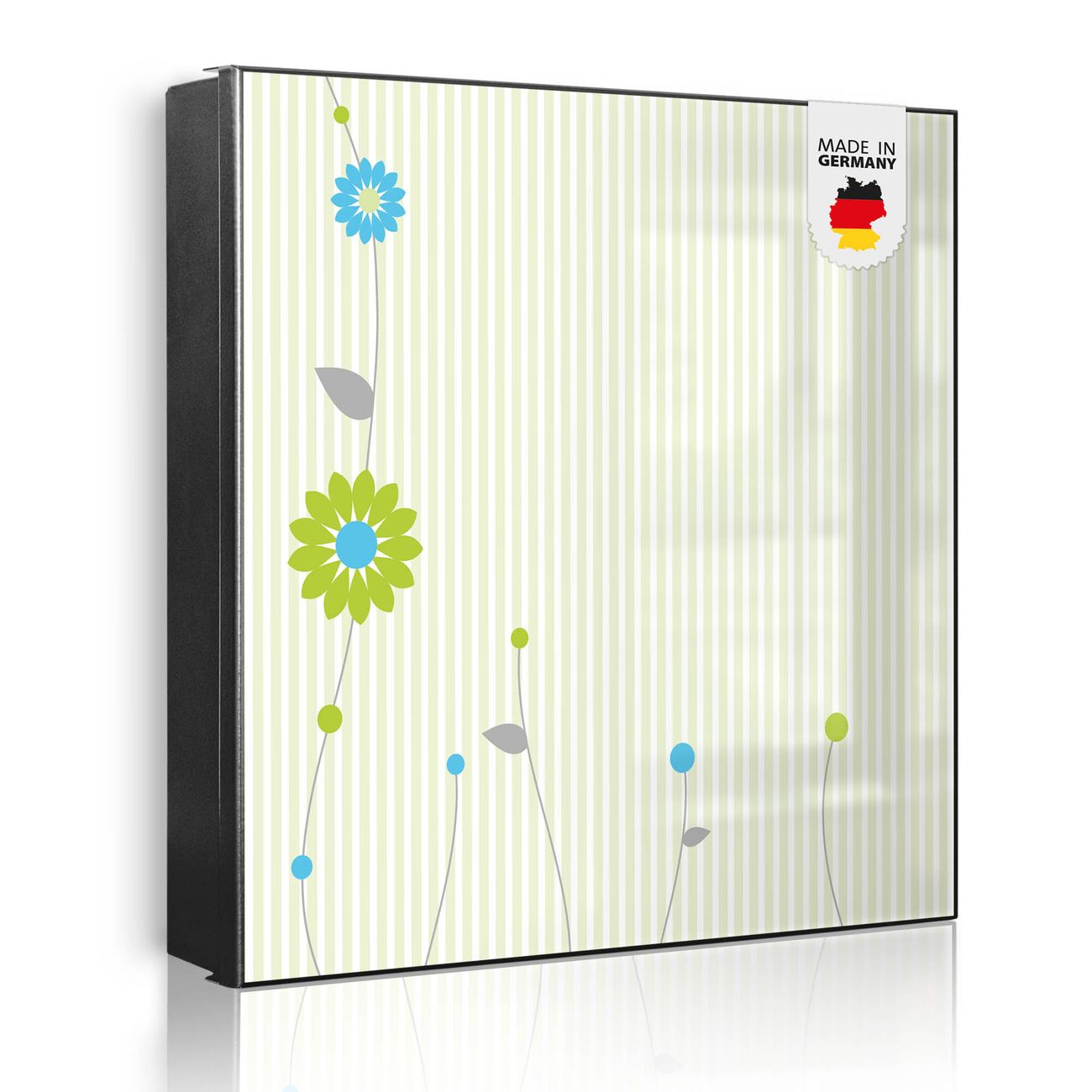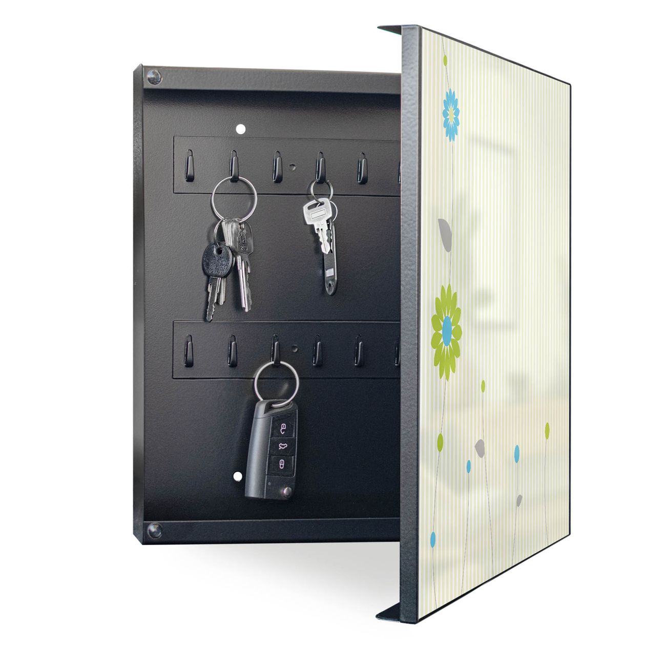 Bringe Ordnung und Eleganz in deinen Eingangsbereich mit dem banjado Schlüsselkasten Motiv Motiv Zarte Blumen. Die moderne Schlüsselbox kombiniert funktionales Design mit hochwertiger Verarbeitung und wird so zu einem echten Hingucker in Flur, Büro oder Ferienwohnung. ✅ Stilvolle Schlüsselaufbewahrung mit Motiv Motiv Zarte Blumen Der Design-Schlüsselkasten Motiv Motiv Zarte Blumen bietet Platz für bis zu 32 Schlüssel, die auf 4 stabilen Reihen mit je 8 Haken übersichtlich verstaut werden. Mit seinen kompakten Maßen von 30 x 30 x 5 cm passt die Schlüsselbox perfekt auch in kleinere Räume. Der schwarz lackierte Stahlkorpus mit rechts angeschlagenem Türscharnier harmoniert mit gedruckten Folie auf der Front und fügt sich nahtlos in jedes Wohnambiente ein. Ob als Schlüsselorganizer für Zuhause oder als praktische Lösung für Büros, Praxen und Gewerbe, der banjado Schlüsselkasten sorgt für Ordnung und Übersicht. Dank der magnetischen, mit Kreidestiften beschreibbaren Folie auf der Front kannst du Notizen anheften oder Termine direkt auf der Oberfläche festhalten. Die Schlüsselbox Motiv Motiv Zarte Blumen zur Wandmontage wird inklusive Befestigungsmaterial geliefert und ist schnell angebracht. So hast du deine Schlüssel jederzeit griffbereit und zugleich stilvoll verstaut. Mit diesem banjado Schlüsselkasten Motiv Motiv Zarte Blumen kombinierst du praktische Aufbewahrung mit stilvollem Wohndesign. Ob privat oder geschäftlich, die Schlüsselbox sorgt für mehr Ordnung, Übersicht und ein wohnliches Ambiente.Vorteile im Überblick