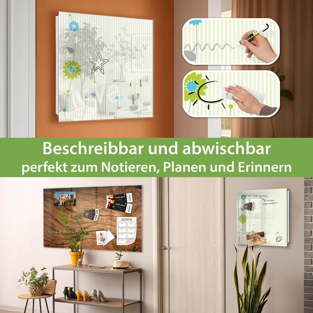 Bringe Ordnung und Eleganz in deinen Eingangsbereich mit dem banjado Schlüsselkasten Motiv Motiv Zarte Blumen. Die moderne Schlüsselbox kombiniert funktionales Design mit hochwertiger Verarbeitung und wird so zu einem echten Hingucker in Flur, Büro oder Ferienwohnung. ✅ Stilvolle Schlüsselaufbewahrung mit Glasfront im Motiv Motiv Zarte Blumen Der Design-Schlüsselkasten Motiv Motiv Zarte Blumen bietet Platz für bis zu 50 Schlüssel, die auf 5 stabilen Reihen mit je 10 Haken übersichtlich verstaut werden. Mit seinen kompakten Maßen von 30 x 30 x 5 cm passt die Schlüsselbox perfekt auch in kleinere Räume. Der weiß lackierte Stahlkorpus mit rechts angeschlagenem Türscharnier harmoniert mit der Glasfront und fügt sich nahtlos in jedes Wohnambiente ein. Ob als Schlüsselorganizer für Zuhause oder als praktische Lösung für Büros, Praxen und Gewerbe, der banjado Schlüsselkasten sorgt für Ordnung und Übersicht. Dank der magnetischen, mit Kreidestiften beschreibbaren Glasfront kannst du Notizen anheften oder Termine direkt auf der Oberfläche festhalten. Die Schlüsselbox Motiv Motiv Zarte Blumen zur Wandmontage wird inklusive Befestigungsmaterial geliefert und ist schnell angebracht. So hast du deine Schlüssel jederzeit griffbereit und zugleich stilvoll verstaut. Mit diesem banjado Schlüsselkasten Motiv Motiv Zarte Blumen kombinierst du praktische Aufbewahrung mit stilvollem Wohndesign. Ob privat oder geschäftlich, die Schlüsselbox sorgt für mehr Ordnung, Übersicht und ein wohnliches Ambiente.Vorteile im Überblick