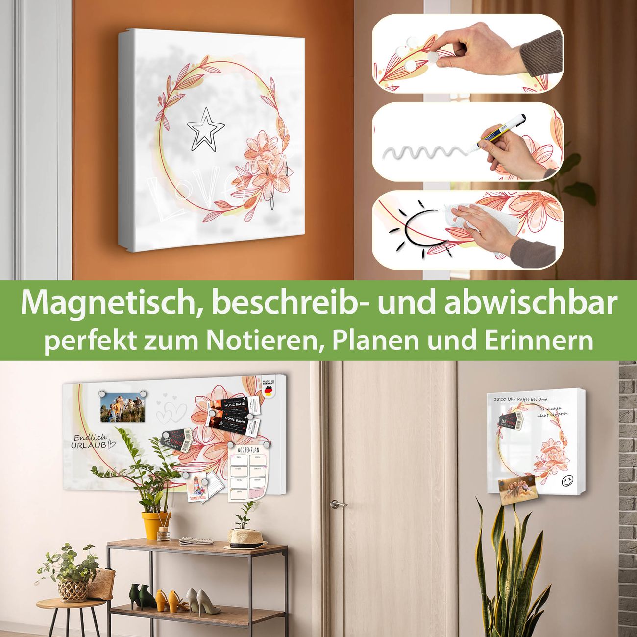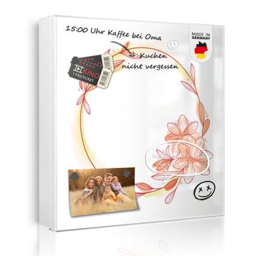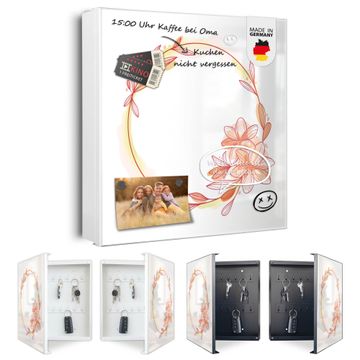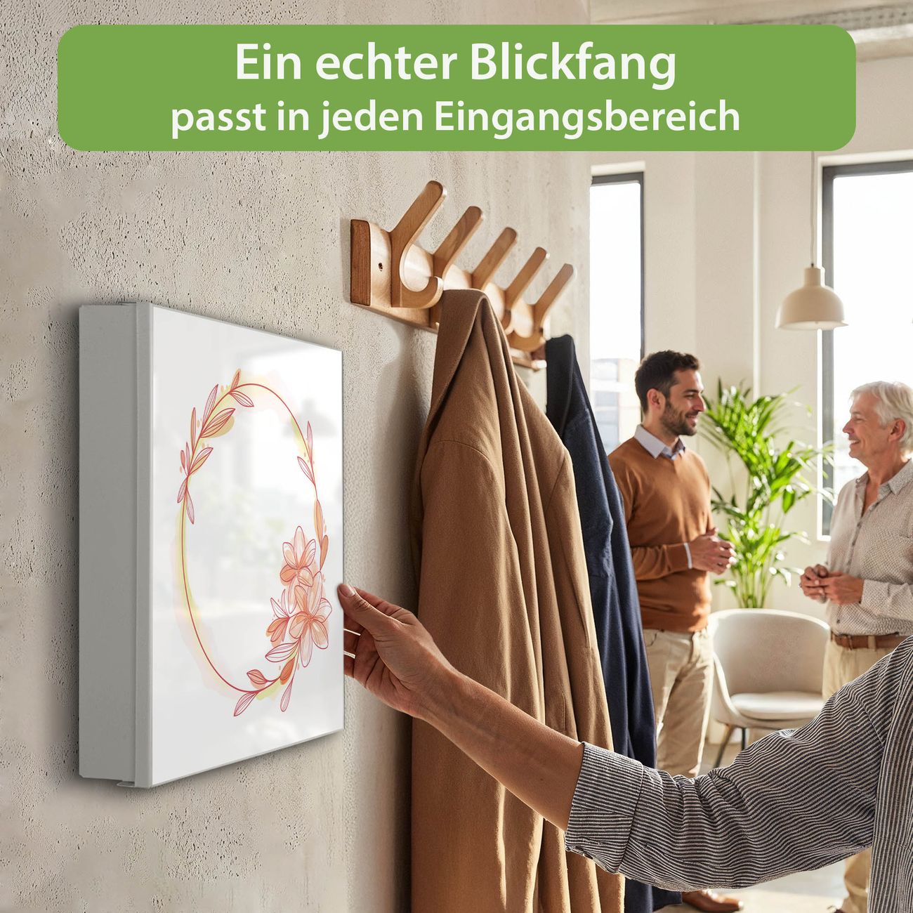 Bringe Ordnung und Eleganz in deinen Eingangsbereich mit dem banjado Schlüsselkasten Motiv Motiv Zarter Blütenkranz. Die moderne Schlüsselbox kombiniert funktionales Design mit hochwertiger Verarbeitung und wird so zu einem echten Hingucker in Flur, Büro oder Ferienwohnung. ✅ Stilvolle Schlüsselaufbewahrung mit Motiv Motiv Zarter Blütenkranz Der Design-Schlüsselkasten Motiv Motiv Zarter Blütenkranz bietet Platz für bis zu 32 Schlüssel, die auf 4 stabilen Reihen mit je 8 Haken übersichtlich verstaut werden. Mit seinen kompakten Maßen von 30 x 30 x 5 cm passt die Schlüsselbox perfekt auch in kleinere Räume. Der weiß lackierte Stahlkorpus mit rechts angeschlagenem Türscharnier harmoniert mit gedruckten Folie auf der Front und fügt sich nahtlos in jedes Wohnambiente ein. Ob als Schlüsselorganizer für Zuhause oder als praktische Lösung für Büros, Praxen und Gewerbe, der banjado Schlüsselkasten sorgt für Ordnung und Übersicht. Dank der magnetischen, mit Kreidestiften beschreibbaren Folie auf der Front kannst du Notizen anheften oder Termine direkt auf der Oberfläche festhalten. Die Schlüsselbox Motiv Motiv Zarter Blütenkranz zur Wandmontage wird inklusive Befestigungsmaterial geliefert und ist schnell angebracht. So hast du deine Schlüssel jederzeit griffbereit und zugleich stilvoll verstaut. Mit diesem banjado Schlüsselkasten Motiv Motiv Zarter Blütenkranz kombinierst du praktische Aufbewahrung mit stilvollem Wohndesign. Ob privat oder geschäftlich, die Schlüsselbox sorgt für mehr Ordnung, Übersicht und ein wohnliches Ambiente.Vorteile im Überblick
