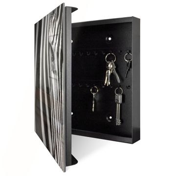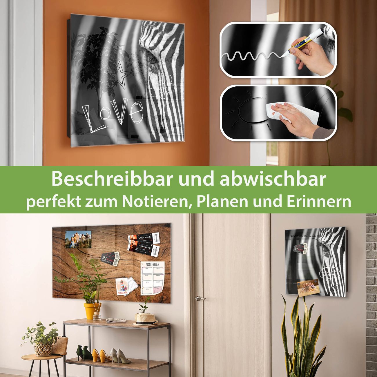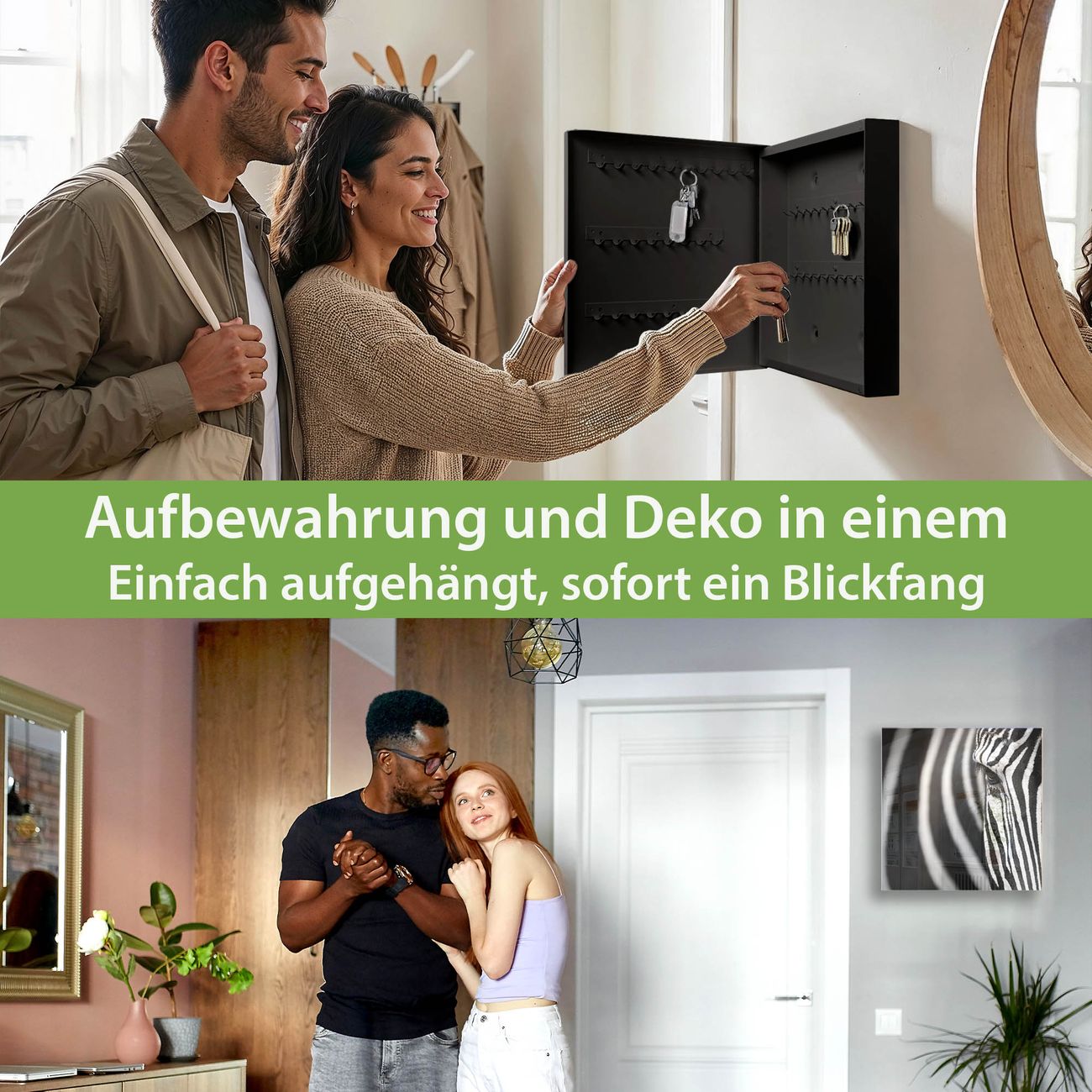 Bringe Ordnung und Eleganz in deinen Eingangsbereich mit dem banjado Schlüsselkasten Motiv Motiv Zebra En Face. Die moderne Schlüsselbox kombiniert funktionales Design mit hochwertiger Verarbeitung und wird so zu einem echten Hingucker in Flur, Büro oder Ferienwohnung. ✅ Stilvolle Schlüsselaufbewahrung mit Glasfront im Motiv Motiv Zebra En Face Der Design-Schlüsselkasten Motiv Motiv Zebra En Face bietet Platz für bis zu 50 Schlüssel, die auf 5 stabilen Reihen mit je 10 Haken übersichtlich verstaut werden. Mit seinen kompakten Maßen von 30 x 30 x 5 cm passt die Schlüsselbox perfekt auch in kleinere Räume. Der schwarz lackierte Stahlkorpus mit rechts angeschlagenem Türscharnier harmoniert mit der Glasfront und fügt sich nahtlos in jedes Wohnambiente ein. Ob als Schlüsselorganizer für Zuhause oder als praktische Lösung für Büros, Praxen und Gewerbe, der banjado Schlüsselkasten sorgt für Ordnung und Übersicht. Dank der magnetischen, mit Kreidestiften beschreibbaren Glasfront kannst du Notizen anheften oder Termine direkt auf der Oberfläche festhalten. Die Schlüsselbox Motiv Motiv Zebra En Face zur Wandmontage wird inklusive Befestigungsmaterial geliefert und ist schnell angebracht. So hast du deine Schlüssel jederzeit griffbereit und zugleich stilvoll verstaut. Mit diesem banjado Schlüsselkasten Motiv Motiv Zebra En Face kombinierst du praktische Aufbewahrung mit stilvollem Wohndesign. Ob privat oder geschäftlich, die Schlüsselbox sorgt für mehr Ordnung, Übersicht und ein wohnliches Ambiente.Vorteile im Überblick