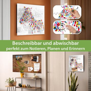 Bringe Ordnung und Eleganz in deinen Eingangsbereich mit dem banjado Schlüsselkasten Motiv Motiv Zebra. Die moderne Schlüsselbox kombiniert funktionales Design mit hochwertiger Verarbeitung und wird so zu einem echten Hingucker in Flur, Büro oder Ferienwohnung. ✅ Stilvolle Schlüsselaufbewahrung mit Glasfront im Motiv Motiv Zebra Der Design-Schlüsselkasten Motiv Motiv Zebra bietet Platz für bis zu 50 Schlüssel, die auf 5 stabilen Reihen mit je 10 Haken übersichtlich verstaut werden. Mit seinen kompakten Maßen von 30 x 30 x 5 cm passt die Schlüsselbox perfekt auch in kleinere Räume. Der schwarz lackierte Stahlkorpus mit rechts angeschlagenem Türscharnier harmoniert mit der Glasfront und fügt sich nahtlos in jedes Wohnambiente ein. Ob als Schlüsselorganizer für Zuhause oder als praktische Lösung für Büros, Praxen und Gewerbe, der banjado Schlüsselkasten sorgt für Ordnung und Übersicht. Dank der magnetischen, mit Kreidestiften beschreibbaren Glasfront kannst du Notizen anheften oder Termine direkt auf der Oberfläche festhalten. Die Schlüsselbox Motiv Motiv Zebra zur Wandmontage wird inklusive Befestigungsmaterial geliefert und ist schnell angebracht. So hast du deine Schlüssel jederzeit griffbereit und zugleich stilvoll verstaut. Mit diesem banjado Schlüsselkasten Motiv Motiv Zebra kombinierst du praktische Aufbewahrung mit stilvollem Wohndesign. Ob privat oder geschäftlich, die Schlüsselbox sorgt für mehr Ordnung, Übersicht und ein wohnliches Ambiente.Vorteile im Überblick