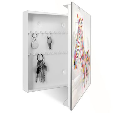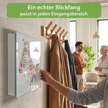 Bringe Ordnung und Eleganz in deinen Eingangsbereich mit dem banjado Schlüsselkasten Motiv Motiv Zebra. Die moderne Schlüsselbox kombiniert funktionales Design mit hochwertiger Verarbeitung und wird so zu einem echten Hingucker in Flur, Büro oder Ferienwohnung. ✅ Stilvolle Schlüsselaufbewahrung mit Glasfront im Motiv Motiv Zebra Der Design-Schlüsselkasten Motiv Motiv Zebra bietet Platz für bis zu 50 Schlüssel, die auf 5 stabilen Reihen mit je 10 Haken übersichtlich verstaut werden. Mit seinen kompakten Maßen von 30 x 30 x 5 cm passt die Schlüsselbox perfekt auch in kleinere Räume. Der weiß lackierte Stahlkorpus mit rechts angeschlagenem Türscharnier harmoniert mit der Glasfront und fügt sich nahtlos in jedes Wohnambiente ein. Ob als Schlüsselorganizer für Zuhause oder als praktische Lösung für Büros, Praxen und Gewerbe, der banjado Schlüsselkasten sorgt für Ordnung und Übersicht. Dank der magnetischen, mit Kreidestiften beschreibbaren Glasfront kannst du Notizen anheften oder Termine direkt auf der Oberfläche festhalten. Die Schlüsselbox Motiv Motiv Zebra zur Wandmontage wird inklusive Befestigungsmaterial geliefert und ist schnell angebracht. So hast du deine Schlüssel jederzeit griffbereit und zugleich stilvoll verstaut. Mit diesem banjado Schlüsselkasten Motiv Motiv Zebra kombinierst du praktische Aufbewahrung mit stilvollem Wohndesign. Ob privat oder geschäftlich, die Schlüsselbox sorgt für mehr Ordnung, Übersicht und ein wohnliches Ambiente.Vorteile im Überblick
