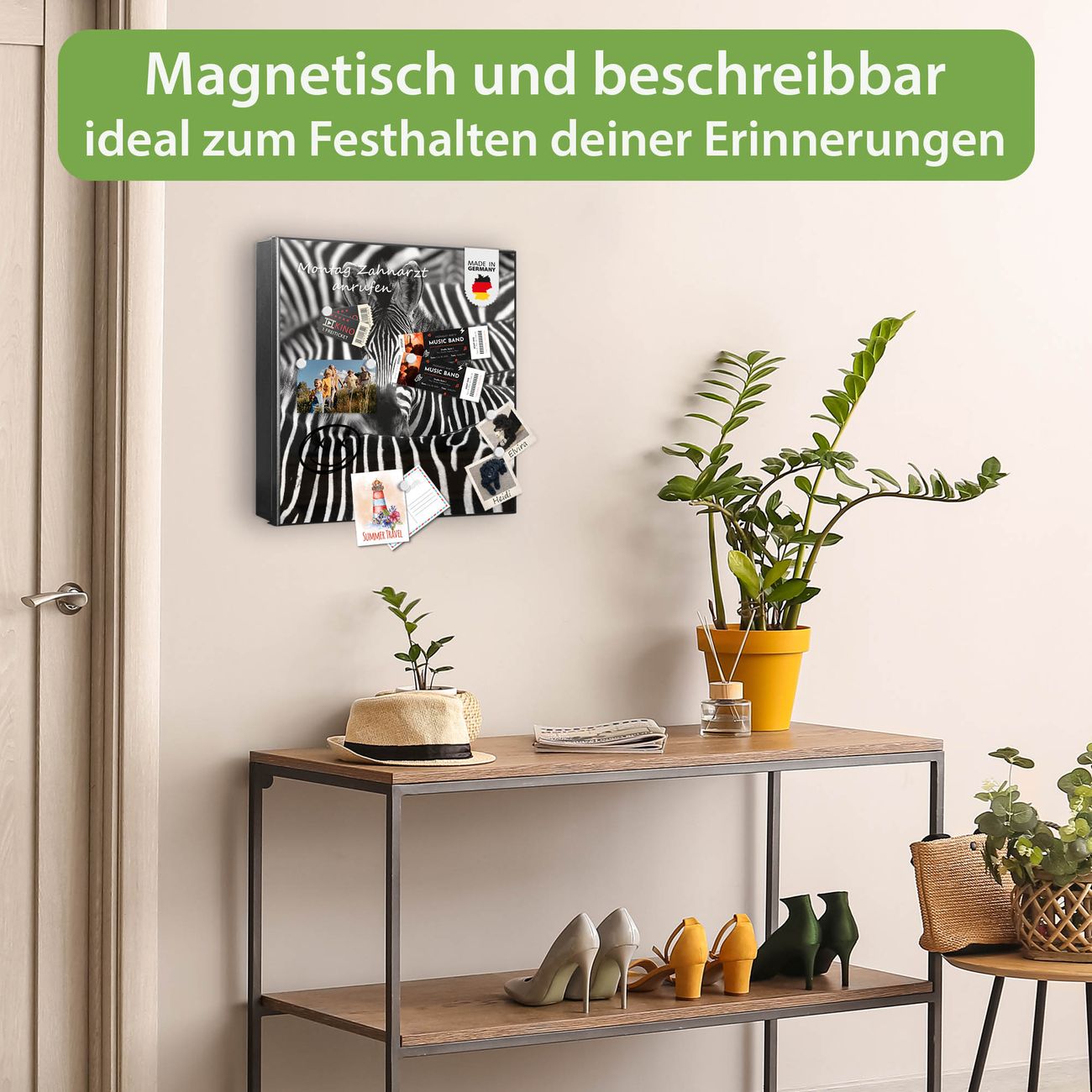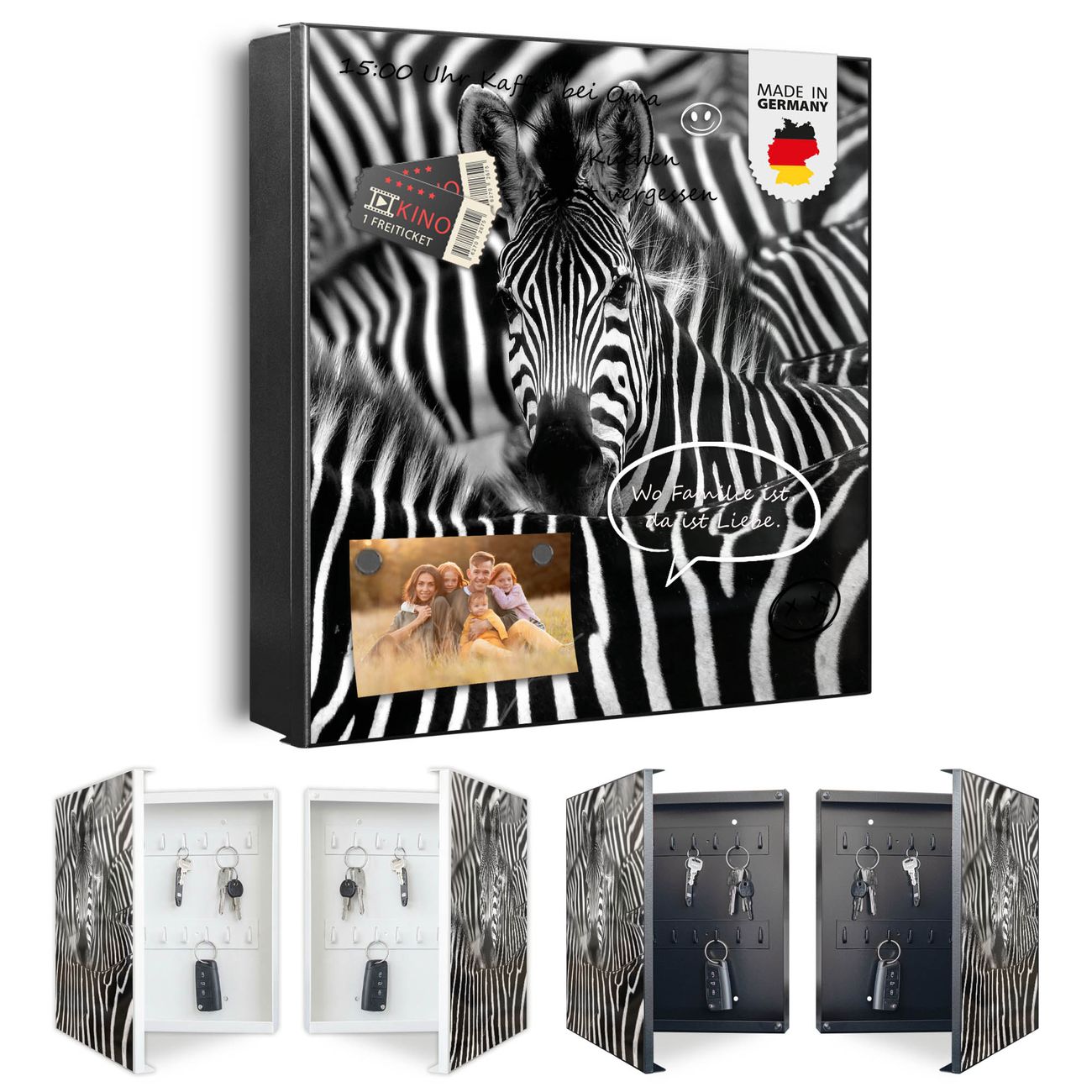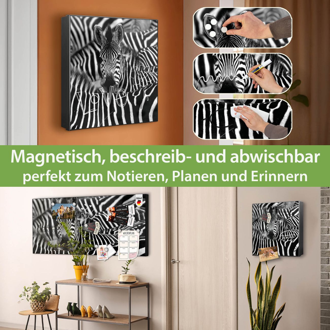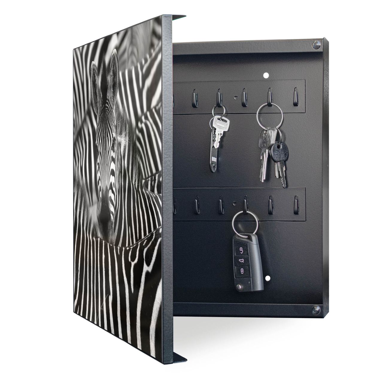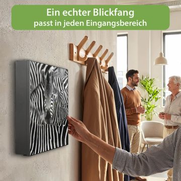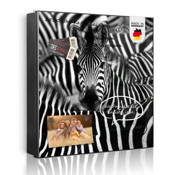 Bringe Ordnung und Eleganz in deinen Eingangsbereich mit dem banjado Schlüsselkasten Motiv Motiv Zebras. Die moderne Schlüsselbox kombiniert funktionales Design mit hochwertiger Verarbeitung und wird so zu einem echten Hingucker in Flur, Büro oder Ferienwohnung. ✅ Stilvolle Schlüsselaufbewahrung mit Motiv Motiv Zebras Der Design-Schlüsselkasten Motiv Motiv Zebras bietet Platz für bis zu 32 Schlüssel, die auf 4 stabilen Reihen mit je 8 Haken übersichtlich verstaut werden. Mit seinen kompakten Maßen von 30 x 30 x 5 cm passt die Schlüsselbox perfekt auch in kleinere Räume. Der schwarz lackierte Stahlkorpus mit links angeschlagenem Türscharnier harmoniert mit gedruckten Folie auf der Front und fügt sich nahtlos in jedes Wohnambiente ein. Ob als Schlüsselorganizer für Zuhause oder als praktische Lösung für Büros, Praxen und Gewerbe, der banjado Schlüsselkasten sorgt für Ordnung und Übersicht. Dank der magnetischen, mit Kreidestiften beschreibbaren Folie auf der Front kannst du Notizen anheften oder Termine direkt auf der Oberfläche festhalten. Die Schlüsselbox Motiv Motiv Zebras zur Wandmontage wird inklusive Befestigungsmaterial geliefert und ist schnell angebracht. So hast du deine Schlüssel jederzeit griffbereit und zugleich stilvoll verstaut. Mit diesem banjado Schlüsselkasten Motiv Motiv Zebras kombinierst du praktische Aufbewahrung mit stilvollem Wohndesign. Ob privat oder geschäftlich, die Schlüsselbox sorgt für mehr Ordnung, Übersicht und ein wohnliches Ambiente.Vorteile im Überblick