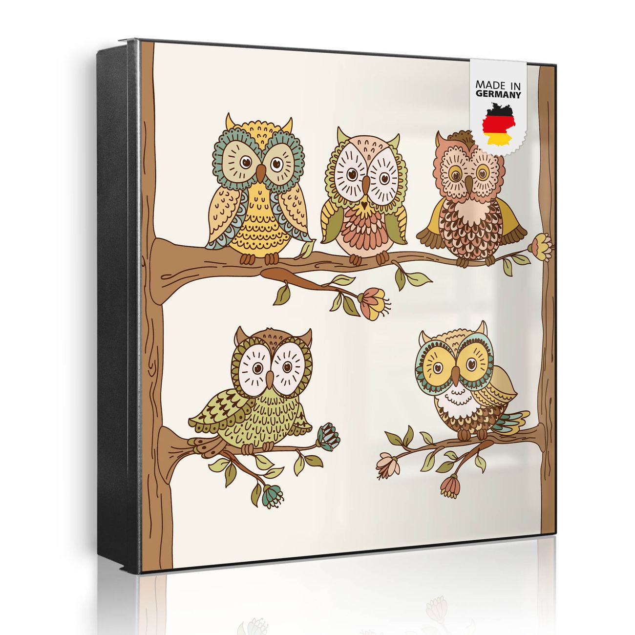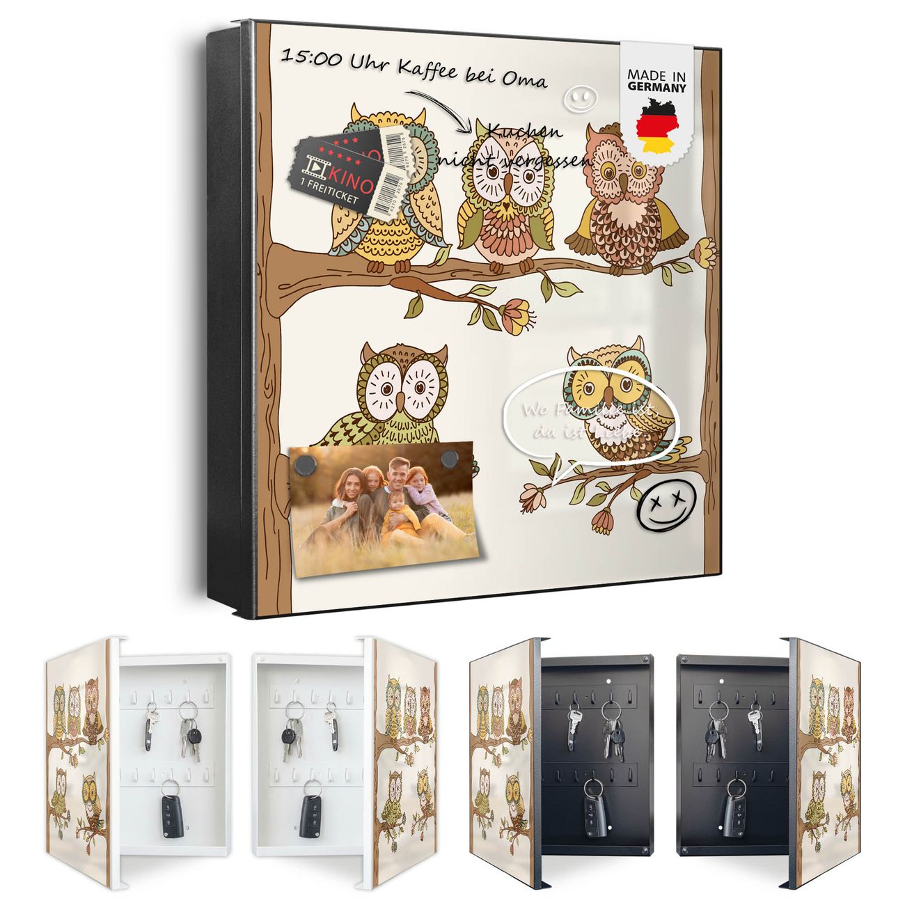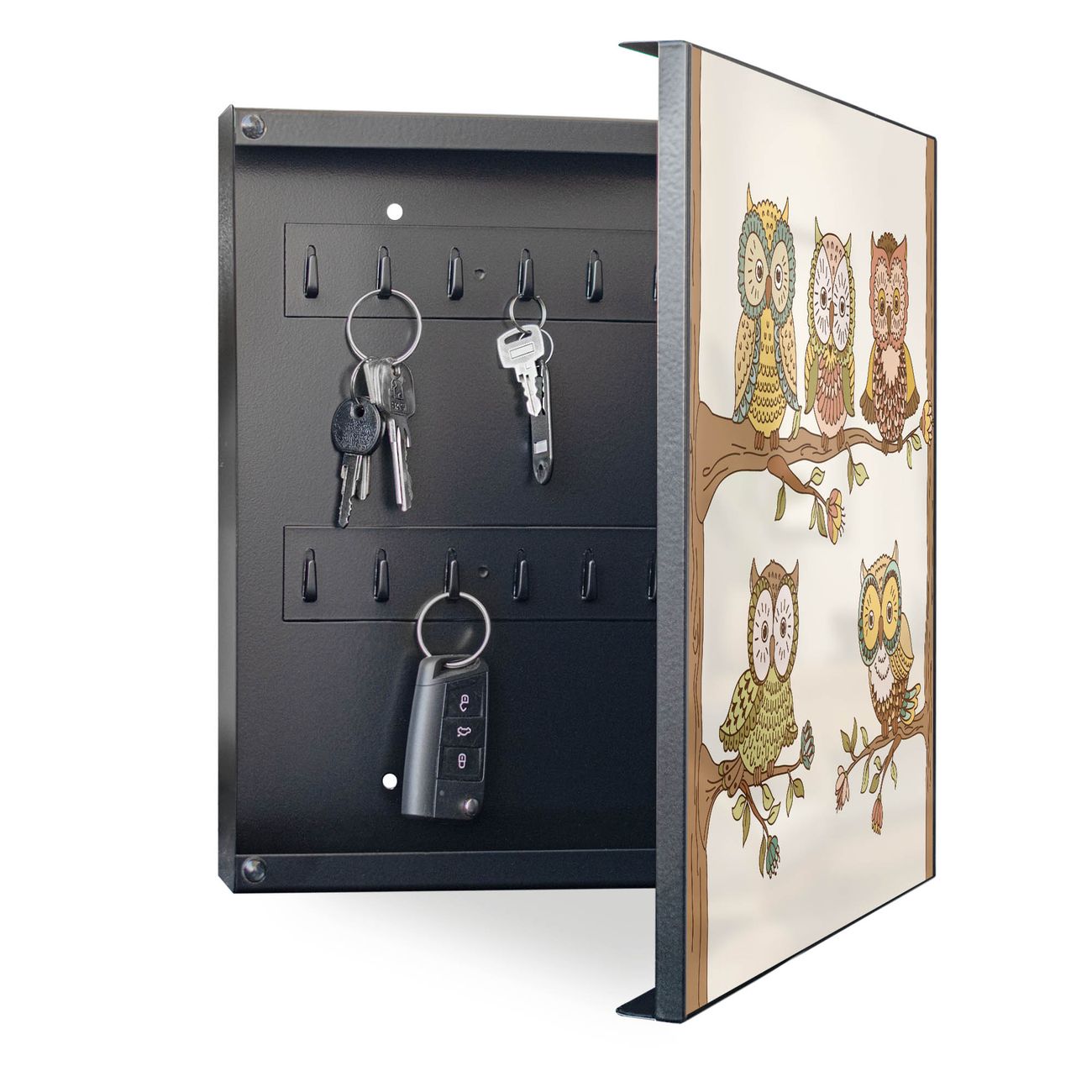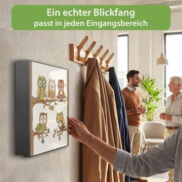 Bringe Ordnung und Eleganz in deinen Eingangsbereich mit dem banjado Schlüsselkasten Motiv Motiv Zehn-Augen-Prinzip. Die moderne Schlüsselbox kombiniert funktionales Design mit hochwertiger Verarbeitung und wird so zu einem echten Hingucker in Flur, Büro oder Ferienwohnung. ✅ Stilvolle Schlüsselaufbewahrung mit Motiv Motiv Zehn-Augen-Prinzip Der Design-Schlüsselkasten Motiv Motiv Zehn-Augen-Prinzip bietet Platz für bis zu 32 Schlüssel, die auf 4 stabilen Reihen mit je 8 Haken übersichtlich verstaut werden. Mit seinen kompakten Maßen von 30 x 30 x 5 cm passt die Schlüsselbox perfekt auch in kleinere Räume. Der schwarz lackierte Stahlkorpus mit rechts angeschlagenem Türscharnier harmoniert mit gedruckten Folie auf der Front und fügt sich nahtlos in jedes Wohnambiente ein. Ob als Schlüsselorganizer für Zuhause oder als praktische Lösung für Büros, Praxen und Gewerbe, der banjado Schlüsselkasten sorgt für Ordnung und Übersicht. Dank der magnetischen, mit Kreidestiften beschreibbaren Folie auf der Front kannst du Notizen anheften oder Termine direkt auf der Oberfläche festhalten. Die Schlüsselbox Motiv Motiv Zehn-Augen-Prinzip zur Wandmontage wird inklusive Befestigungsmaterial geliefert und ist schnell angebracht. So hast du deine Schlüssel jederzeit griffbereit und zugleich stilvoll verstaut. Mit diesem banjado Schlüsselkasten Motiv Motiv Zehn-Augen-Prinzip kombinierst du praktische Aufbewahrung mit stilvollem Wohndesign. Ob privat oder geschäftlich, die Schlüsselbox sorgt für mehr Ordnung, Übersicht und ein wohnliches Ambiente.Vorteile im Überblick