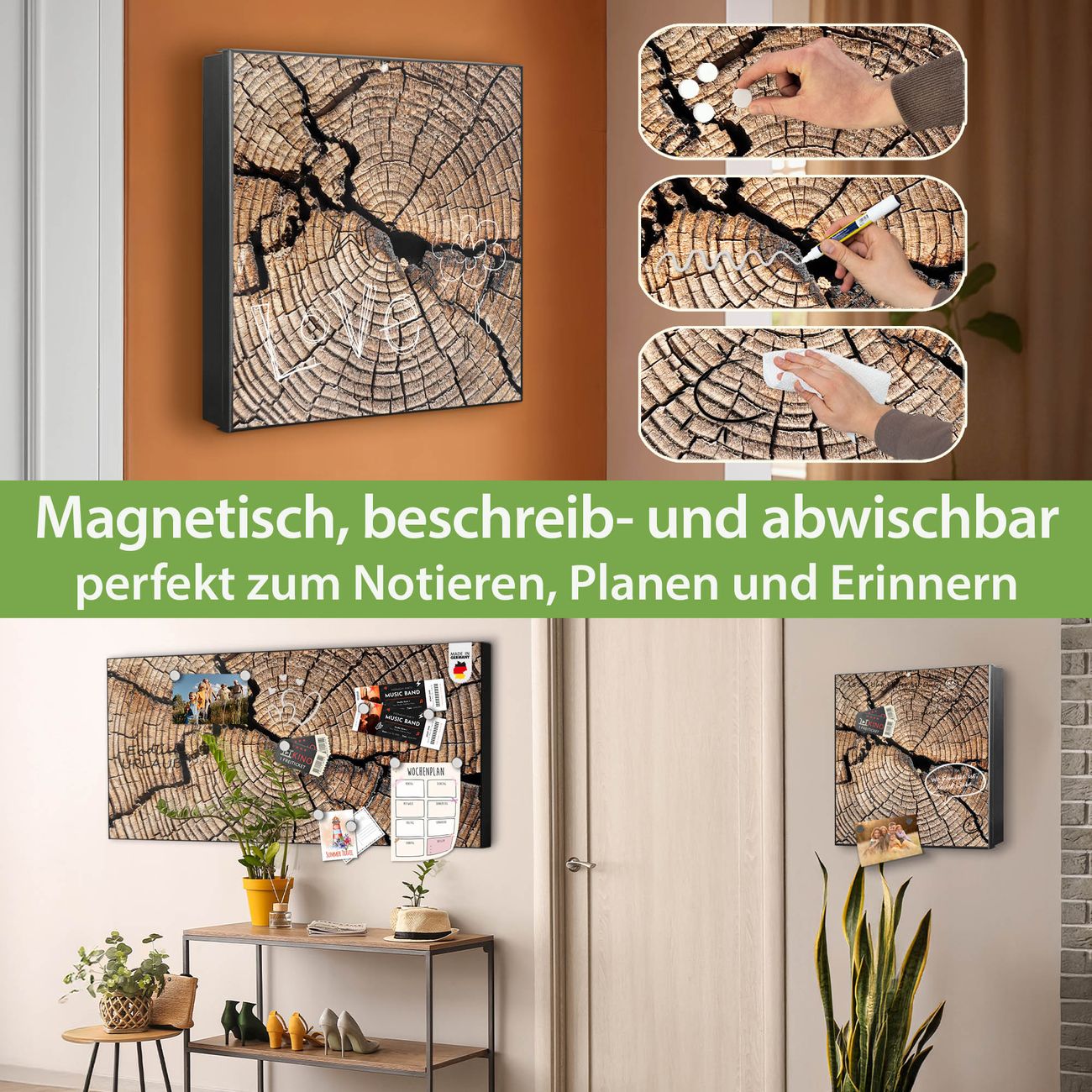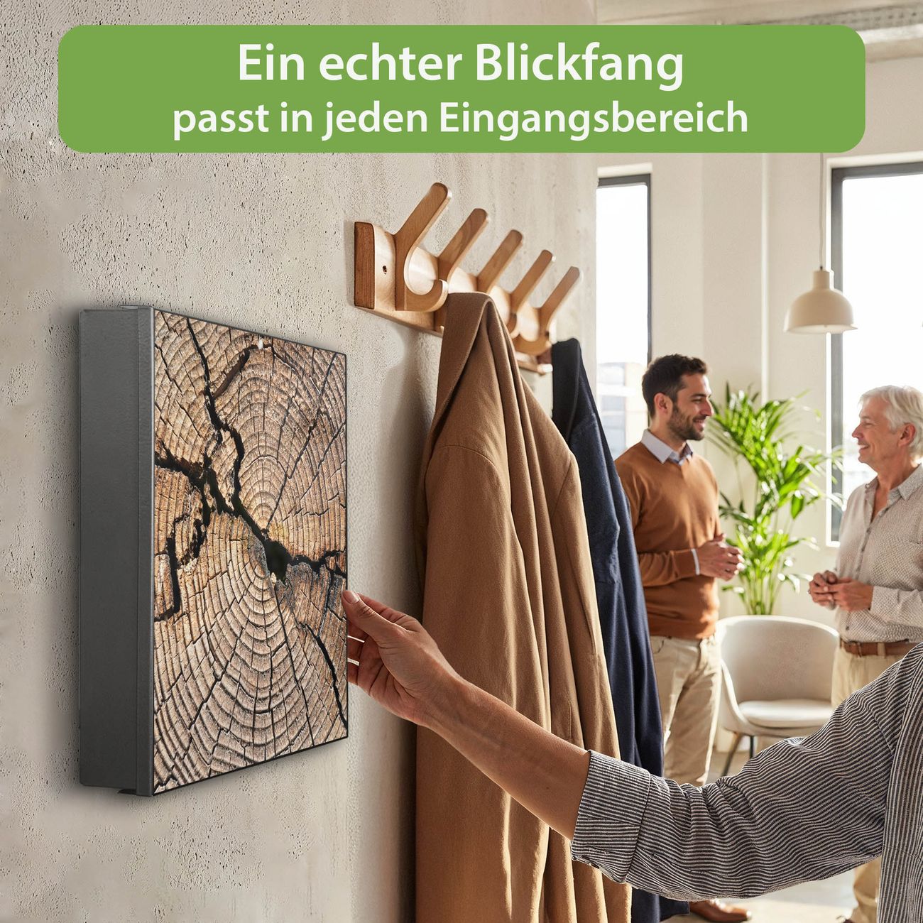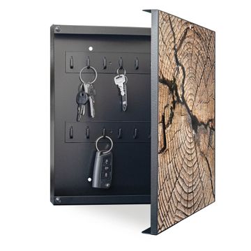 Bringe Ordnung und Eleganz in deinen Eingangsbereich mit dem banjado Schlüsselkasten Motiv Motiv Zeichen Der Zeit. Die moderne Schlüsselbox kombiniert funktionales Design mit hochwertiger Verarbeitung und wird so zu einem echten Hingucker in Flur, Büro oder Ferienwohnung. ✅ Stilvolle Schlüsselaufbewahrung mit Motiv Motiv Zeichen Der Zeit Der Design-Schlüsselkasten Motiv Motiv Zeichen Der Zeit bietet Platz für bis zu 32 Schlüssel, die auf 4 stabilen Reihen mit je 8 Haken übersichtlich verstaut werden. Mit seinen kompakten Maßen von 30 x 30 x 5 cm passt die Schlüsselbox perfekt auch in kleinere Räume. Der schwarz lackierte Stahlkorpus mit rechts angeschlagenem Türscharnier harmoniert mit gedruckten Folie auf der Front und fügt sich nahtlos in jedes Wohnambiente ein. Ob als Schlüsselorganizer für Zuhause oder als praktische Lösung für Büros, Praxen und Gewerbe, der banjado Schlüsselkasten sorgt für Ordnung und Übersicht. Dank der magnetischen, mit Kreidestiften beschreibbaren Folie auf der Front kannst du Notizen anheften oder Termine direkt auf der Oberfläche festhalten. Die Schlüsselbox Motiv Motiv Zeichen Der Zeit zur Wandmontage wird inklusive Befestigungsmaterial geliefert und ist schnell angebracht. So hast du deine Schlüssel jederzeit griffbereit und zugleich stilvoll verstaut. Mit diesem banjado Schlüsselkasten Motiv Motiv Zeichen Der Zeit kombinierst du praktische Aufbewahrung mit stilvollem Wohndesign. Ob privat oder geschäftlich, die Schlüsselbox sorgt für mehr Ordnung, Übersicht und ein wohnliches Ambiente.Vorteile im Überblick