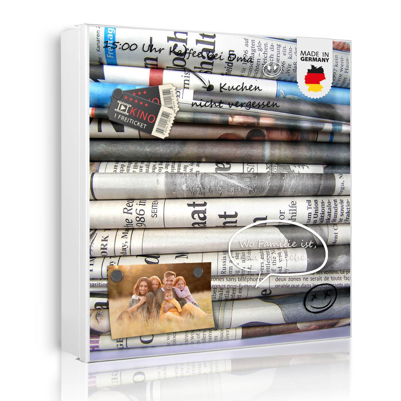 Bringe Ordnung und Eleganz in deinen Eingangsbereich mit dem banjado Schlüsselkasten Motiv Motiv Zeitungen. Die moderne Schlüsselbox kombiniert funktionales Design mit hochwertiger Verarbeitung und wird so zu einem echten Hingucker in Flur, Büro oder Ferienwohnung. ✅ Stilvolle Schlüsselaufbewahrung mit Motiv Motiv Zeitungen Der Design-Schlüsselkasten Motiv Motiv Zeitungen bietet Platz für bis zu 32 Schlüssel, die auf 4 stabilen Reihen mit je 8 Haken übersichtlich verstaut werden. Mit seinen kompakten Maßen von 30 x 30 x 5 cm passt die Schlüsselbox perfekt auch in kleinere Räume. Der weiß lackierte Stahlkorpus mit rechts angeschlagenem Türscharnier harmoniert mit gedruckten Folie auf der Front und fügt sich nahtlos in jedes Wohnambiente ein. Ob als Schlüsselorganizer für Zuhause oder als praktische Lösung für Büros, Praxen und Gewerbe, der banjado Schlüsselkasten sorgt für Ordnung und Übersicht. Dank der magnetischen, mit Kreidestiften beschreibbaren Folie auf der Front kannst du Notizen anheften oder Termine direkt auf der Oberfläche festhalten. Die Schlüsselbox Motiv Motiv Zeitungen zur Wandmontage wird inklusive Befestigungsmaterial geliefert und ist schnell angebracht. So hast du deine Schlüssel jederzeit griffbereit und zugleich stilvoll verstaut. Mit diesem banjado Schlüsselkasten Motiv Motiv Zeitungen kombinierst du praktische Aufbewahrung mit stilvollem Wohndesign. Ob privat oder geschäftlich, die Schlüsselbox sorgt für mehr Ordnung, Übersicht und ein wohnliches Ambiente.Vorteile im Überblick