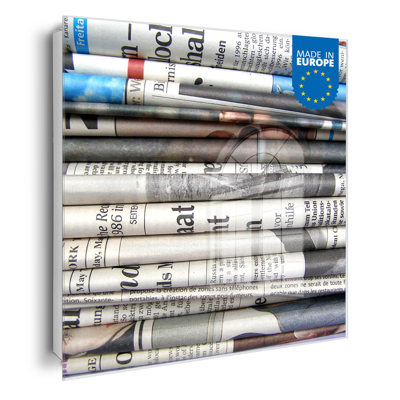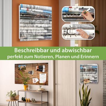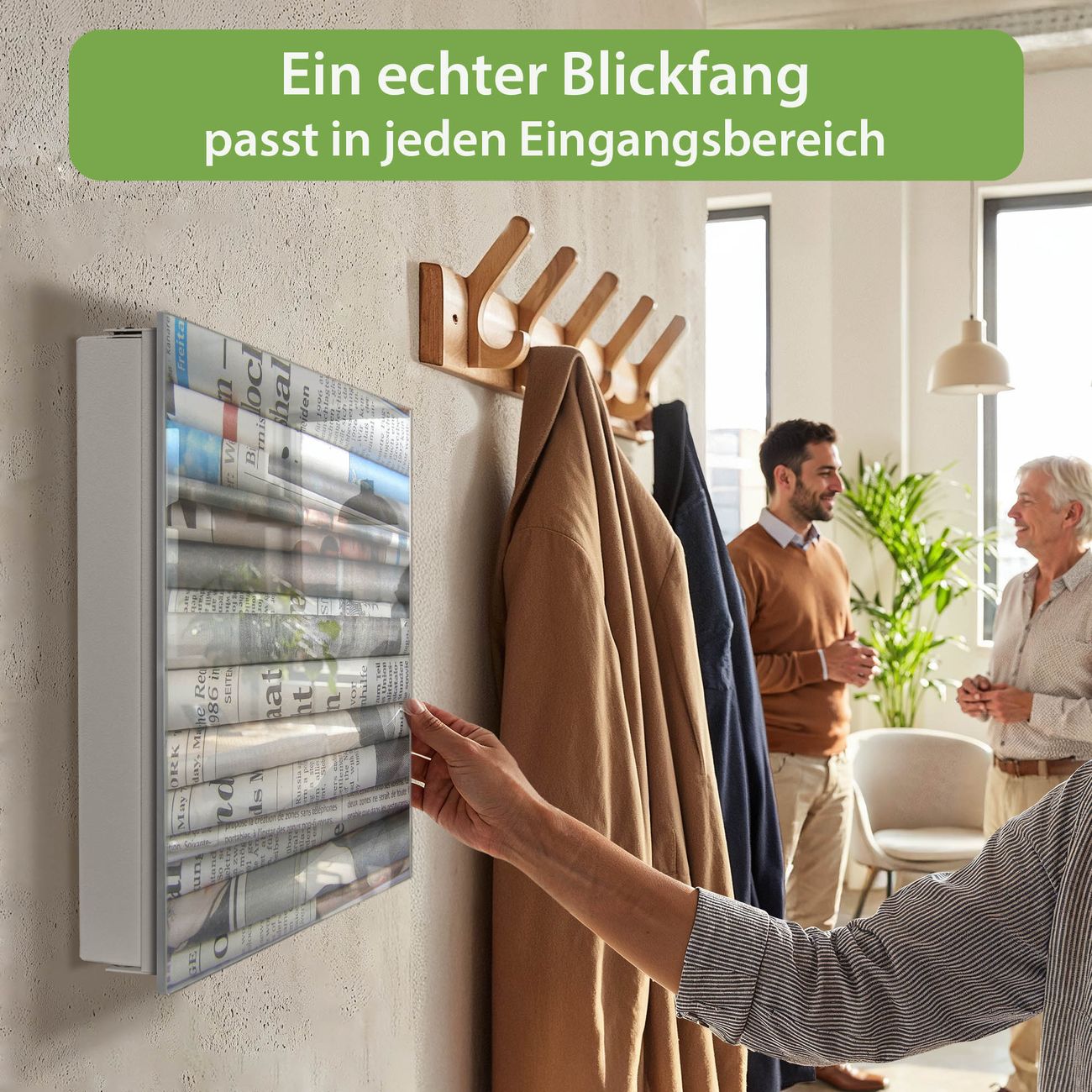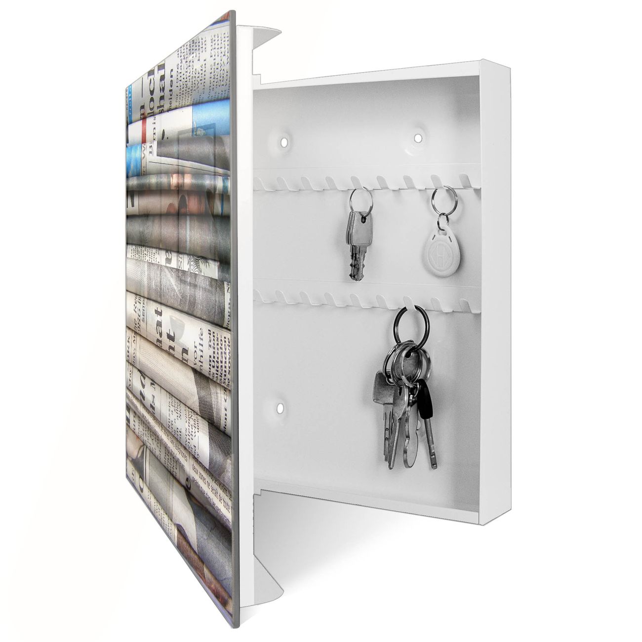 Bringe Ordnung und Eleganz in deinen Eingangsbereich mit dem banjado Schlüsselkasten Motiv Motiv Zeitungen. Die moderne Schlüsselbox kombiniert funktionales Design mit hochwertiger Verarbeitung und wird so zu einem echten Hingucker in Flur, Büro oder Ferienwohnung. ✅ Stilvolle Schlüsselaufbewahrung mit Glasfront im Motiv Motiv Zeitungen Der Design-Schlüsselkasten Motiv Motiv Zeitungen bietet Platz für bis zu 50 Schlüssel, die auf 5 stabilen Reihen mit je 10 Haken übersichtlich verstaut werden. Mit seinen kompakten Maßen von 30 x 30 x 5 cm passt die Schlüsselbox perfekt auch in kleinere Räume. Der weiß lackierte Stahlkorpus mit rechts angeschlagenem Türscharnier harmoniert mit der Glasfront und fügt sich nahtlos in jedes Wohnambiente ein. Ob als Schlüsselorganizer für Zuhause oder als praktische Lösung für Büros, Praxen und Gewerbe, der banjado Schlüsselkasten sorgt für Ordnung und Übersicht. Dank der magnetischen, mit Kreidestiften beschreibbaren Glasfront kannst du Notizen anheften oder Termine direkt auf der Oberfläche festhalten. Die Schlüsselbox Motiv Motiv Zeitungen zur Wandmontage wird inklusive Befestigungsmaterial geliefert und ist schnell angebracht. So hast du deine Schlüssel jederzeit griffbereit und zugleich stilvoll verstaut. Mit diesem banjado Schlüsselkasten Motiv Motiv Zeitungen kombinierst du praktische Aufbewahrung mit stilvollem Wohndesign. Ob privat oder geschäftlich, die Schlüsselbox sorgt für mehr Ordnung, Übersicht und ein wohnliches Ambiente.Vorteile im Überblick
