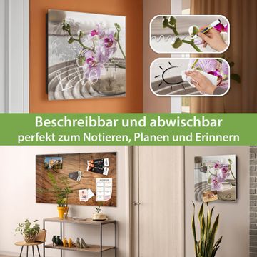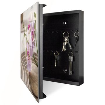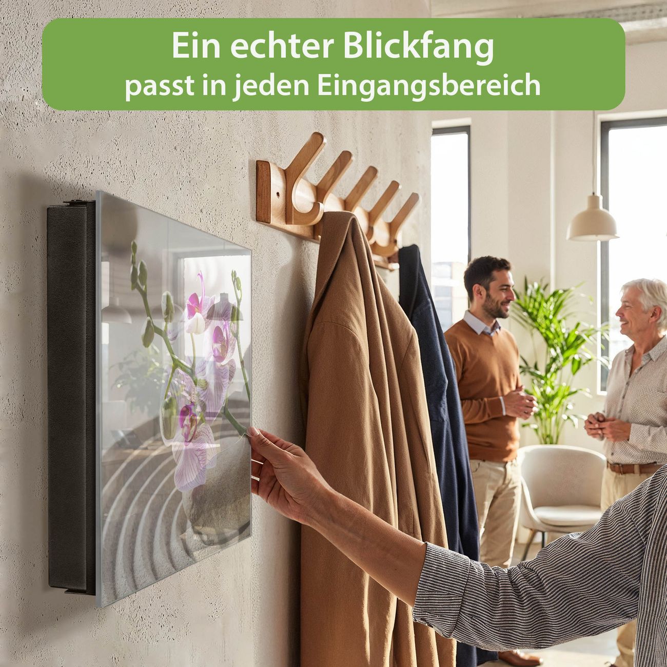 Bringe Ordnung und Eleganz in deinen Eingangsbereich mit dem banjado Schlüsselkasten Motiv Motiv Zen Relax. Die moderne Schlüsselbox kombiniert funktionales Design mit hochwertiger Verarbeitung und wird so zu einem echten Hingucker in Flur, Büro oder Ferienwohnung. ✅ Stilvolle Schlüsselaufbewahrung mit Glasfront im Motiv Motiv Zen Relax Der Design-Schlüsselkasten Motiv Motiv Zen Relax bietet Platz für bis zu 50 Schlüssel, die auf 5 stabilen Reihen mit je 10 Haken übersichtlich verstaut werden. Mit seinen kompakten Maßen von 30 x 30 x 5 cm passt die Schlüsselbox perfekt auch in kleinere Räume. Der schwarz lackierte Stahlkorpus mit rechts angeschlagenem Türscharnier harmoniert mit der Glasfront und fügt sich nahtlos in jedes Wohnambiente ein. Ob als Schlüsselorganizer für Zuhause oder als praktische Lösung für Büros, Praxen und Gewerbe, der banjado Schlüsselkasten sorgt für Ordnung und Übersicht. Dank der magnetischen, mit Kreidestiften beschreibbaren Glasfront kannst du Notizen anheften oder Termine direkt auf der Oberfläche festhalten. Die Schlüsselbox Motiv Motiv Zen Relax zur Wandmontage wird inklusive Befestigungsmaterial geliefert und ist schnell angebracht. So hast du deine Schlüssel jederzeit griffbereit und zugleich stilvoll verstaut. Mit diesem banjado Schlüsselkasten Motiv Motiv Zen Relax kombinierst du praktische Aufbewahrung mit stilvollem Wohndesign. Ob privat oder geschäftlich, die Schlüsselbox sorgt für mehr Ordnung, Übersicht und ein wohnliches Ambiente.Vorteile im Überblick