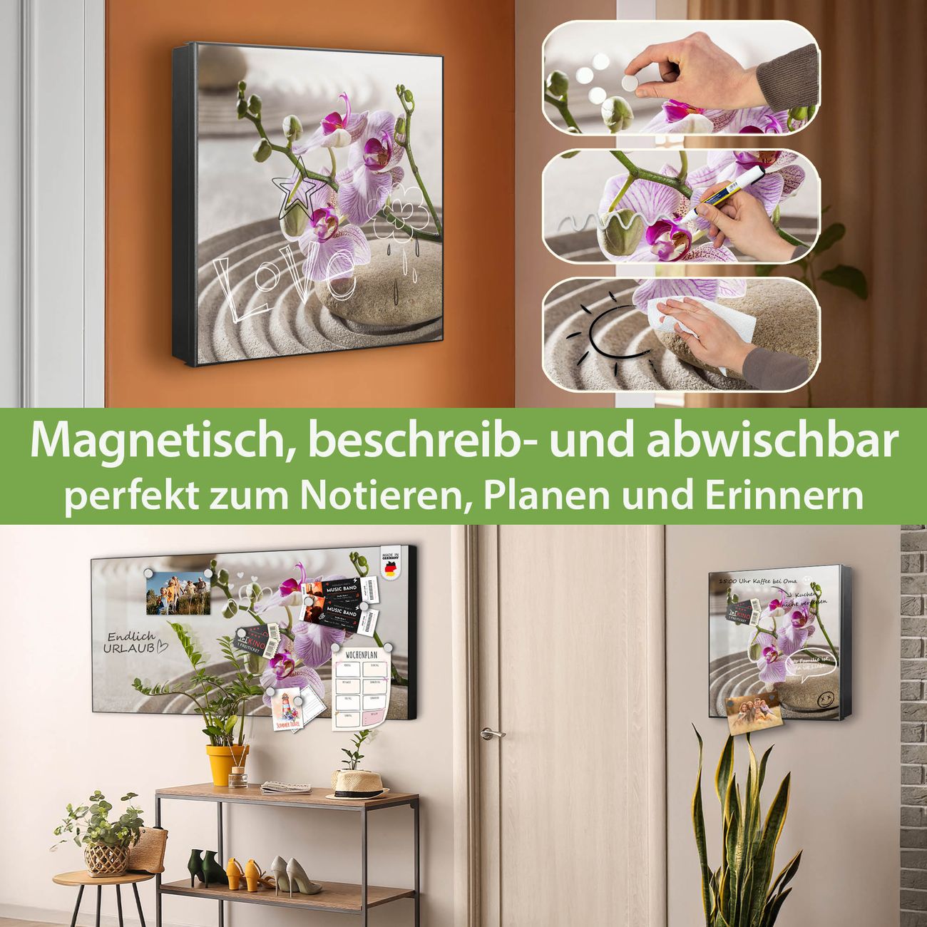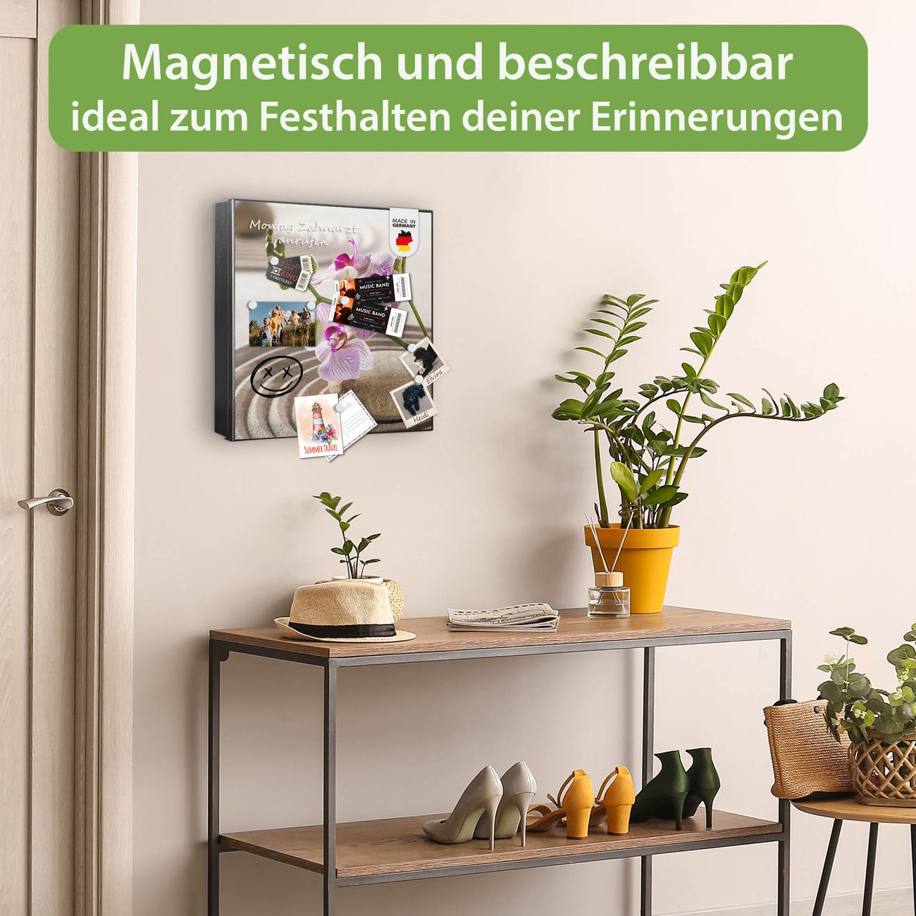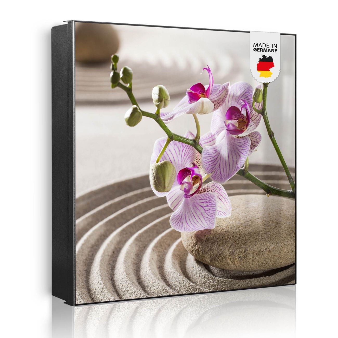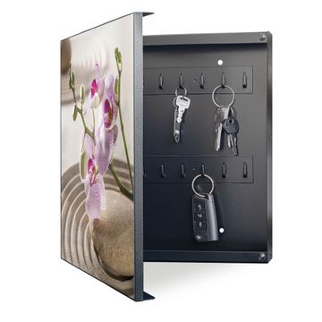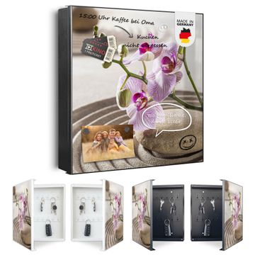 Bringe Ordnung und Eleganz in deinen Eingangsbereich mit dem banjado Schlüsselkasten Motiv Motiv Zen Relax. Die moderne Schlüsselbox kombiniert funktionales Design mit hochwertiger Verarbeitung und wird so zu einem echten Hingucker in Flur, Büro oder Ferienwohnung. ✅ Stilvolle Schlüsselaufbewahrung mit Motiv Motiv Zen Relax Der Design-Schlüsselkasten Motiv Motiv Zen Relax bietet Platz für bis zu 32 Schlüssel, die auf 4 stabilen Reihen mit je 8 Haken übersichtlich verstaut werden. Mit seinen kompakten Maßen von 30 x 30 x 5 cm passt die Schlüsselbox perfekt auch in kleinere Räume. Der schwarz lackierte Stahlkorpus mit links angeschlagenem Türscharnier harmoniert mit gedruckten Folie auf der Front und fügt sich nahtlos in jedes Wohnambiente ein. Ob als Schlüsselorganizer für Zuhause oder als praktische Lösung für Büros, Praxen und Gewerbe, der banjado Schlüsselkasten sorgt für Ordnung und Übersicht. Dank der magnetischen, mit Kreidestiften beschreibbaren Folie auf der Front kannst du Notizen anheften oder Termine direkt auf der Oberfläche festhalten. Die Schlüsselbox Motiv Motiv Zen Relax zur Wandmontage wird inklusive Befestigungsmaterial geliefert und ist schnell angebracht. So hast du deine Schlüssel jederzeit griffbereit und zugleich stilvoll verstaut. Mit diesem banjado Schlüsselkasten Motiv Motiv Zen Relax kombinierst du praktische Aufbewahrung mit stilvollem Wohndesign. Ob privat oder geschäftlich, die Schlüsselbox sorgt für mehr Ordnung, Übersicht und ein wohnliches Ambiente.Vorteile im Überblick