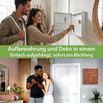 Bringe Ordnung und Eleganz in deinen Eingangsbereich mit dem banjado Schlüsselkasten Motiv Motiv Ziegelwand. Die moderne Schlüsselbox kombiniert funktionales Design mit hochwertiger Verarbeitung und wird so zu einem echten Hingucker in Flur, Büro oder Ferienwohnung. ✅ Stilvolle Schlüsselaufbewahrung mit Glasfront im Motiv Motiv Ziegelwand Der Design-Schlüsselkasten Motiv Motiv Ziegelwand bietet Platz für bis zu 50 Schlüssel, die auf 5 stabilen Reihen mit je 10 Haken übersichtlich verstaut werden. Mit seinen kompakten Maßen von 30 x 30 x 5 cm passt die Schlüsselbox perfekt auch in kleinere Räume. Der weiß lackierte Stahlkorpus mit rechts angeschlagenem Türscharnier harmoniert mit der Glasfront und fügt sich nahtlos in jedes Wohnambiente ein. Ob als Schlüsselorganizer für Zuhause oder als praktische Lösung für Büros, Praxen und Gewerbe, der banjado Schlüsselkasten sorgt für Ordnung und Übersicht. Dank der magnetischen, mit Kreidestiften beschreibbaren Glasfront kannst du Notizen anheften oder Termine direkt auf der Oberfläche festhalten. Die Schlüsselbox Motiv Motiv Ziegelwand zur Wandmontage wird inklusive Befestigungsmaterial geliefert und ist schnell angebracht. So hast du deine Schlüssel jederzeit griffbereit und zugleich stilvoll verstaut. Mit diesem banjado Schlüsselkasten Motiv Motiv Ziegelwand kombinierst du praktische Aufbewahrung mit stilvollem Wohndesign. Ob privat oder geschäftlich, die Schlüsselbox sorgt für mehr Ordnung, Übersicht und ein wohnliches Ambiente.Vorteile im Überblick