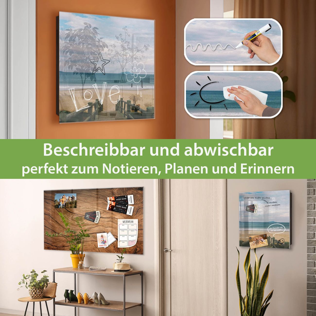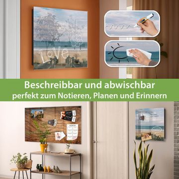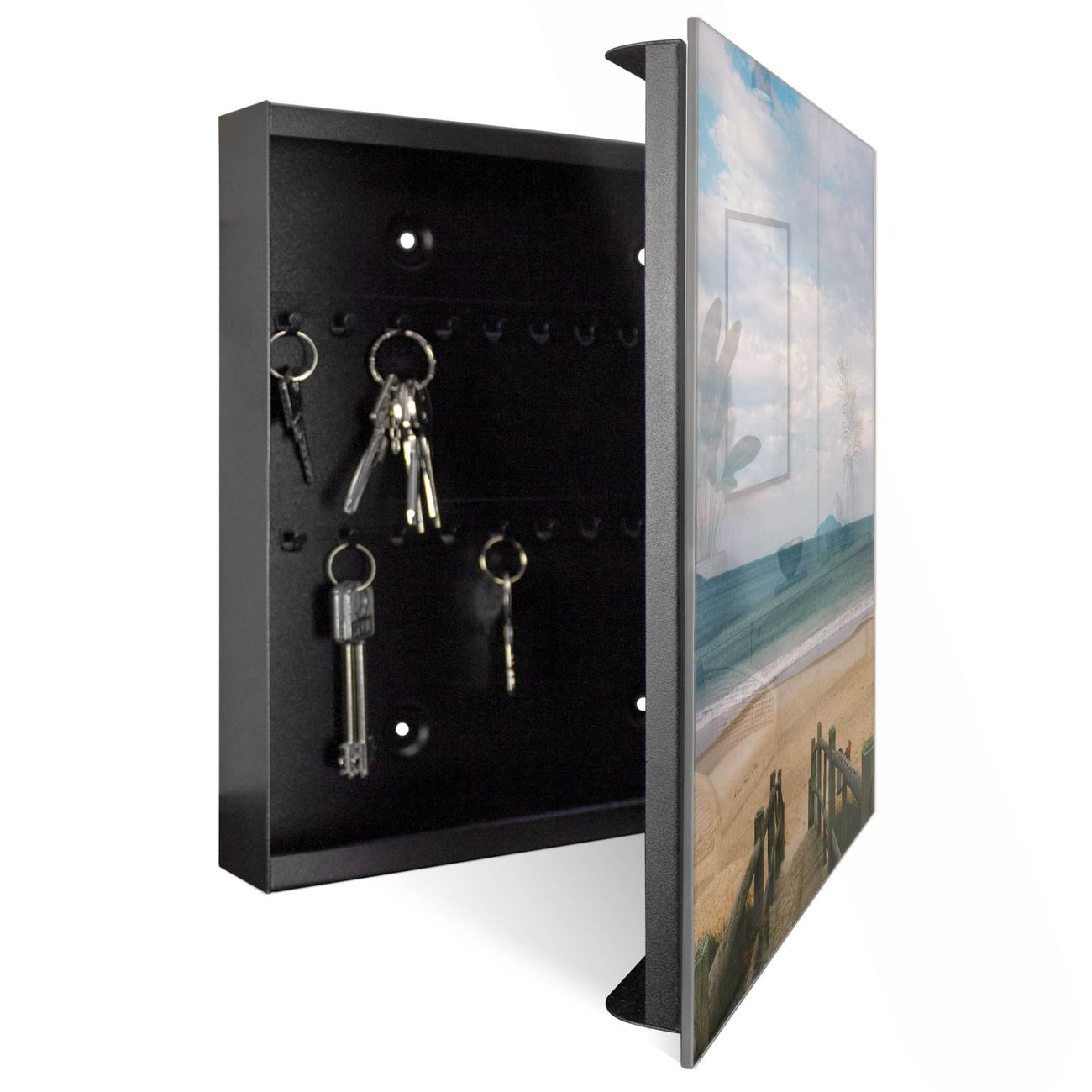 Bringe Ordnung und Eleganz in deinen Eingangsbereich mit dem banjado Schlüsselkasten Motiv Motiv Zum Strand. Die moderne Schlüsselbox kombiniert funktionales Design mit hochwertiger Verarbeitung und wird so zu einem echten Hingucker in Flur, Büro oder Ferienwohnung. ✅ Stilvolle Schlüsselaufbewahrung mit Glasfront im Motiv Motiv Zum Strand Der Design-Schlüsselkasten Motiv Motiv Zum Strand bietet Platz für bis zu 50 Schlüssel, die auf 5 stabilen Reihen mit je 10 Haken übersichtlich verstaut werden. Mit seinen kompakten Maßen von 30 x 30 x 5 cm passt die Schlüsselbox perfekt auch in kleinere Räume. Der schwarz lackierte Stahlkorpus mit rechts angeschlagenem Türscharnier harmoniert mit der Glasfront und fügt sich nahtlos in jedes Wohnambiente ein. Ob als Schlüsselorganizer für Zuhause oder als praktische Lösung für Büros, Praxen und Gewerbe, der banjado Schlüsselkasten sorgt für Ordnung und Übersicht. Dank der magnetischen, mit Kreidestiften beschreibbaren Glasfront kannst du Notizen anheften oder Termine direkt auf der Oberfläche festhalten. Die Schlüsselbox Motiv Motiv Zum Strand zur Wandmontage wird inklusive Befestigungsmaterial geliefert und ist schnell angebracht. So hast du deine Schlüssel jederzeit griffbereit und zugleich stilvoll verstaut. Mit diesem banjado Schlüsselkasten Motiv Motiv Zum Strand kombinierst du praktische Aufbewahrung mit stilvollem Wohndesign. Ob privat oder geschäftlich, die Schlüsselbox sorgt für mehr Ordnung, Übersicht und ein wohnliches Ambiente.Vorteile im Überblick