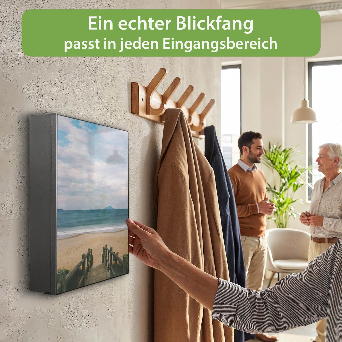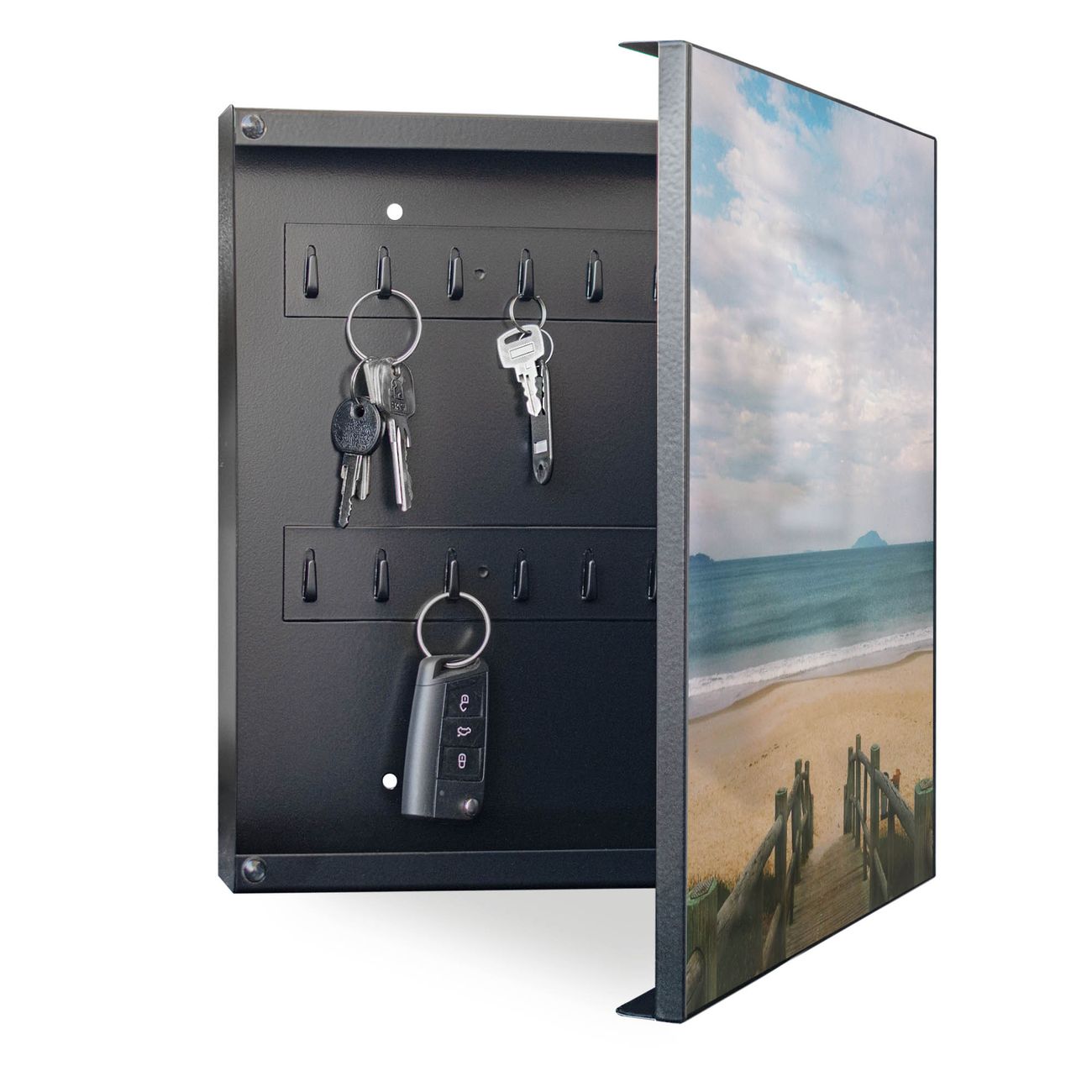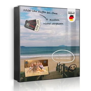 Bringe Ordnung und Eleganz in deinen Eingangsbereich mit dem banjado Schlüsselkasten Motiv Motiv Zum Strand. Die moderne Schlüsselbox kombiniert funktionales Design mit hochwertiger Verarbeitung und wird so zu einem echten Hingucker in Flur, Büro oder Ferienwohnung. ✅ Stilvolle Schlüsselaufbewahrung mit Motiv Motiv Zum Strand Der Design-Schlüsselkasten Motiv Motiv Zum Strand bietet Platz für bis zu 32 Schlüssel, die auf 4 stabilen Reihen mit je 8 Haken übersichtlich verstaut werden. Mit seinen kompakten Maßen von 30 x 30 x 5 cm passt die Schlüsselbox perfekt auch in kleinere Räume. Der schwarz lackierte Stahlkorpus mit rechts angeschlagenem Türscharnier harmoniert mit gedruckten Folie auf der Front und fügt sich nahtlos in jedes Wohnambiente ein. Ob als Schlüsselorganizer für Zuhause oder als praktische Lösung für Büros, Praxen und Gewerbe, der banjado Schlüsselkasten sorgt für Ordnung und Übersicht. Dank der magnetischen, mit Kreidestiften beschreibbaren Folie auf der Front kannst du Notizen anheften oder Termine direkt auf der Oberfläche festhalten. Die Schlüsselbox Motiv Motiv Zum Strand zur Wandmontage wird inklusive Befestigungsmaterial geliefert und ist schnell angebracht. So hast du deine Schlüssel jederzeit griffbereit und zugleich stilvoll verstaut. Mit diesem banjado Schlüsselkasten Motiv Motiv Zum Strand kombinierst du praktische Aufbewahrung mit stilvollem Wohndesign. Ob privat oder geschäftlich, die Schlüsselbox sorgt für mehr Ordnung, Übersicht und ein wohnliches Ambiente.Vorteile im Überblick