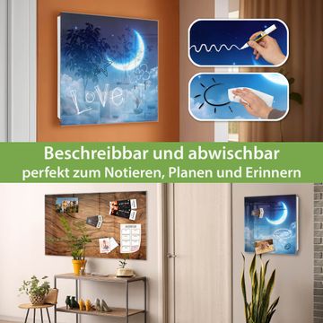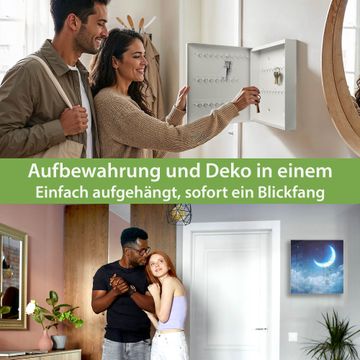 Bringe Ordnung und Eleganz in deinen Eingangsbereich mit dem banjado Schlüsselkasten Motiv Motiv zunehmender Mond. Die moderne Schlüsselbox kombiniert funktionales Design mit hochwertiger Verarbeitung und wird so zu einem echten Hingucker in Flur, Büro oder Ferienwohnung. ✅ Stilvolle Schlüsselaufbewahrung mit Glasfront im Motiv Motiv zunehmender Mond Der Design-Schlüsselkasten Motiv Motiv zunehmender Mond bietet Platz für bis zu 50 Schlüssel, die auf 5 stabilen Reihen mit je 10 Haken übersichtlich verstaut werden. Mit seinen kompakten Maßen von 30 x 30 x 5 cm passt die Schlüsselbox perfekt auch in kleinere Räume. Der weiß lackierte Stahlkorpus mit rechts angeschlagenem Türscharnier harmoniert mit der Glasfront und fügt sich nahtlos in jedes Wohnambiente ein. Ob als Schlüsselorganizer für Zuhause oder als praktische Lösung für Büros, Praxen und Gewerbe, der banjado Schlüsselkasten sorgt für Ordnung und Übersicht. Dank der magnetischen, mit Kreidestiften beschreibbaren Glasfront kannst du Notizen anheften oder Termine direkt auf der Oberfläche festhalten. Die Schlüsselbox Motiv Motiv zunehmender Mond zur Wandmontage wird inklusive Befestigungsmaterial geliefert und ist schnell angebracht. So hast du deine Schlüssel jederzeit griffbereit und zugleich stilvoll verstaut. Mit diesem banjado Schlüsselkasten Motiv Motiv zunehmender Mond kombinierst du praktische Aufbewahrung mit stilvollem Wohndesign. Ob privat oder geschäftlich, die Schlüsselbox sorgt für mehr Ordnung, Übersicht und ein wohnliches Ambiente.Vorteile im Überblick