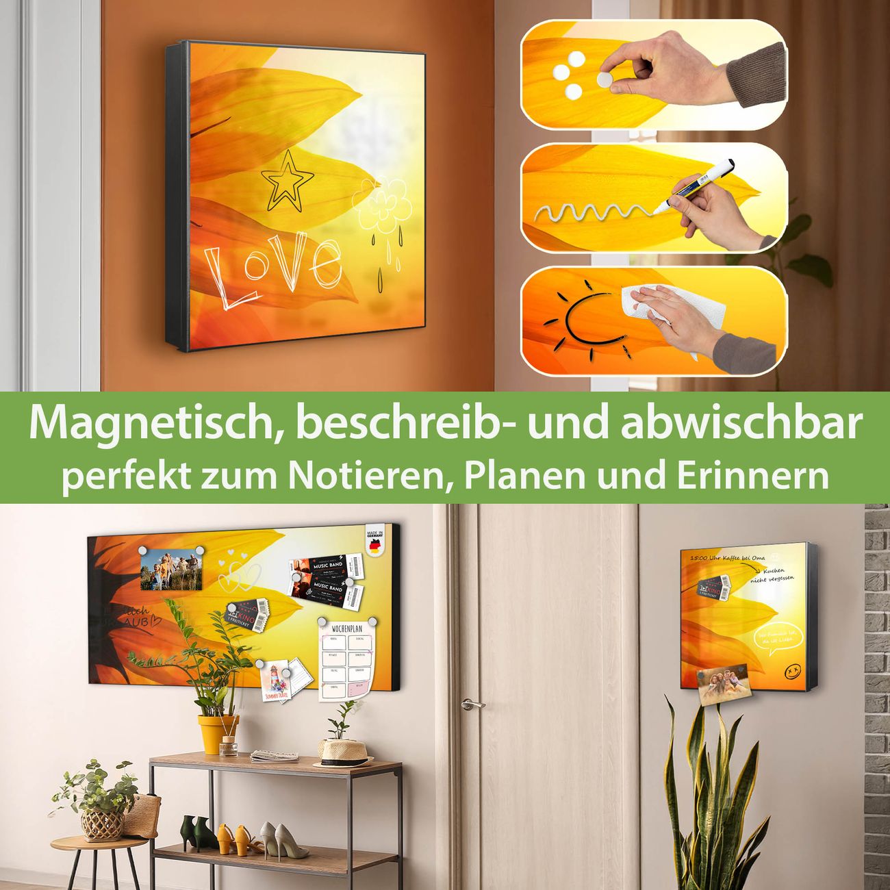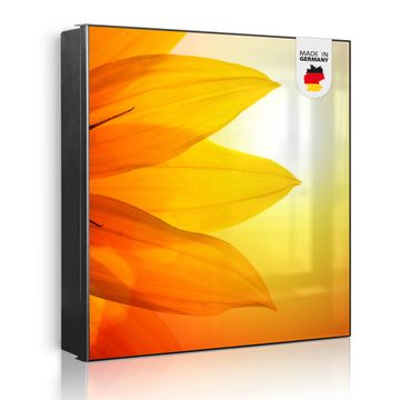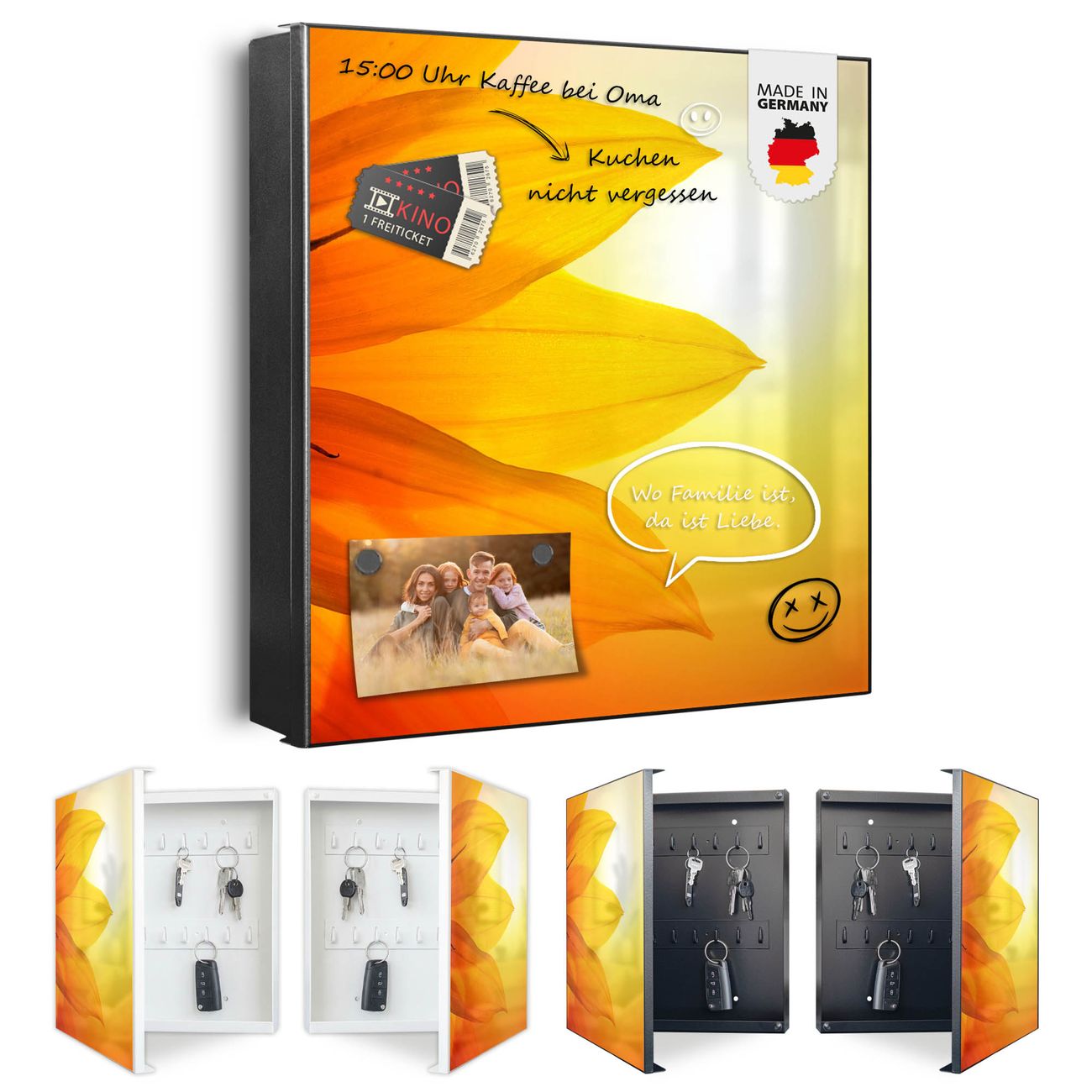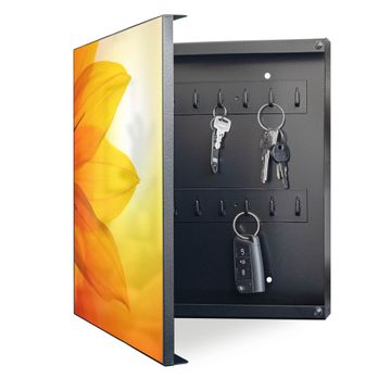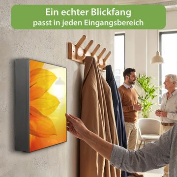 Bringe Ordnung und Eleganz in deinen Eingangsbereich mit dem banjado Schlüsselkasten Motiv Motiv Zwei Sonnen. Die moderne Schlüsselbox kombiniert funktionales Design mit hochwertiger Verarbeitung und wird so zu einem echten Hingucker in Flur, Büro oder Ferienwohnung. ✅ Stilvolle Schlüsselaufbewahrung mit Motiv Motiv Zwei Sonnen Der Design-Schlüsselkasten Motiv Motiv Zwei Sonnen bietet Platz für bis zu 32 Schlüssel, die auf 4 stabilen Reihen mit je 8 Haken übersichtlich verstaut werden. Mit seinen kompakten Maßen von 30 x 30 x 5 cm passt die Schlüsselbox perfekt auch in kleinere Räume. Der schwarz lackierte Stahlkorpus mit links angeschlagenem Türscharnier harmoniert mit gedruckten Folie auf der Front und fügt sich nahtlos in jedes Wohnambiente ein. Ob als Schlüsselorganizer für Zuhause oder als praktische Lösung für Büros, Praxen und Gewerbe, der banjado Schlüsselkasten sorgt für Ordnung und Übersicht. Dank der magnetischen, mit Kreidestiften beschreibbaren Folie auf der Front kannst du Notizen anheften oder Termine direkt auf der Oberfläche festhalten. Die Schlüsselbox Motiv Motiv Zwei Sonnen zur Wandmontage wird inklusive Befestigungsmaterial geliefert und ist schnell angebracht. So hast du deine Schlüssel jederzeit griffbereit und zugleich stilvoll verstaut. Mit diesem banjado Schlüsselkasten Motiv Motiv Zwei Sonnen kombinierst du praktische Aufbewahrung mit stilvollem Wohndesign. Ob privat oder geschäftlich, die Schlüsselbox sorgt für mehr Ordnung, Übersicht und ein wohnliches Ambiente.Vorteile im Überblick