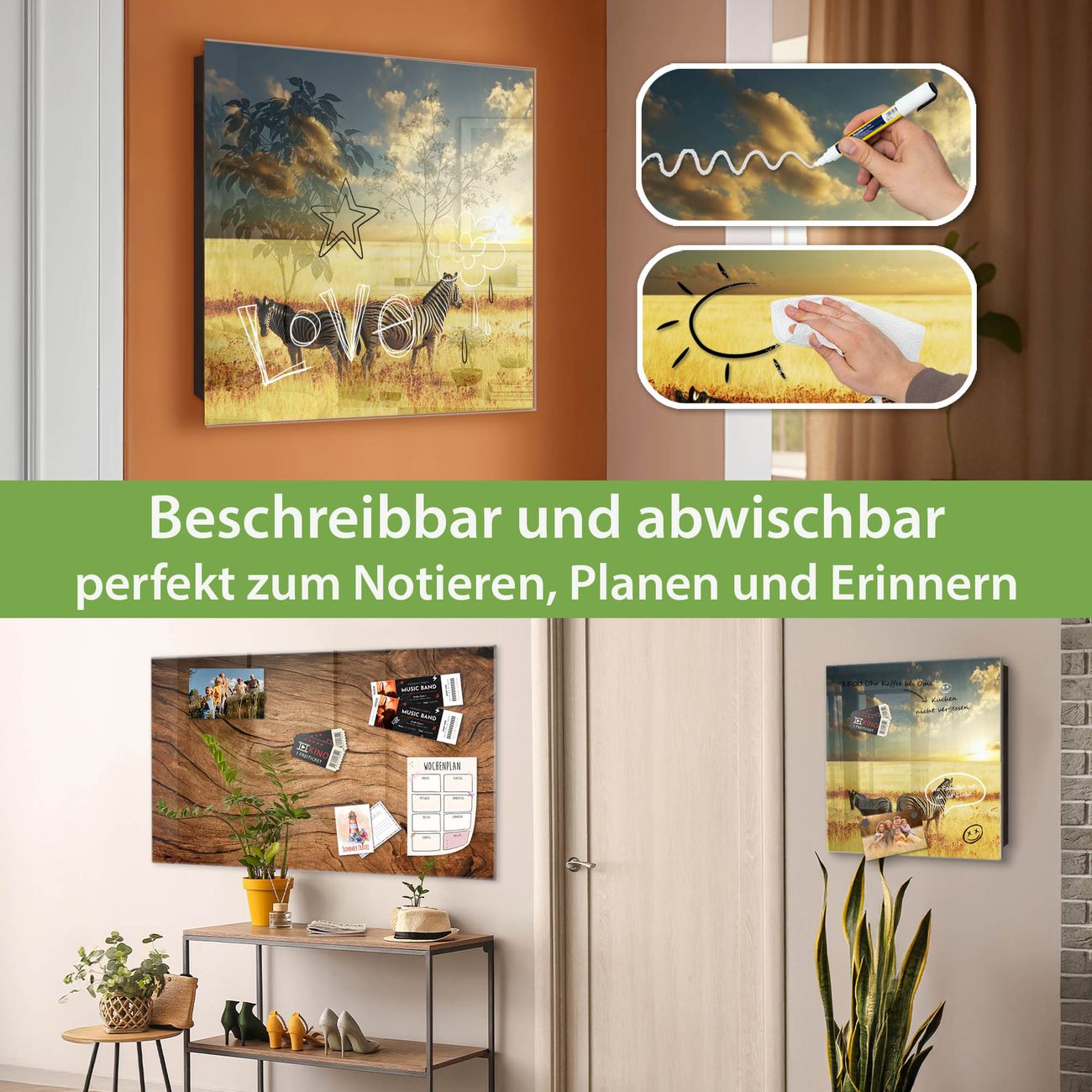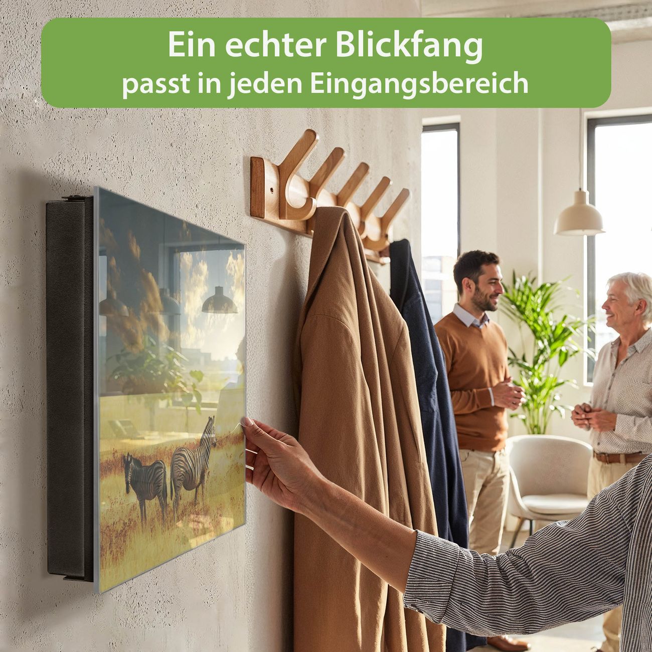 Bringe Ordnung und Eleganz in deinen Eingangsbereich mit dem banjado Schlüsselkasten Motiv Motiv Zwei Zebras . Die moderne Schlüsselbox kombiniert funktionales Design mit hochwertiger Verarbeitung und wird so zu einem echten Hingucker in Flur, Büro oder Ferienwohnung. ✅ Stilvolle Schlüsselaufbewahrung mit Glasfront im Motiv Motiv Zwei Zebras Der Design-Schlüsselkasten Motiv Motiv Zwei Zebras bietet Platz für bis zu 50 Schlüssel, die auf 5 stabilen Reihen mit je 10 Haken übersichtlich verstaut werden. Mit seinen kompakten Maßen von 30 x 30 x 5 cm passt die Schlüsselbox perfekt auch in kleinere Räume. Der schwarz lackierte Stahlkorpus mit rechts angeschlagenem Türscharnier harmoniert mit der Glasfront und fügt sich nahtlos in jedes Wohnambiente ein. Ob als Schlüsselorganizer für Zuhause oder als praktische Lösung für Büros, Praxen und Gewerbe, der banjado Schlüsselkasten sorgt für Ordnung und Übersicht. Dank der magnetischen, mit Kreidestiften beschreibbaren Glasfront kannst du Notizen anheften oder Termine direkt auf der Oberfläche festhalten. Die Schlüsselbox Motiv Motiv Zwei Zebras zur Wandmontage wird inklusive Befestigungsmaterial geliefert und ist schnell angebracht. So hast du deine Schlüssel jederzeit griffbereit und zugleich stilvoll verstaut. Mit diesem banjado Schlüsselkasten Motiv Motiv Zwei Zebras kombinierst du praktische Aufbewahrung mit stilvollem Wohndesign. Ob privat oder geschäftlich, die Schlüsselbox sorgt für mehr Ordnung, Übersicht und ein wohnliches Ambiente.Vorteile im Überblick