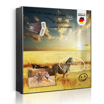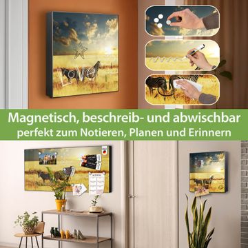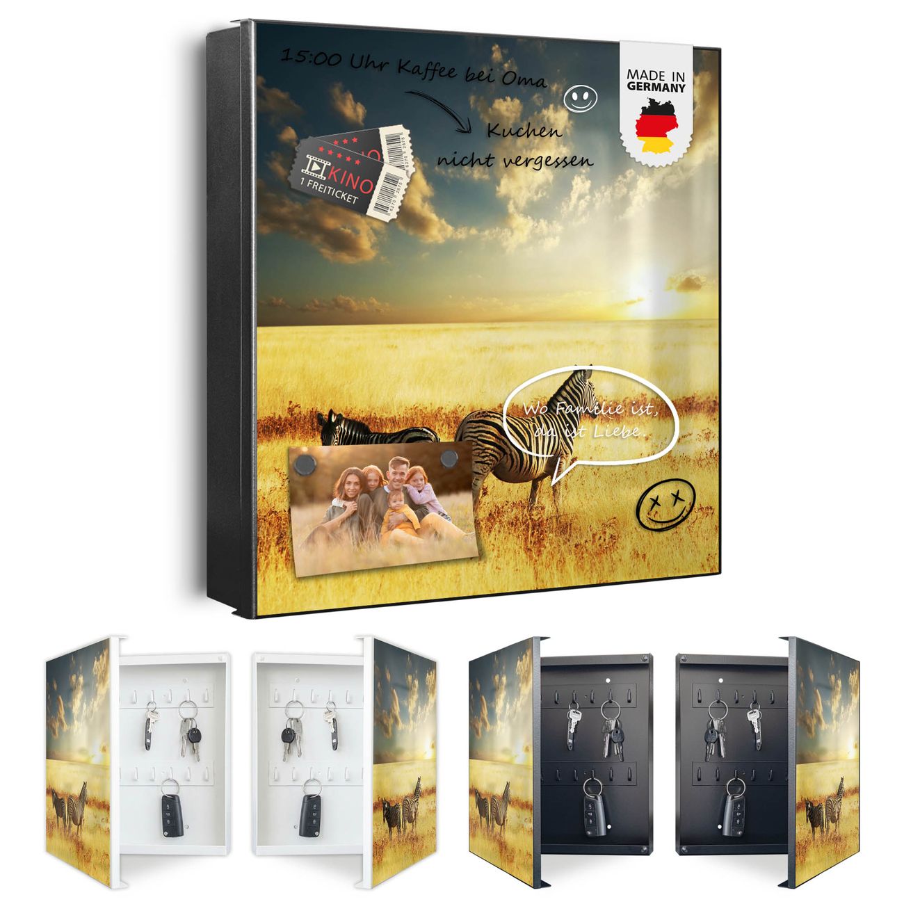 Bringe Ordnung und Eleganz in deinen Eingangsbereich mit dem banjado Schlüsselkasten Motiv Motiv Zwei Zebras . Die moderne Schlüsselbox kombiniert funktionales Design mit hochwertiger Verarbeitung und wird so zu einem echten Hingucker in Flur, Büro oder Ferienwohnung. ✅ Stilvolle Schlüsselaufbewahrung mit Motiv Motiv Zwei Zebras Der Design-Schlüsselkasten Motiv Motiv Zwei Zebras bietet Platz für bis zu 32 Schlüssel, die auf 4 stabilen Reihen mit je 8 Haken übersichtlich verstaut werden. Mit seinen kompakten Maßen von 30 x 30 x 5 cm passt die Schlüsselbox perfekt auch in kleinere Räume. Der schwarz lackierte Stahlkorpus mit rechts angeschlagenem Türscharnier harmoniert mit gedruckten Folie auf der Front und fügt sich nahtlos in jedes Wohnambiente ein. Ob als Schlüsselorganizer für Zuhause oder als praktische Lösung für Büros, Praxen und Gewerbe, der banjado Schlüsselkasten sorgt für Ordnung und Übersicht. Dank der magnetischen, mit Kreidestiften beschreibbaren Folie auf der Front kannst du Notizen anheften oder Termine direkt auf der Oberfläche festhalten. Die Schlüsselbox Motiv Motiv Zwei Zebras zur Wandmontage wird inklusive Befestigungsmaterial geliefert und ist schnell angebracht. So hast du deine Schlüssel jederzeit griffbereit und zugleich stilvoll verstaut. Mit diesem banjado Schlüsselkasten Motiv Motiv Zwei Zebras kombinierst du praktische Aufbewahrung mit stilvollem Wohndesign. Ob privat oder geschäftlich, die Schlüsselbox sorgt für mehr Ordnung, Übersicht und ein wohnliches Ambiente.Vorteile im Überblick