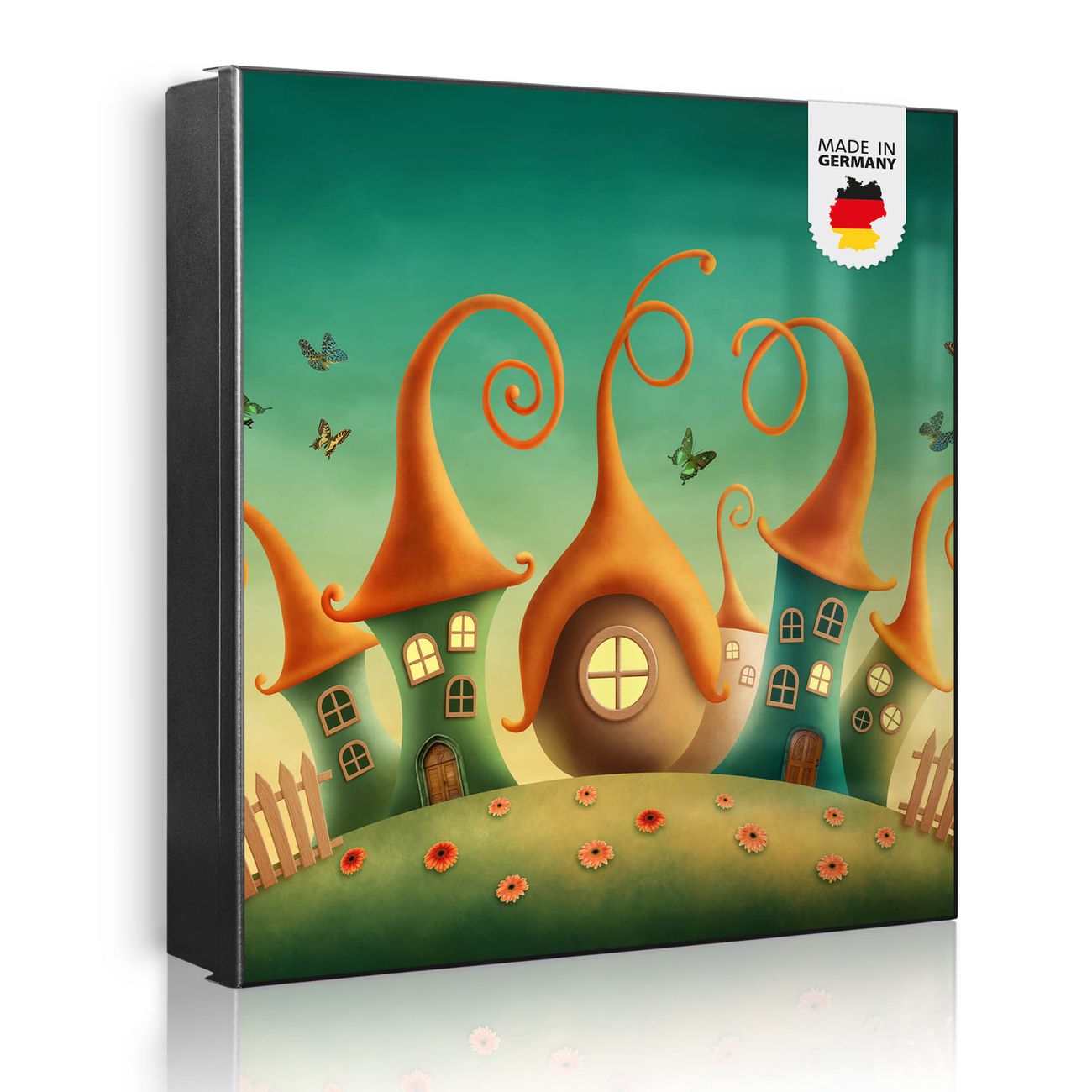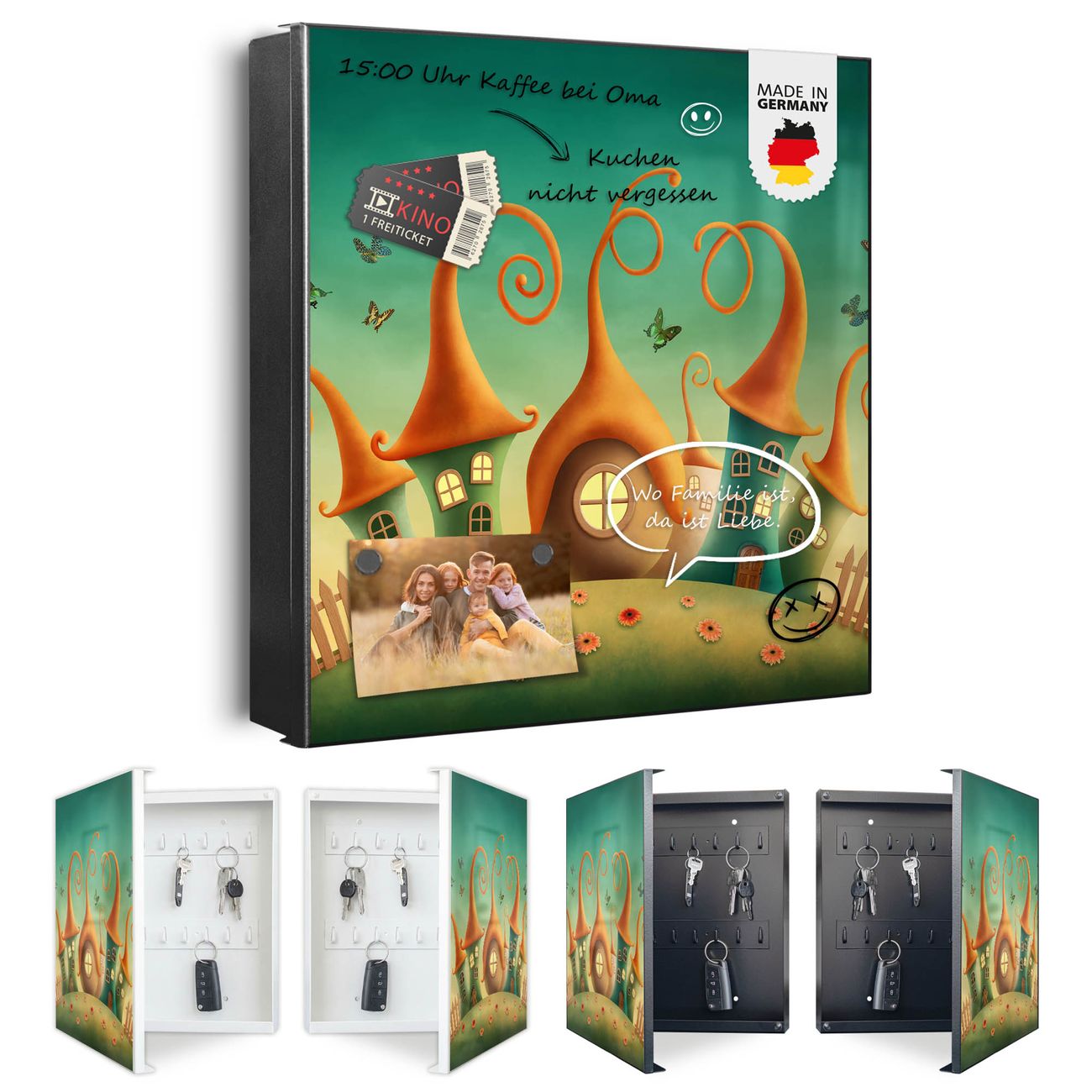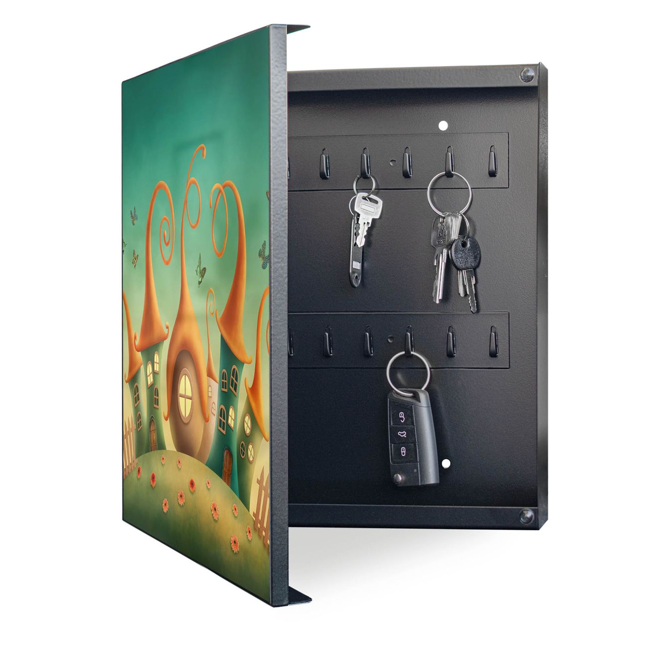 Bringe Ordnung und Eleganz in deinen Eingangsbereich mit dem banjado Schlüsselkasten Motiv Motiv Zwergenhausen. Die moderne Schlüsselbox kombiniert funktionales Design mit hochwertiger Verarbeitung und wird so zu einem echten Hingucker in Flur, Büro oder Ferienwohnung. ✅ Stilvolle Schlüsselaufbewahrung mit Motiv Motiv Zwergenhausen Der Design-Schlüsselkasten Motiv Motiv Zwergenhausen bietet Platz für bis zu 32 Schlüssel, die auf 4 stabilen Reihen mit je 8 Haken übersichtlich verstaut werden. Mit seinen kompakten Maßen von 30 x 30 x 5 cm passt die Schlüsselbox perfekt auch in kleinere Räume. Der schwarz lackierte Stahlkorpus mit links angeschlagenem Türscharnier harmoniert mit gedruckten Folie auf der Front und fügt sich nahtlos in jedes Wohnambiente ein. Ob als Schlüsselorganizer für Zuhause oder als praktische Lösung für Büros, Praxen und Gewerbe, der banjado Schlüsselkasten sorgt für Ordnung und Übersicht. Dank der magnetischen, mit Kreidestiften beschreibbaren Folie auf der Front kannst du Notizen anheften oder Termine direkt auf der Oberfläche festhalten. Die Schlüsselbox Motiv Motiv Zwergenhausen zur Wandmontage wird inklusive Befestigungsmaterial geliefert und ist schnell angebracht. So hast du deine Schlüssel jederzeit griffbereit und zugleich stilvoll verstaut. Mit diesem banjado Schlüsselkasten Motiv Motiv Zwergenhausen kombinierst du praktische Aufbewahrung mit stilvollem Wohndesign. Ob privat oder geschäftlich, die Schlüsselbox sorgt für mehr Ordnung, Übersicht und ein wohnliches Ambiente.Vorteile im Überblick