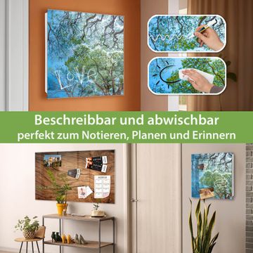 Bringe Ordnung und Eleganz in deinen Eingangsbereich mit dem banjado Schlüsselkasten Motiv Motiv Zwischen Bäumen 2. Die moderne Schlüsselbox kombiniert funktionales Design mit hochwertiger Verarbeitung und wird so zu einem echten Hingucker in Flur, Büro oder Ferienwohnung. ✅ Stilvolle Schlüsselaufbewahrung mit Glasfront im Motiv Motiv Zwischen Bäumen 2 Der Design-Schlüsselkasten Motiv Motiv Zwischen Bäumen 2 bietet Platz für bis zu 50 Schlüssel, die auf 5 stabilen Reihen mit je 10 Haken übersichtlich verstaut werden. Mit seinen kompakten Maßen von 30 x 30 x 5 cm passt die Schlüsselbox perfekt auch in kleinere Räume. Der weiß lackierte Stahlkorpus mit rechts angeschlagenem Türscharnier harmoniert mit der Glasfront und fügt sich nahtlos in jedes Wohnambiente ein. Ob als Schlüsselorganizer für Zuhause oder als praktische Lösung für Büros, Praxen und Gewerbe, der banjado Schlüsselkasten sorgt für Ordnung und Übersicht. Dank der magnetischen, mit Kreidestiften beschreibbaren Glasfront kannst du Notizen anheften oder Termine direkt auf der Oberfläche festhalten. Die Schlüsselbox Motiv Motiv Zwischen Bäumen 2 zur Wandmontage wird inklusive Befestigungsmaterial geliefert und ist schnell angebracht. So hast du deine Schlüssel jederzeit griffbereit und zugleich stilvoll verstaut. Mit diesem banjado Schlüsselkasten Motiv Motiv Zwischen Bäumen 2 kombinierst du praktische Aufbewahrung mit stilvollem Wohndesign. Ob privat oder geschäftlich, die Schlüsselbox sorgt für mehr Ordnung, Übersicht und ein wohnliches Ambiente.Vorteile im Überblick