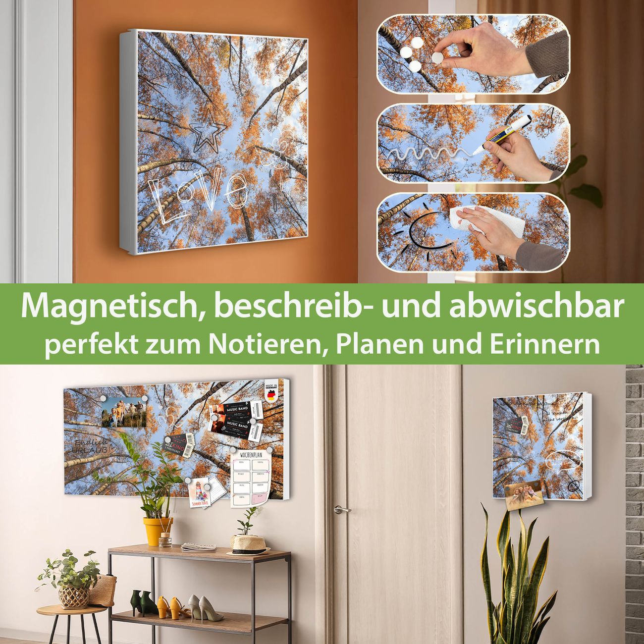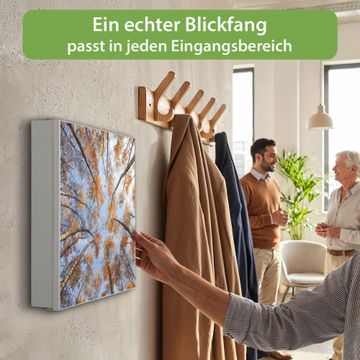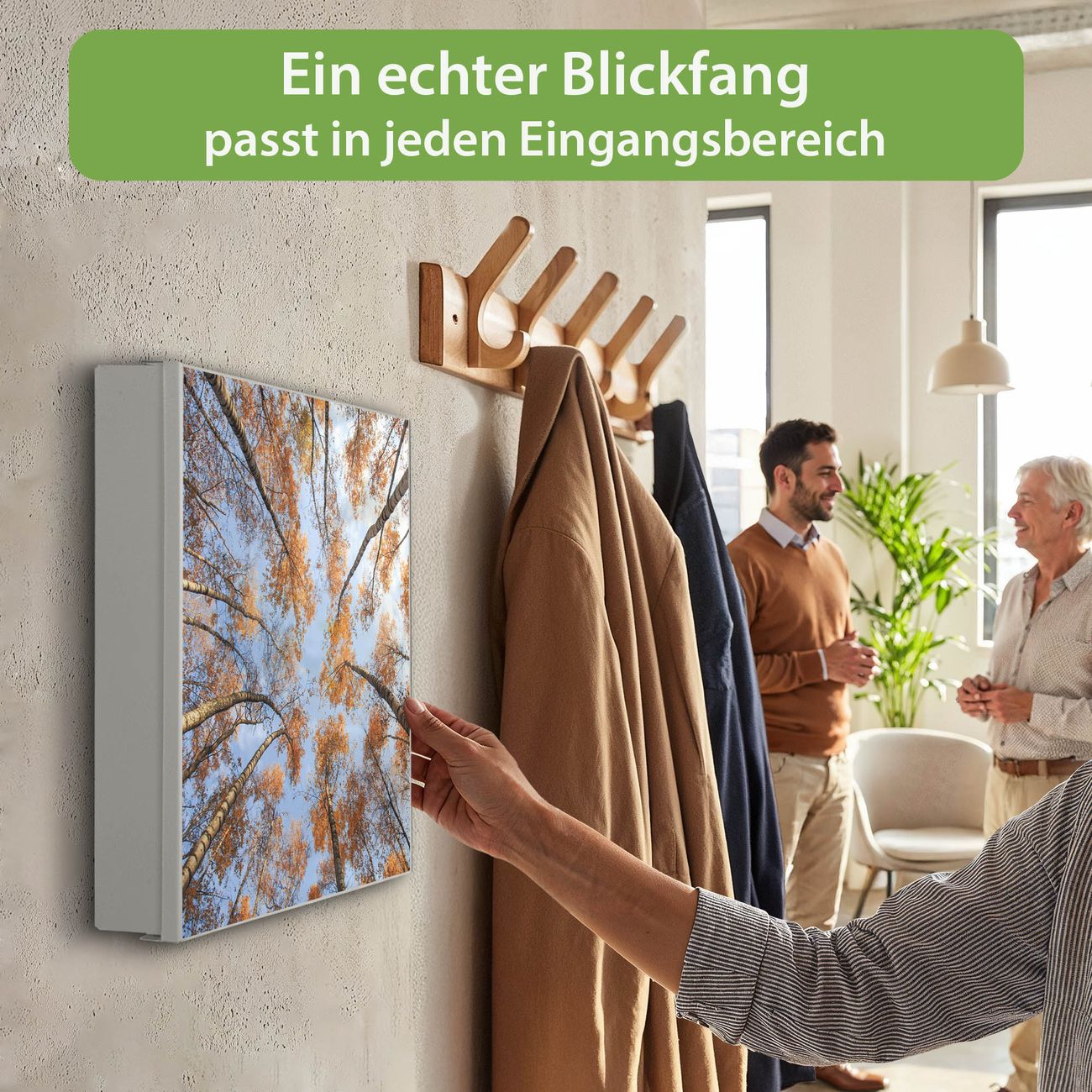 Bringe Ordnung und Eleganz in deinen Eingangsbereich mit dem banjado Schlüsselkasten Motiv Motiv Zwischen Bäumen 4. Die moderne Schlüsselbox kombiniert funktionales Design mit hochwertiger Verarbeitung und wird so zu einem echten Hingucker in Flur, Büro oder Ferienwohnung. ✅ Stilvolle Schlüsselaufbewahrung mit Motiv Motiv Zwischen Bäumen 4 Der Design-Schlüsselkasten Motiv Motiv Zwischen Bäumen 4 bietet Platz für bis zu 32 Schlüssel, die auf 4 stabilen Reihen mit je 8 Haken übersichtlich verstaut werden. Mit seinen kompakten Maßen von 30 x 30 x 5 cm passt die Schlüsselbox perfekt auch in kleinere Räume. Der weiß lackierte Stahlkorpus mit links angeschlagenem Türscharnier harmoniert mit gedruckten Folie auf der Front und fügt sich nahtlos in jedes Wohnambiente ein. Ob als Schlüsselorganizer für Zuhause oder als praktische Lösung für Büros, Praxen und Gewerbe, der banjado Schlüsselkasten sorgt für Ordnung und Übersicht. Dank der magnetischen, mit Kreidestiften beschreibbaren Folie auf der Front kannst du Notizen anheften oder Termine direkt auf der Oberfläche festhalten. Die Schlüsselbox Motiv Motiv Zwischen Bäumen 4 zur Wandmontage wird inklusive Befestigungsmaterial geliefert und ist schnell angebracht. So hast du deine Schlüssel jederzeit griffbereit und zugleich stilvoll verstaut. Mit diesem banjado Schlüsselkasten Motiv Motiv Zwischen Bäumen 4 kombinierst du praktische Aufbewahrung mit stilvollem Wohndesign. Ob privat oder geschäftlich, die Schlüsselbox sorgt für mehr Ordnung, Übersicht und ein wohnliches Ambiente.Vorteile im Überblick
