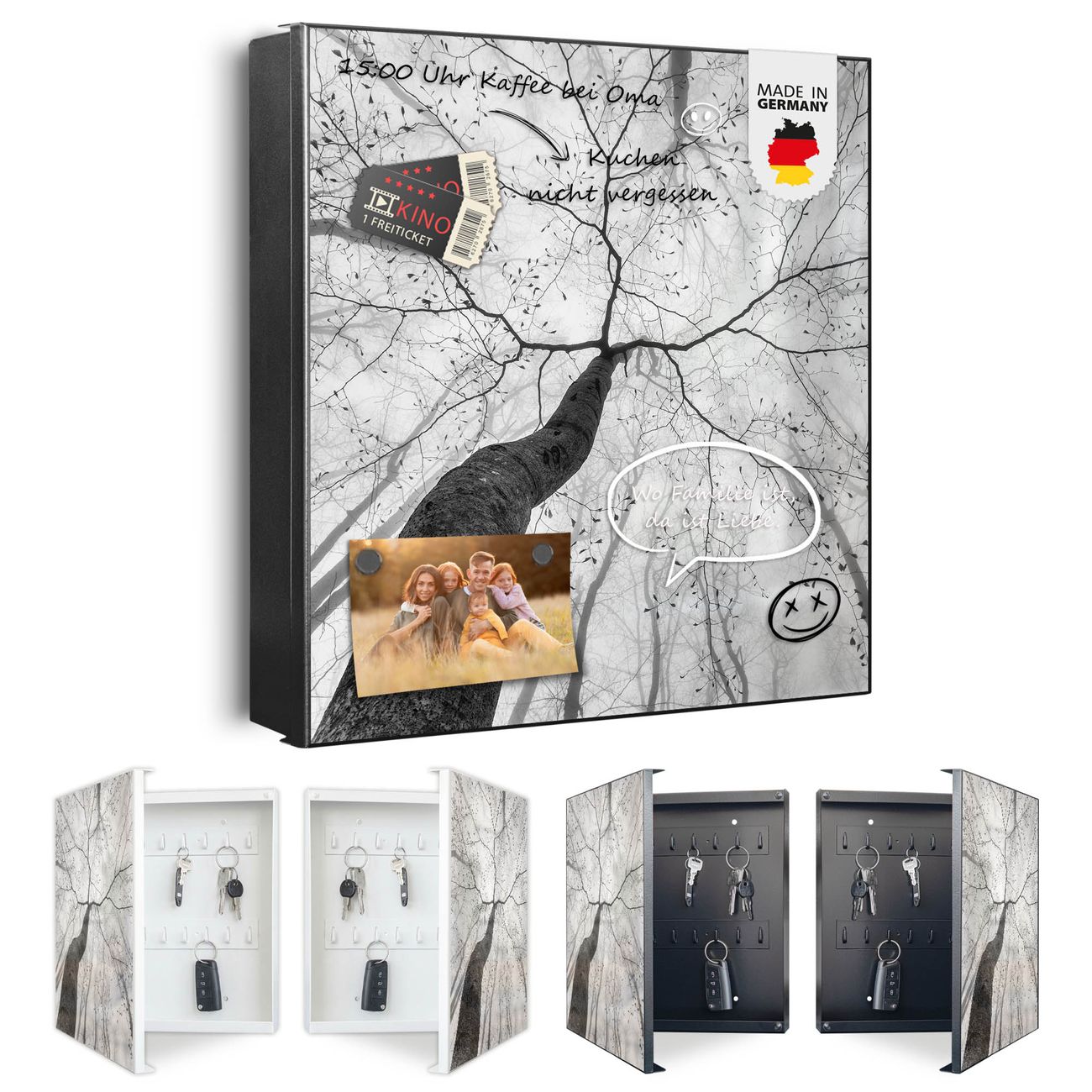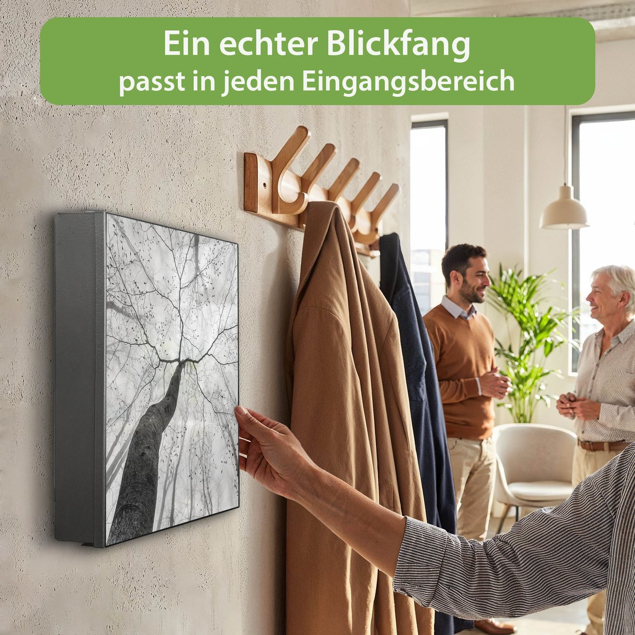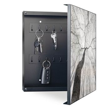 Bringe Ordnung und Eleganz in deinen Eingangsbereich mit dem banjado Schlüsselkasten Motiv Motiv Zwischen Bäumen 6. Die moderne Schlüsselbox kombiniert funktionales Design mit hochwertiger Verarbeitung und wird so zu einem echten Hingucker in Flur, Büro oder Ferienwohnung. ✅ Stilvolle Schlüsselaufbewahrung mit Motiv Motiv Zwischen Bäumen 6 Der Design-Schlüsselkasten Motiv Motiv Zwischen Bäumen 6 bietet Platz für bis zu 32 Schlüssel, die auf 4 stabilen Reihen mit je 8 Haken übersichtlich verstaut werden. Mit seinen kompakten Maßen von 30 x 30 x 5 cm passt die Schlüsselbox perfekt auch in kleinere Räume. Der schwarz lackierte Stahlkorpus mit rechts angeschlagenem Türscharnier harmoniert mit gedruckten Folie auf der Front und fügt sich nahtlos in jedes Wohnambiente ein. Ob als Schlüsselorganizer für Zuhause oder als praktische Lösung für Büros, Praxen und Gewerbe, der banjado Schlüsselkasten sorgt für Ordnung und Übersicht. Dank der magnetischen, mit Kreidestiften beschreibbaren Folie auf der Front kannst du Notizen anheften oder Termine direkt auf der Oberfläche festhalten. Die Schlüsselbox Motiv Motiv Zwischen Bäumen 6 zur Wandmontage wird inklusive Befestigungsmaterial geliefert und ist schnell angebracht. So hast du deine Schlüssel jederzeit griffbereit und zugleich stilvoll verstaut. Mit diesem banjado Schlüsselkasten Motiv Motiv Zwischen Bäumen 6 kombinierst du praktische Aufbewahrung mit stilvollem Wohndesign. Ob privat oder geschäftlich, die Schlüsselbox sorgt für mehr Ordnung, Übersicht und ein wohnliches Ambiente.Vorteile im Überblick