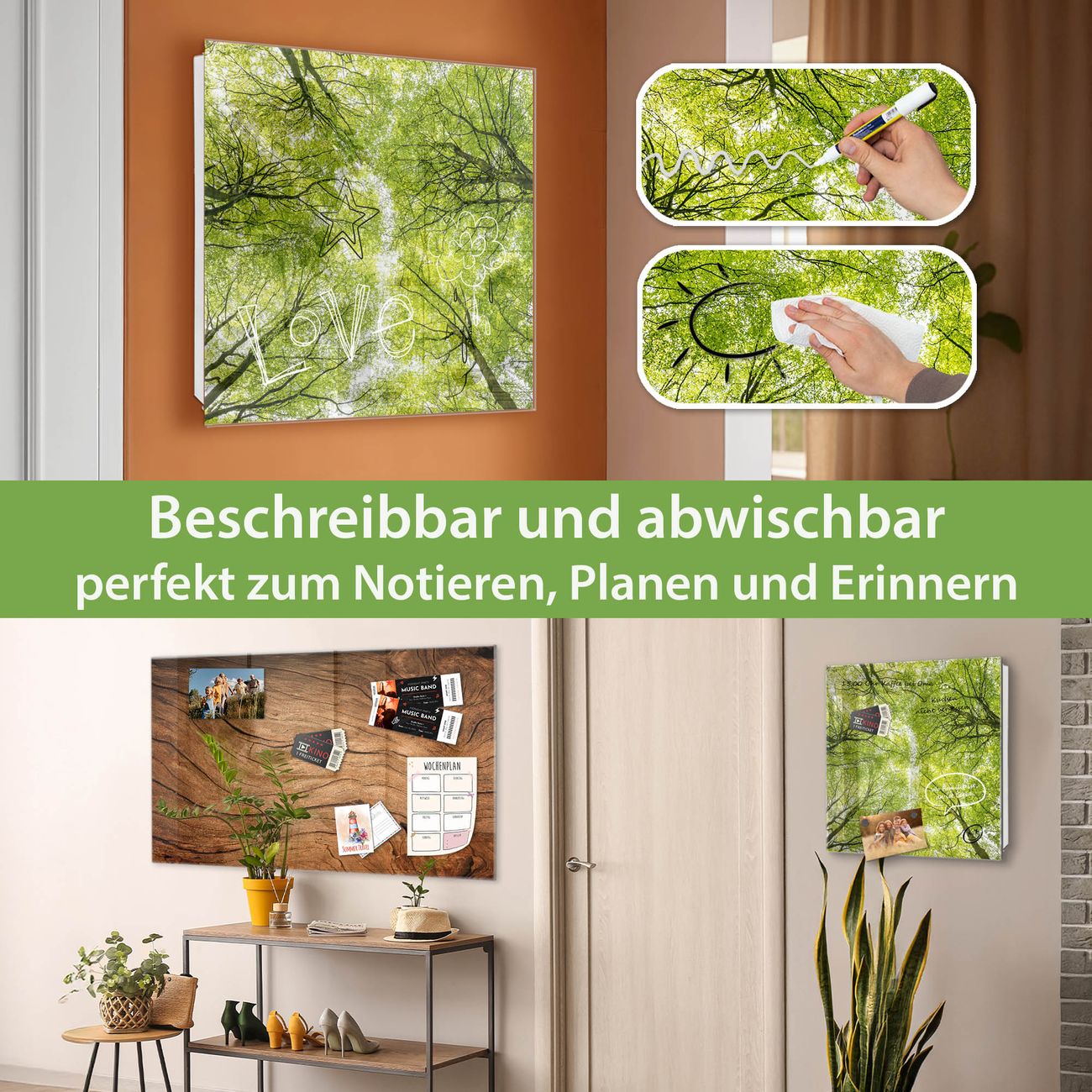 Bringe Ordnung und Eleganz in deinen Eingangsbereich mit dem banjado Schlüsselkasten Motiv Motiv Zwischen Bäumen. Die moderne Schlüsselbox kombiniert funktionales Design mit hochwertiger Verarbeitung und wird so zu einem echten Hingucker in Flur, Büro oder Ferienwohnung. ✅ Stilvolle Schlüsselaufbewahrung mit Glasfront im Motiv Motiv Zwischen Bäumen Der Design-Schlüsselkasten Motiv Motiv Zwischen Bäumen bietet Platz für bis zu 50 Schlüssel, die auf 5 stabilen Reihen mit je 10 Haken übersichtlich verstaut werden. Mit seinen kompakten Maßen von 30 x 30 x 5 cm passt die Schlüsselbox perfekt auch in kleinere Räume. Der weiß lackierte Stahlkorpus mit rechts angeschlagenem Türscharnier harmoniert mit der Glasfront und fügt sich nahtlos in jedes Wohnambiente ein. Ob als Schlüsselorganizer für Zuhause oder als praktische Lösung für Büros, Praxen und Gewerbe, der banjado Schlüsselkasten sorgt für Ordnung und Übersicht. Dank der magnetischen, mit Kreidestiften beschreibbaren Glasfront kannst du Notizen anheften oder Termine direkt auf der Oberfläche festhalten. Die Schlüsselbox Motiv Motiv Zwischen Bäumen zur Wandmontage wird inklusive Befestigungsmaterial geliefert und ist schnell angebracht. So hast du deine Schlüssel jederzeit griffbereit und zugleich stilvoll verstaut. Mit diesem banjado Schlüsselkasten Motiv Motiv Zwischen Bäumen kombinierst du praktische Aufbewahrung mit stilvollem Wohndesign. Ob privat oder geschäftlich, die Schlüsselbox sorgt für mehr Ordnung, Übersicht und ein wohnliches Ambiente.Vorteile im Überblick