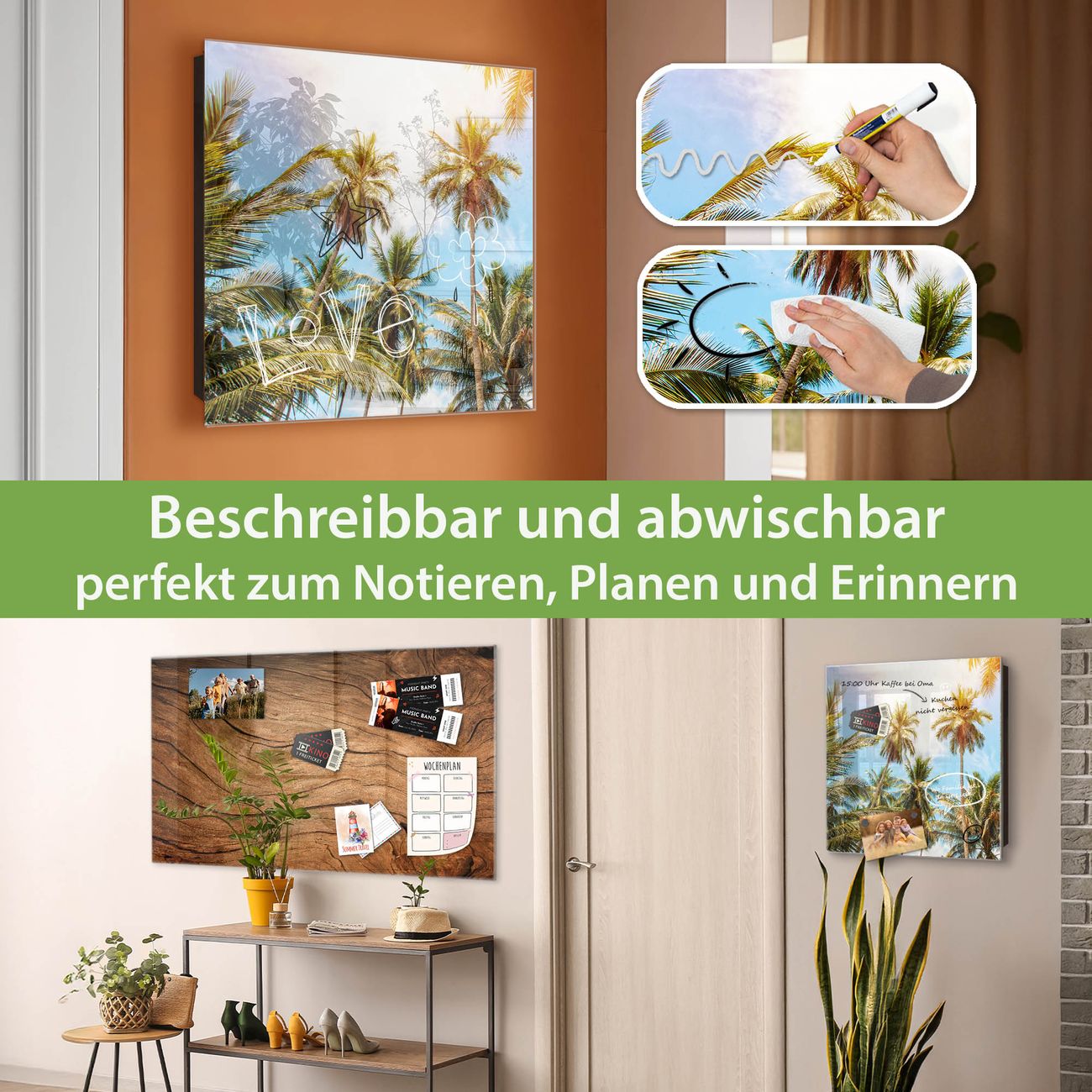 Bringe Ordnung und Eleganz in deinen Eingangsbereich mit dem banjado Schlüsselkasten Motiv Motiv Zwischen Palmen. Die moderne Schlüsselbox kombiniert funktionales Design mit hochwertiger Verarbeitung und wird so zu einem echten Hingucker in Flur, Büro oder Ferienwohnung. ✅ Stilvolle Schlüsselaufbewahrung mit Glasfront im Motiv Motiv Zwischen Palmen Der Design-Schlüsselkasten Motiv Motiv Zwischen Palmen bietet Platz für bis zu 50 Schlüssel, die auf 5 stabilen Reihen mit je 10 Haken übersichtlich verstaut werden. Mit seinen kompakten Maßen von 30 x 30 x 5 cm passt die Schlüsselbox perfekt auch in kleinere Räume. Der schwarz lackierte Stahlkorpus mit rechts angeschlagenem Türscharnier harmoniert mit der Glasfront und fügt sich nahtlos in jedes Wohnambiente ein. Ob als Schlüsselorganizer für Zuhause oder als praktische Lösung für Büros, Praxen und Gewerbe, der banjado Schlüsselkasten sorgt für Ordnung und Übersicht. Dank der magnetischen, mit Kreidestiften beschreibbaren Glasfront kannst du Notizen anheften oder Termine direkt auf der Oberfläche festhalten. Die Schlüsselbox Motiv Motiv Zwischen Palmen zur Wandmontage wird inklusive Befestigungsmaterial geliefert und ist schnell angebracht. So hast du deine Schlüssel jederzeit griffbereit und zugleich stilvoll verstaut. Mit diesem banjado Schlüsselkasten Motiv Motiv Zwischen Palmen kombinierst du praktische Aufbewahrung mit stilvollem Wohndesign. Ob privat oder geschäftlich, die Schlüsselbox sorgt für mehr Ordnung, Übersicht und ein wohnliches Ambiente.Vorteile im Überblick
