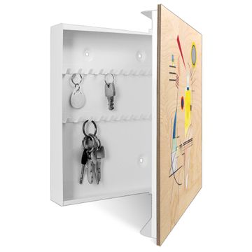Bringe Ordnung und Eleganz in deinen Eingangsbereich mit dem banjado Schlüsselkasten Motiv Motiv Abstrakte Komposition. Die moderne Schlüsselbox kombiniert funktionales Design mit hochwertiger Verarbeitung und wird so zu einem echten Hingucker in Flur, Büro oder Ferienwohnung. ✅ Stilvolle Schlüsselaufbewahrung mit moderner Holzfront im Motiv Motiv Abstrakte Komposition Der Design-Schlüsselkasten Motiv Motiv Abstrakte Komposition bietet Platz für bis zu 50 Schlüssel, die auf 5 stabilen Reihen mit je 10 Haken übersichtlich verstaut werden. Mit seinen kompakten Maßen von 30 x 30 x 5 cm passt die Schlüsselbox perfekt auch in kleinere Räume. Der weiß lackierte Korpus mit dem Scharnier auf der rechten Seite harmoniert mit der bedruckten Holzfront und fügt sich nahtlos in jedes Wohnambiente ein. Ob als Schlüsselorganizer für Zuhause oder als praktische Lösung für Büros, Praxen und Gewerbe - der banjado Schlüsselkasten sorgt für Ordnung und Übersicht. Durch die klare Strukturierung der Haken lassen sich auch viele Schlüssel problemlos verwalten. Die Schlüsselbox Motiv Motiv Abstrakte Komposition zur Wandmontage wird inklusive Befestigungsmaterial geliefert und ist schnell angebracht. So hast du deine Schlüssel jederzeit griffbereit und zugleich stilvoll verstaut. Mit diesem banjado Schlüsselkasten Motiv Motiv Abstrakte Komposition kombinierst du praktische Aufbewahrung mit stilvollem Wohndesign. Ob privat oder geschäftlich - die Schlüsselbox sorgt für mehr Ordnung, Übersicht und ein wohnliches Ambiente.Vorteile im Überblick