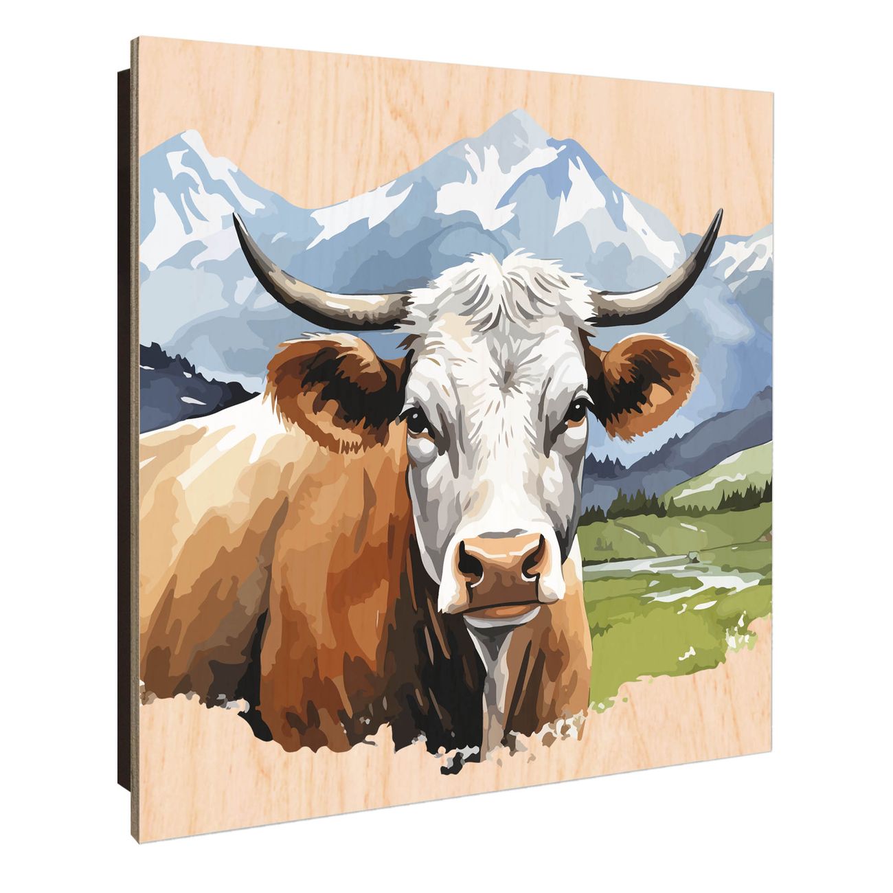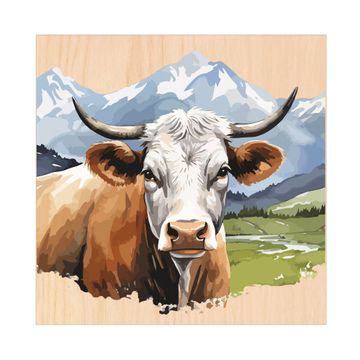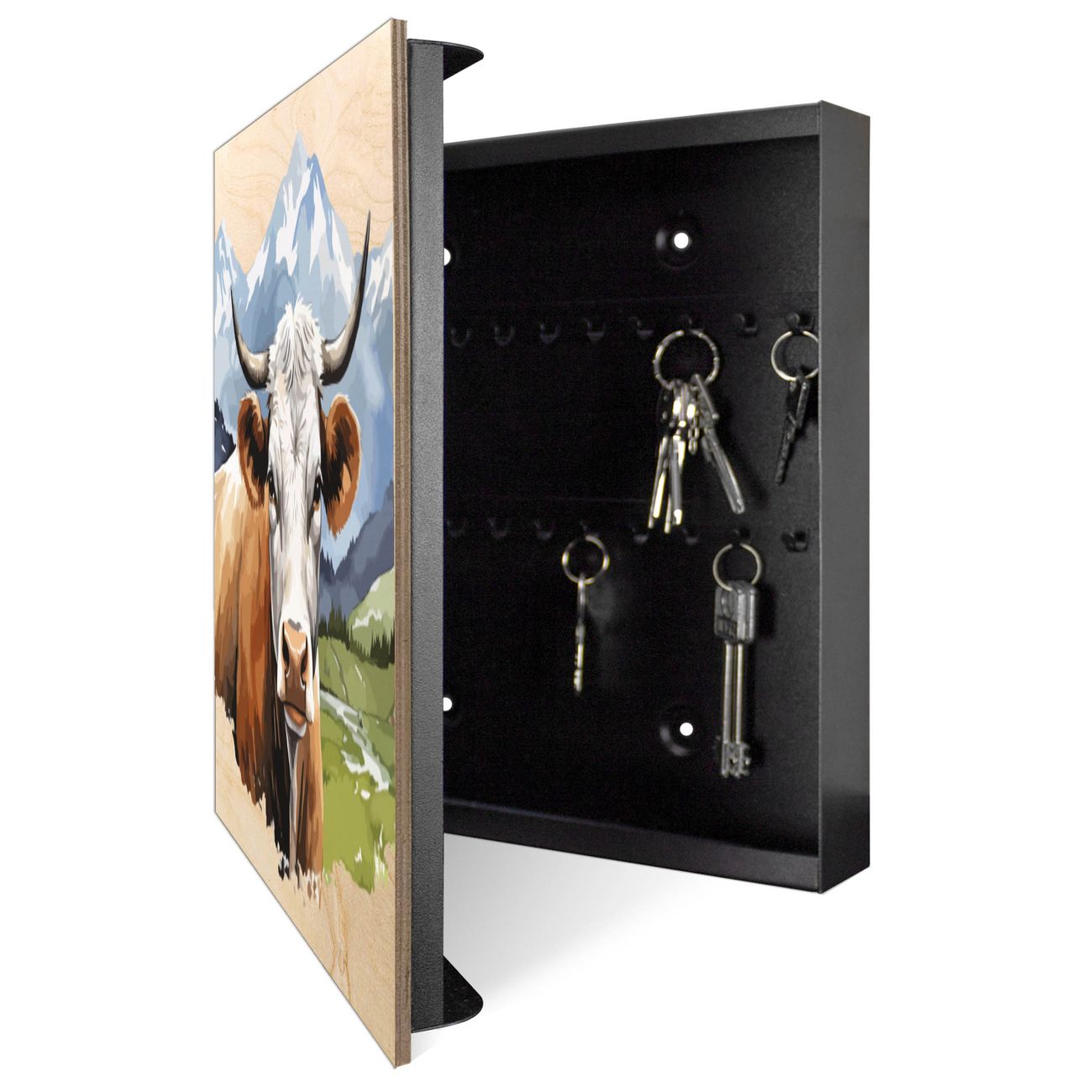 Schlüsselkasten mit Holzfront - Design Schlüsselbox Motiv Bergkuh in der Landschaft