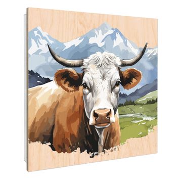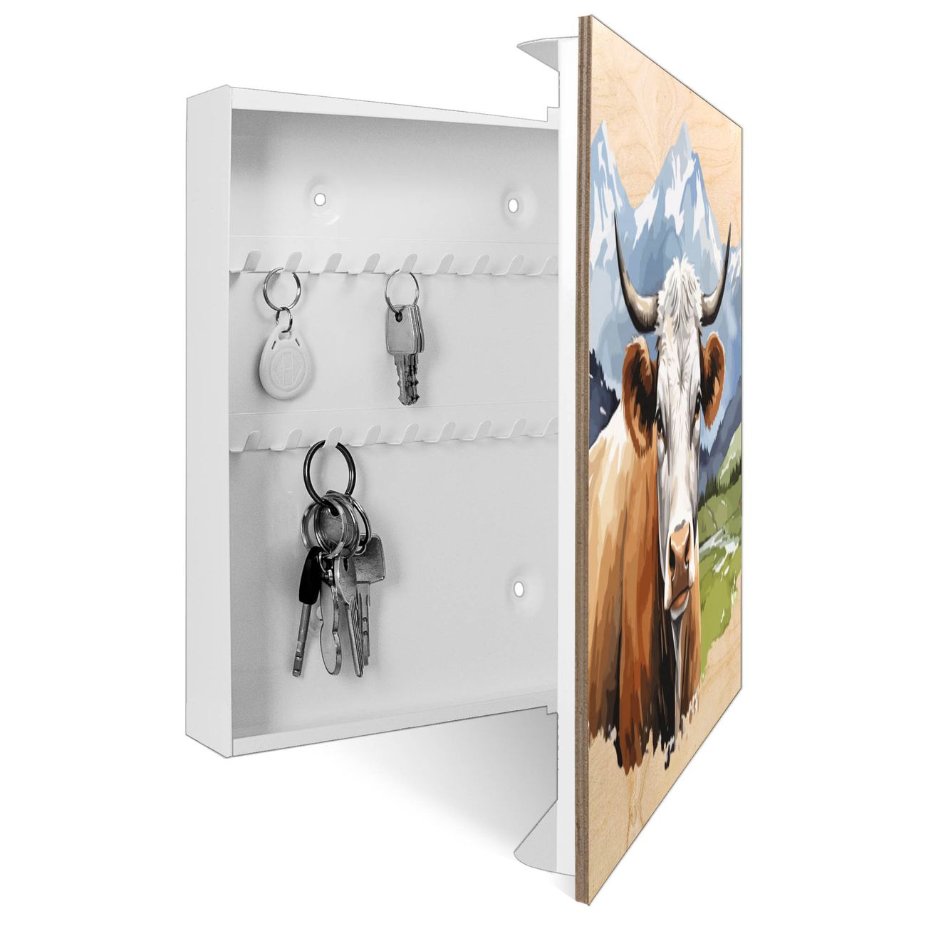 Schlüsselkasten mit Holzfront - Design Schlüsselbox Motiv Bergkuh in der Landschaft