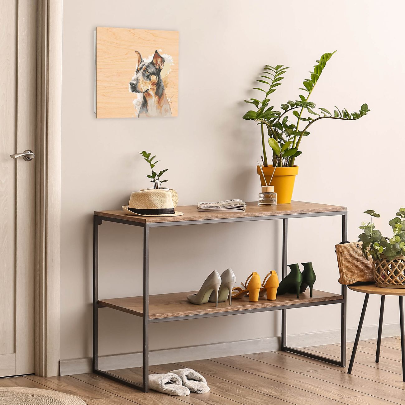 Bringe Ordnung und Eleganz in deinen Eingangsbereich mit dem banjado Schlüsselkasten Motiv Motiv Dobermann-Portrait. Die moderne Schlüsselbox kombiniert funktionales Design mit hochwertiger Verarbeitung und wird so zu einem echten Hingucker in Flur, Büro oder Ferienwohnung. ✅ Stilvolle Schlüsselaufbewahrung mit moderner Holzfront im Motiv Motiv Dobermann-Portrait Der Design-Schlüsselkasten Motiv Motiv Dobermann-Portrait bietet Platz für bis zu 50 Schlüssel, die auf 5 stabilen Reihen mit je 10 Haken übersichtlich verstaut werden. Mit seinen kompakten Maßen von 30 x 30 x 5 cm passt die Schlüsselbox perfekt auch in kleinere Räume. Der weiß lackierte Korpus mit dem Scharnier auf der rechten Seite harmoniert mit der bedruckten Holzfront und fügt sich nahtlos in jedes Wohnambiente ein. Ob als Schlüsselorganizer für Zuhause oder als praktische Lösung für Büros, Praxen und Gewerbe - der banjado Schlüsselkasten sorgt für Ordnung und Übersicht. Durch die klare Strukturierung der Haken lassen sich auch viele Schlüssel problemlos verwalten. Die Schlüsselbox Motiv Motiv Dobermann-Portrait zur Wandmontage wird inklusive Befestigungsmaterial geliefert und ist schnell angebracht. So hast du deine Schlüssel jederzeit griffbereit und zugleich stilvoll verstaut. Mit diesem banjado Schlüsselkasten Motiv Motiv Dobermann-Portrait kombinierst du praktische Aufbewahrung mit stilvollem Wohndesign. Ob privat oder geschäftlich - die Schlüsselbox sorgt für mehr Ordnung, Übersicht und ein wohnliches Ambiente.Vorteile im Überblick